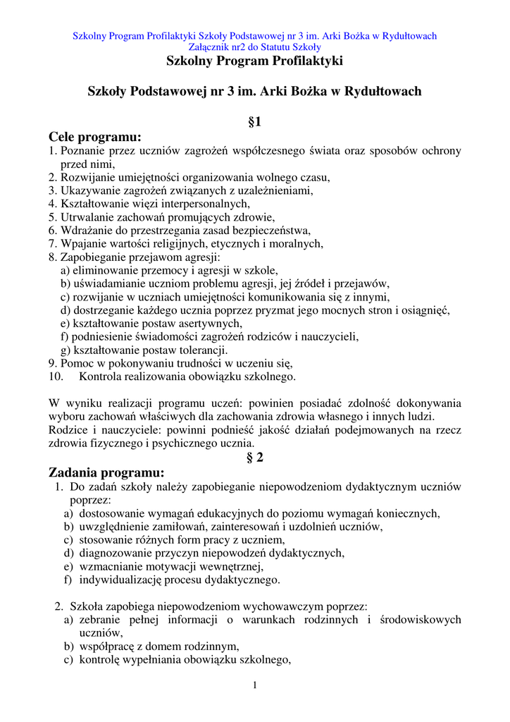 Szkolny Program Profilaktyki Szkoły Podstawowej nr 3 im. Arki Bożka w Rydułtowach Załącznik nr2 do Statutu Szkoły Szkolny Program Profilaktyki Szkoły Podstawowej nr 3 im. Arki Bożka w Rydułtowach §1 Cele programu: 1. Poznanie przez uczniów zagrożeń współczesnego świata oraz sposobów ochrony przed nimi, 2. Rozwijanie umiejętności organizowania wolnego czasu, 3. Ukazywanie zagrożeń związanych z uzależnieniami, 4. Kształtowanie więzi interpersonalnych, 5. Utrwalanie zachowań promujących zdrowie, 6. Wdrażanie do przestrzegania zasad bezpieczeństwa, 7. Wpajanie wartości religijnych, etycznych i moralnych, 8. Zapobieganie przejawom agresji: a) eliminowanie przemocy i agresji w szkole, b) uświadamianie uczniom problemu agresji, jej źródeł i przejawów, c) rozwijanie w uczniach umiejętności komunikowania się z innymi, d) dostrzeganie każdego ucznia poprzez pryzmat jego mocnych stron i osiągnięć, e) kształtowanie postaw asertywnych, f) podniesienie świadomości zagrożeń rodziców i nauczycieli, g) kształtowanie postaw tolerancji. 9. Pomoc w pokonywaniu trudności w uczeniu się, 10. Kontrola realizowania obowiązku szkolnego. W wyniku realizacji programu uczeń: powinien posiadać zdolność dokonywania wyboru zachowań właściwych dla zachowania zdrowia własnego i innych ludzi. Rodzice i nauczyciele: powinni podnieść jakość działań podejmowanych na rzecz zdrowia fizycznego i psychicznego ucznia. §2 Zadania programu: 1. Do zadań szkoły należy zapobieganie niepowodzeniom dydaktycznym uczniów poprzez: a) dostosowanie wymagań edukacyjnych do poziomu wymagań koniecznych, b) uwzględnienie zamiłowań, zainteresowań i uzdolnień uczniów, c) stosowanie różnych form pracy z uczniem, d) diagnozowanie przyczyn niepowodzeń dydaktycznych, e) wzmacnianie motywacji wewnętrznej, f) indywidualizację procesu dydaktycznego. 2. Szkoła zapobiega niepowodzeniom wychowawczym poprzez: a) zebranie pełnej informacji o warunkach rodzinnych i środowiskowych uczniów, b) współpracę z domem rodzinnym, c) kontrolę wypełniania obowiązku szkolnego, 1 Szkolny Program Profilaktyki Szkoły Podstawowej nr 3 im. Arki Bożka w Rydułtowach Załącznik nr2 do Statutu Szkoły d) rozmowy indywidualne z uczniami, e) kształtowanie postaw asertywnych, f) organizowanie zajęć terapeutycznych. 3. W szkole prowadzi się profilaktykę uzależnień poprzez następujące zadania: a) realizację programów profilaktycznych z zakresu przeciwdziałania uzależnieniom, b) rozwijanie u uczniów poczucia własnej wartości, kontroli nad własnym życiem, umiejętności komunikacji interpersonalnej, osiągania celów oraz umiejętności podejmowania właściwych decyzji, c) dostarczanie uczniom i rodzicom informacji na temat uzależnień, d) współpracę z Komisją do Spraw Rozwiązywania Problemów Alkoholowych przy UM Rydułtowach 4. Szkoła realizuje zadania z zakresu profilaktyki zdrowia przez: a) systematyczne prowadzenie działalności z zakresu BHP i ppoż., b) propagowanie prozdrowotnego stylu życia poprzez aktywność fizyczną i umysłową oraz poprzez kontakt z przyrodą, c) poprawianie wydolności fizycznej poprzez udział w zajęciach sportowych i rekreacyjnych, d) organizowanie wycieczek turystycznych i rekreacyjnych, w tym wyjazdów uczniów klas III na Zieloną Szkołę. e) rozwijanie troski o dobre samopoczucie fizyczne, psychiczne i społeczne. 5. Szkoła stwarza uczniom warunki pobytu zapewniające bezpieczeństwo, ochronę przed przemocą, uzależnieniami, demoralizacją poprzez działalność wychowawczą i zapobiegawczą: a) właściwą ilość sal lekcyjnych i sali gimnastycznej, b) odpowiednio dostosowane korytarze i klatki schodowe c) systematyczne szkolenia uczniów w zakresie bezpiecznego zachowania się w szkole, podczas drogi do i ze szkoły, wycieczek szkolnych i zawodów – przeprowadzanie pogadanek, rozmów i szkoleń, d) organizację dyżurów nauczycielskich na boiskach i korytarzach szkolnych w czasie całego pobytu uczniów w szkole, e) współpracę ze strażą pożarną i policją, f) przeprowadzanie próbnych alarmów przeciwpożarowych, g) organizację zajęć wyciszających dla szczególnie agresywnych uczniów, h) zatrudnianie (w ramach posiadanych środków) osoby do przeprowadzania młodzieży przez ulicę Raciborską tzw. stopka, i) promocję zdrowego stylu życia, j) promocje zdrowia psychicznego, k) dbałość o bazę materialną szkoły. 6. W realizacji zadań z zakresu profilaktyki szkoła jest obowiązana do współpracy z rodzicami, poradnią psychologiczno – pedagogiczną, policją i sądem oraz innymi instytucjami. 2 Szkolny Program Profilaktyki Szkoły Podstawowej nr 3 im. Arki Bożka w Rydułtowach Załącznik nr2 do Statutu Szkoły §3 Obszary działań: OBSZAR POZIOM KLASY 1 - 3 PROGRAMY PROFILAKTYCZNE PROFILAKTYKA PROWADZONA LEKCJACH KSZTAŁCENIA KLASY 4 - 6 -„Odblaskowe pierwszaki” -„7 kroków” -bezpieczeństwo ruchu -„Drabina” drogowego -Scenariusze zajęć dla klas V i VI opracowane przez pedagoga szkolnego. -Według planu NA wychowawcy klasowego zgodnie z programem wychowawczym szkoły „Szkoła Tryumfu” DKW4014-22/1999 3 -Według planu wychowawcy klasowego zgodnie z programem wychowawczym szkoły „Szkoła Tryumfu” DKW4014-22/1999 Szkolny Program Profilaktyki Szkoły Podstawowej nr 3 im. Arki Bożka w Rydułtowach Załącznik nr2 do Statutu Szkoły obszary DZIAŁALNOŚĆ POZALEKCYJNA działania ☺Koła zainteresowań: - artystyczne: --teatralne, --taneczne, -- muzyczne, --plastyczne, - sportowe; --basen --gimnastyka korekcyjna -ekologiczne -przedmiotowe --języka polskiego -- „Młodych Twórców” --matematyki, --języka angielskiego, --języka niemieckiego, -inne --kółko integracji europejskiej --kółko regionalne. WSPÓŁPRACA Z RODZICAMI ☺notatki z rozmów rodzicami uczniów, ☺szkolenia rodziców na tematy ustalone na wywiadówkach, ☺wizyty domowe, ☺gazetki szkolne o char