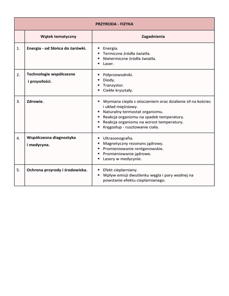 PRZYRODA - FIZYKA Wątek tematyczny Zagadnienia 1. Energia - od Słońca do żarówki. Energia. Termiczne źródła światła. Nietermiczne źródła światła. Laser. 2. Technologie współczesne Półprzewodniki. Diody. Tranzystor. Ciekłe kryształy. i przyszłości. 3. Zdrowie. Wymiana ciepła z otoczeniem oraz działanie sił na kościec i układ mięśniowy. Naturalny termostat organizmu. Reakcja organizmu na spadek temperatury. Reakcja organizmu na wzrost temperatury. Kręgosłup - rusztowanie ciała. 4. Współczesna diagnostyka i medycyna. 5. Ochrona przyrody i środowiska. Ultrasonografia. Magnetyczny rezonans jądrowy. Promieniowanie rentgenowskie. Promieniowanie jądrowe. Lasery w medycynie. Efekt cieplarniany. Wpływ emisji dwutlenku węgla i pary wodnej na powstanie efektu cieplarnianego.
