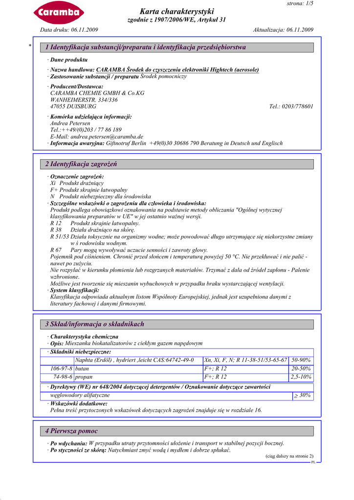 DR strona: 1/5 Karta charakterystyki zgodnie z 1907/2006/WE, Artykuł 31 Data druku: 06.11.2009 * Aktualizacja: 06.11.2009 1 Identyfikacja substancji/preparatu i identyfikacja przedsiębiorstwa · Dane produktu · Nazwa handlowa: CARAMBA Środek do czyszczenia elektroniki Hightech (aerosole) · Zastosowanie substancji / preparatu Środek pomocniczy · Producent/Dostawca: CARAMBA CHEMIE GMBH & Co.KG WANHEIMERSTR. 334/336 47055 DUISBURG Tel.: 0203/778601 · Komórka udzielająca informacji: Andrea Petersen Tel.:++49/(0)203 / 77 86 189 E-Mail: [email protected] · Informacja awaryjna: Giftnotruf Berlin +49(0)30 30686 790 Beratung in Deutsch und Englisch 2 Identyfikacja zagrożeń · Oznaczenie zagrożeń: Xi Produkt drażniący F+ Produkt skrajnie łatwopalny N Produkt niebezpieczny dla środowiska · Szczególne wskazówki o zagrożeniu dla człowieka i środowiska: Produkt podlega obowiązkowi oznakowania na podstawie metody obliczania "Ogólnej wytycznej klasyfikowania preparatów w UE" w jej ostatnio ważnej wersji. R 12 Produkt skrajnie łatwopalny. R 38 Działa drażniąco na skórę. R 51/53 Działa toksycznie na organizmy wodne; może powodować długo utrzymujące się niekorzystne zmiany w ś rodowisku wodnym. R 67 Pary mogą wywoływać uczucie senności i zawroty głowy. Pojemnik pod ciśnieniem. Chronić przed słońcem i temperaturą powyżej 50 °C. Nie przekłuwać i nie palić nawet po zużyciu. Nie rozpylać w kierunku płomienia lub rozgrzanych materiałów. Trzymać z dala od źródeł zapłonu - Palenie wzbronione. Możliwe jest tworzenie się mieszanin wybuchowych w przypadku braku wystarczającej wentylacji. · System klasyfikacji: Klasyfikacja odpowiada aktualnym listom Wspólnoty Europejskiej, jednak jest uzupełniona danymi z literatury fachowej i danymi firmowymi. 3 Skład/informacja o składnikach · Charakterystyka chemiczna · Opis: Mieszanka biokatalizatorów z ciekłym gazem napędowym · Składniki niebezpieczne: Naphta (Erdöl) , hydriert ,leicht CAS:64742-49-0 Xn, Xi, F, N; R 11-38-51/53-65-67 50-90% 106-97-8 butan F+; R 12 20-50% 74-98-6 propan F+; R 12 2,5-10% · Dyrektywy (WE) nr 648/2004 dotyczącej detergentów / Oznakowanie dotyczące zawartości węglowodory alifatyczne · Wskazówki dodatkowe: Pełna treść przytoczonych wskazówek dotyczących zagrożeń znajduje się w rozdziale 16. ≥ 30% 4 Pierwsza pomoc · Po wdychaniu: W przypadku utraty przytomności ułożenie i transport w stabilnej pozycji bocznej. · Po styczności ze skórą: Natychmiast zmyć wodą i mydłem i dobrze spłukać. (ciąg dalszy na stronie 2) PL DR strona: 2/5 Karta charakterystyki zgodnie z 1907/2006/WE, Artykuł 31 Data druku: 06.11.2009 Aktualizacja: 06.11.2009 Nazwa handlowa: CARAMBA Środek do czyszczenia elektroniki Hightech (aerosole) (ciąg dalszy od strony 1) · Po styczności z okiem: Płukać oczy z otwartą powieką przez kilka minut pod bieżącą wodą. W przypadku utrzymującej się dolegliwości zasięgnąć porady lekarza. · Po przełknięciu: Nie powodować wymiotów i sprowadzić lekarza. 5 Postępowanie w przypadku pożaru · Przydatne środki gaśnicze: CO2, proszek gaśniczy lub strumień wody. Większy pożar zwalczać strumieniem wody lub pianą odporną na działanie alkoholu. · Środki gaśnicze nieprzydatne ze względów bezpieczeństwa: Woda pełnym strumieniem · Specjalne wyposażenie ochronne: Środki specjalne nie są konieczne. 6 Postępowanie w przypadku niezamierzonego uwolnienia do środowiska · Środki ostrożności dostosowane do danej osoby: Nosić ubranie ochronne. Osoby nie zabezpieczone przenieść w bezpieczne miejsce. · Środki ochrony środowiska: W przypadku przedostania się do zbiorników wodnych lub kanalizacji zawiadomić właściwe władze. · Metoda oczyszczania/ wchłaniania: Zadbać o wystarczające przewietrzenie. 7 Postępowanie z substancją/preparatem i jej/jego magazynowanie · Sposób obchodzenia się: · Wskazówki dla bezpiecznego użytkowania: Zadbać o dobry nawiew /odsysanie w miejscu pracy. · Wskazówki dla ochrony przeciwpożarowej i przeciwwybuchowej: Mieć w pogotowiu przyrządy do ochrony dróg oddechowych. · Składowanie: · Wymagania w stosunku do pomieszczeń składowych i zbiorników: Przechowywać w chłodnym miejscu. Należy przestrzegać przepisy zarządzeń składowania zbiorników z gazem pod ciśnieniem. · Wskazówki odnośnie wspólnego składowania: Nie konieczne. · Dalsze wskazówki odnośnie warunków składowania: Składować w dobrze zamkniętych beczkach w chłodnym i suchym miejscu. 8 Kontrola narażenia i środki ochrony indywidualnej · Dodatkowe wskazówki dla wykonania urządzeń technicznych: Brak dalszych danych, patrz punkt 7. · Składniki wraz z kontrolowanymi wartościami granicznymi zależnymi od miejsca pracy: 124-38-9 carbon dioxide NDS (PL) NDSCh: 27000 mg/m3 NDS: 9000 mg/m3 · Wskazówki dodatkowe: Podstawą były aktualnie obowiązujące wykazy. · Osobiste wyposażenie ochronne: · Ogólne środki ochrony i higieny: Należy przestrzegać zwyczajne środki ostrożności przy obchodzeniu się z chemikaliami. Unikać styczności z oczami i skórą. · Ochrona dróg oddechowych: Przy niewystarczającej wentylacji ochrona dróg oddechowych. · Ochrona rąk: Rękawice / odporne na rozpuszczalniki · Materiał, z którego wykonane są rękawice Kauczuk nitrylowy · Czas penetracji dla materiału, z którego wykonane są rękawice Wartość przenikania: poziom ≥ 480 (ciąg dalszy na stronie 3) PL DR strona: 3/5 Karta charakterystyki zgodnie z 1907/2006/WE, Artykuł 31 Data druku: 06.11.2009 Aktualizacja: 06.11.2009 Nazwa handlowa: CARAMBA Środek do czyszczenia elektroniki Hightech (aerosole) (ciąg dalszy od strony 2) · Ochrona oczu: Okulary ochronne 9 Właściwości fizyczne i chemiczne · Ogólne dane Forma: Kolor: Zapach: Aerozol Przeźroczysty Jak rozpuszczalnik · Zmiana stanu Punkt topnienia/ Zakres topnienia: Nie jest określony. · Punkt zapłonu: -40°C (