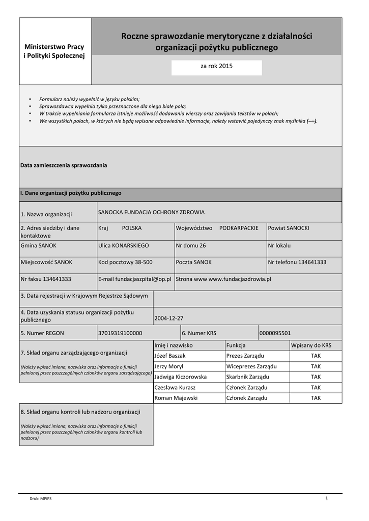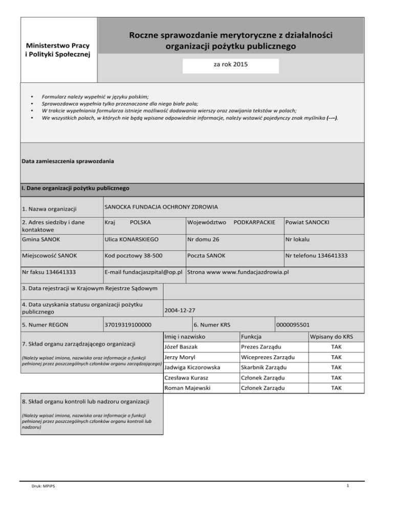 ZŽĐnjŶĞƐƉƌĂǁŽnjĚĂŶŝĞŵĞƌLJƚŽƌLJĐnjŶĞnjĚnjŝĂųĂůŶŽƑĐŝ ŽƌŐĂŶŝnjĂĐũŝƉŽǏLJƚŬƵƉƵďůŝĐnjŶĞŐŽ Ministerstwo Pracy ŝWŽůŝƚLJŬŝ^ƉŽųĞĐnjŶĞũ za rok 2015 • • • • &ŽƌŵƵůĂƌnjŶĂůĞǏLJǁLJƉĞųŶŝđǁũħnjLJŬƵƉŽůƐŬŝŵ͖ ^ƉƌĂǁŽnjĚĂǁĐĂǁLJƉĞųŶŝĂƚLJůŬŽƉƌnjĞnjŶĂĐnjŽŶĞĚůĂŶŝĞŐŽďŝĂųĞƉŽůĂ͖ tƚƌĂŬĐŝĞǁLJƉĞųŶŝĂŶŝĂĨŽƌŵƵůĂƌnjĂŝƐƚŶŝĞũĞŵŽǏůŝǁŽƑđĚŽĚĂǁĂŶŝĂǁŝĞƌƐnjLJŽƌĂnjnjĂǁŝũĂŶŝĂƚĞŬƐƚſǁǁƉŽůĂĐŚ͖ tĞǁƐnjLJƐƚŬŝĐŚƉŽůĂĐŚ͕ǁŬƚſƌLJĐŚŶŝĞďħĚČǁƉŝƐĂŶĞŽĚƉŽǁŝĞĚŶŝĞŝŶĨŽƌŵĂĐũĞ͕ŶĂůĞǏLJǁƐƚĂǁŝđƉŽũĞĚLJŶĐnjLJnjŶĂŬŵLJƑůŶŝŬĂ (--–). Data zamieszczenia sprawozdania /͘ĂŶĞŽƌŐĂŶŝnjĂĐũŝƉŽǏLJƚŬƵƉƵďůŝĐnjŶĞŐŽ 1. Nazwa organizacji SANOCKA FUNDACJA OCHRONY ZDROWIA 2. Adres siedziby i dane kontaktowe Kraj Gmina SANOK Ulica KONARSKIEGO Nr domu 26 Nr lokalu DŝĞũƐĐŽǁŽƑđ^EK< Kod pocztowy 38-500 Poczta SANOK Nr telefonu 134641333 Nr faksu 134641333 E-mail [email protected] Strona www www.fundacjazdrowia.pl POLSKA Województwo PODKARPACKIE Powiat SANOCKI ϯ͘ĂƚĂƌĞũĞƐƚƌĂĐũŝǁ<ƌĂũŽǁLJŵZĞũĞƐƚƌnjĞ^ČĚŽǁLJŵ ϰ͘ĂƚĂƵnjLJƐŬĂŶŝĂƐƚĂƚƵƐƵŽƌŐĂŶŝnjĂĐũŝƉŽǏLJƚŬƵ publicznego 5. Numer REGON 37019319100000 ϳ͘^ŬųĂĚŽƌŐĂŶƵnjĂƌnjČĚnjĂũČĐĞŐŽŽƌŐĂŶŝnjĂĐũŝ ;EĂůĞǏLJǁƉŝƐĂđŝŵŝŽŶĂ͕ŶĂnjǁŝƐŬĂŽƌĂnjŝŶĨŽƌŵĂĐũĞŽĨƵŶŬĐũŝ ƉĞųŶŝŽŶĞũƉƌnjĞnjƉŽƐnjĐnjĞŐſůŶLJĐŚĐnjųŽŶŬſǁŽƌŐĂŶƵnjĂƌnjČĚnjĂũČĐĞŐŽͿ 2004-12-27 6. Numer KRS 0000095501 /ŵŝħŝŶĂnjǁŝƐŬŽ Funkcja Wpisany do KRS Józef Baszak WƌĞnjĞƐĂƌnjČĚƵ TAK Jerzy Moryl tŝĐĞƉƌĞnjĞƐĂƌnjČĚƵ TAK Jadwiga Kiczorowska ^ŬĂƌďŶŝŬĂƌnjČĚƵ TAK njĞƐųĂǁĂ<ƵƌĂƐnj njųŽŶĞŬĂƌnjČĚƵ TAK Roman Majewski njųŽŶĞŬĂƌnjČĚƵ TAK ϴ͘^ŬųĂĚŽƌŐĂŶƵŬŽŶƚƌŽůŝůƵďŶĂĚnjŽƌƵŽƌŐĂŶŝnjĂĐũŝ ;EĂůĞǏLJǁƉŝƐĂđŝŵŝŽŶĂ͕ŶĂnjǁŝƐŬĂŽƌĂnjŝŶĨŽƌŵĂĐũĞŽĨƵŶŬĐũŝ ƉĞųŶŝŽŶĞũƉƌnjĞnjƉŽƐnjĐnjĞŐſůŶLJĐŚĐnjųŽŶŬſǁŽƌŐĂŶƵŬŽŶƚƌŽůŝůƵď nadzoru) Druk: MPiPS 1 9. Cele statutowe organizacji ;EĂůĞǏLJŽƉŝƐĂđĐĞůĞŶĂƉŽĚƐƚĂǁŝĞƐƚĂƚƵƚƵŽƌŐĂŶŝnjĂĐũŝͿ /ŵŝħŝŶĂnjǁŝƐŬŽ Funkcja Wpisany do KRS Andrzej Krzanowski WƌnjĞǁŽĚŶŝĐnjČĐLJZĂĚLJ Nadzorczej TAK Kazimierz Kot ĂƐƚħƉĐĂ WƌnjĞǁŽĚŶŝĐnjČĐĞŐŽZĂĚLJ Nadzorczej TAK Bartosz Markowicz njųŽŶĞŬZĂĚLJ Nadzorczej TAK Jan Kikta njųŽŶĞŬZĂĚLJ Nadzorczej TAK ďŝŐŶŝĞǁtƌŽŷƐŬŝ njųŽŶĞŬZĂĚLJ Nadzorczej TAK Joanna Klimkowska njųŽŶĞŬZĂĚLJ Nadzorczej TAK ŽǏĞŶĂ:ĂƐƚƌnjħďƐŬĂ njųŽŶĞŬZĂĚLJ Nadzorczej TAK 1. ochrona i promocja zdrowia, 2ĚnjŝĂųĂŶŝĂŶĂƌnjĞĐnjŽƐſďŶŝĞƉĞųŶŽƐƉƌĂǁŶLJĐŚ͕ 3͘ƉŽŵŽĐŽĨŝĂƌŽŵŬĂƚĂƐƚƌŽĨ͕ŬůħƐŬǏLJǁŝŽųŽǁLJĐŚ͕ŬŽŶĨůŝŬƚſǁnjďƌŽũŶLJĐŚŝ ǁŽũĞŶǁŬƌĂũƵŝnjĂŐƌĂŶŝĐČ͕ 4͘ƉŽŵŽĐƐƉŽųĞĐnjŶĂ͕ǁƚLJŵƉŽŵŽĐƌŽĚnjŝŶŽŵŝŽƐŽďŽŵǁƚƌƵĚŶĞũƐLJƚƵĂĐũŝ ǏLJĐŝŽǁĞũŽƌĂnjǁLJƌſǁŶLJǁĂŶŝĞƐnjĂŶƐƚLJĐŚƌŽĚnjŝŶŝŽƐſď͕ 5͘ĚnjŝĂųĂŶŝĂŶĂƌnjĞĐnjŝŶƚĞŐƌĂĐũŝĞƵƌŽƉĞũƐŬŝĞũŽƌĂnjƌŽnjǁŝũĂŶŝĂŬŽŶƚĂŬƚſǁŝ ǁƐƉſųƉƌĂĐLJŵŝħĚnjLJƐƉŽųĞĐnjĞŷƐƚǁĂŵŝ͘ - Fundacja realizuje swoje cele statutowe przy pomocy wszelkich prawnie ĚŽƉƵƐnjĐnjĂůŶLJĐŚĨŽƌŵĚnjŝĂųĂŶŝĂŵ͘ŝŶ͘ƉŽƉƌnjĞnj͗ 1͘ĨŝŶĂŶƐŽǁĂŶŝĞ͕ďČĚǍƵĐnjĞƐƚŶŝĐƚǁŽǁĨŝŶĂŶƐŽǁĂŶŝƵnjĂŬƵƉſǁƐƉƌnjħƚƵ 10. Sposób realizacji celów statutowych organizacji ŵĞĚLJĐnjŶĞŐŽĚůĂǁƐnjĞůŬŝĐŚƉůĂĐſǁĞŬnjĚƌŽǁŝĂnjŶĂũĚƵũČĐLJĐŚƐŝħŶĂƚĞƌĞŶŝĞ ĚnjŝĂųĂŶŝĂ&ƵŶĚĂĐũŝ͕ ;EĂůĞǏLJŽƉŝƐĂđƐƉŽƐſďƌĞĂůŝnjĂĐũŝĐĞůſǁƐƚĂƚƵƚŽǁLJĐŚŽƌŐĂŶŝnjĂĐũŝŶĂ 2͘ǁƐƉſųƉƌĂĐħnjǁƐnjĞůŬŝŵŝŝŶƐƚLJƚƵĐũĂŵŝ͕ǁƚLJŵƉůĂĐſǁŬĂŵŝnjĚƌŽǁŝĂ͕ ŬƚſƌLJĐŚĐĞůĞŽĚƉŽǁŝĂĚĂũČĐĞůŽŵ&ƵŶĚĂĐũŝ͕ podstawie statutu organizacji) 3͘ǁƐƉſųƉƌĂĐĂnjWŽůƐŬŝŵnjĞƌǁŽŶLJŵ<ƌnjLJǏĞŵŝDŝħĚnjLJŶĂƌŽĚŽǁLJŵ <ŽŵŝƚĞƚĞŵnjĞƌǁŽŶĞŐŽ<ƌnjLJǏĂ͕ 4͘ŽƌŐĂŶŝnjŽǁĂŶŝĞŝƉƌŽǁĂĚnjĞŶŝĞƐnjŬŽůĞŷ͕ƐĞŵŝŶĂƌŝſǁŝŬŽŶĨĞƌĞŶĐũŝ ŵĂũČĐLJĐŚŶĂĐĞůƵƵƉŽǁƐnjĞĐŚŶŝĞŶŝĞŝƉŽƉƵůĂƌLJnjĂĐũħŶŽǁŽĐnjĞƐŶLJĐŚŵĞƚŽĚ diagnostyki, leczenia i rehabilitacji, 5͘ǁƐnjĞĐŚƐƚƌŽŶŶČƉŽŵŽĐŽƐŽďŽŵƉŽƐnjŬŽĚŽǁĂŶLJŵǁǁLJƉĂĚŬĂĐŚ komunikacyjnych, 6͘ƉƌŽǁĂĚnjĞŶŝĞĚnjŝĂųĂůŶŽƑĐŝǁLJĚĂǁŶŝĐnjĞũŝƉƌŽŵŽĐLJũŶĞũ͘ //͘ŚĂƌĂŬƚĞƌLJƐƚLJŬĂĚnjŝĂųĂůŶŽƑĐŝŽƌŐĂŶŝnjĂĐũŝƉŽǏLJƚŬƵƉƵďůŝĐnjŶĞŐŽǁŽŬƌĞƐŝĞƐƉƌĂǁŽnjĚĂǁĐnjLJŵ ϭ͘KƉŝƐĚnjŝĂųĂůŶŽƑĐŝƉŽǏLJƚŬƵƉƵďůŝĐnjŶĞŐŽ ϭ͘ϭ͘KƉŝƐŐųſǁŶLJĐŚ ĚnjŝĂųĂŷƉŽĚũħƚLJĐŚ ƉƌnjĞnjŽƌŐĂŶŝnjĂĐũħ Druk: MPiPS 2 W 2015ƌŽŬƵŐųſǁŶLJŵŝnjĚĂƌnjĞŶŝĂŵŝ&ƵŶĚĂĐũŝŽĐŚĂƌĂŬƚĞƌnjĞƉƌĂǁŶŽͲĨŝŶĂŶƐŽǁLJŵďLJųŽƉƌnjLJƐƚŽƐŽǁĂŶŝĞ ŝƐƚŶŝĞũČĐLJĐŚKĚĚnjŝĂųſǁŝWŽƌĂĚŶŝ^ƉĞĐũĂůŝƐƚLJĐnjŶLJĐŚ^WK^ĂŶŽŬĚŽŶŽƌŵǁLJŵĂŐĂŶLJĐŚƉƌnjĞƉŝƐĂŵŝh͘ WŽŶĂĚƚŽ&ƵŶĚĂĐũĂĚŽŬŽŶĂųĂnjĂŬƵƉƵƐƉƌnjħƚƵŵĞĚLJĐnjŶĞŐŽŶĂƉŽƐnjĐnjĞŐſůŶĞŽĚĚnj͘ƐnjƉŝƚĂůŶĞ͘ ƚĞŐŽƚLJƚƵųƵǁ2015ƌŽŬƵŽĚĚĂŶŽƉŽƌĞŵŽŶĐŝĞŽƌĂnjƐĨ