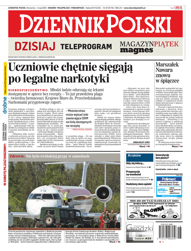 CZWARTEK–PIĄTEK, 30 kwietnia – 1 maja 2009 | KRAKÓW • MAŁOPOLSKA • PODKARPACIE | Nakład 110 752 EGZ. | Nr 101 (19 719) | ROK LXV | www.dziennikpolski24.pl | DZISIAJ Cena 1,80 ZŁ (W TYM 7% VAT) TELEPROGRAM Marszałek Nawara znowu w śpiączce Uczniowie chętnie sięgają po legalne narkotyki Młodzi ludzie odurzają się lekami dostępnymi w aptece bez recepty. – To już prawdziwa plaga – twierdzą farmaceuci. Krajowe Biuro ds. Przeciwdziałania Narkomanii przygotowuje raport. NIEBEZPIECZEŃSTWO. Uczennica jednego z krakowskich gimnazjów o specyficznym działaniu jednego z leków przeciwkaszlowych dowiedziała się z pracy magisterskiej swojej mamy. Postanowiła spróbować. Spodobało jej się, a swoimi doświadczeniami i – co gorsza – opakowaniami leku podzieliła się z kolegami ze szkoły. O sprawie dowiedziała się dyrekcja. – Odbyliśmy kilka rozmów z rodzicami uczennicy, ale zbagatelizowali problem. Sytuacja się powtórzyła, więc prawdopodobnie poinformujemy o tym odpowiednie służby, w tym policję – mówi dyrektor szkoły. Problem jednak w tym, że zakup tych specyfików jest całkowicie legalny. Wiele leków przeciwkaszlowych sprzedawanych jest w aptece bez recepty. Kosztują kilka złotych. Z ich nabyciem dzieciaki nie mają zwykle najmniejszego problemu.– Dowiedziałam się, że wśród gimnazjalistów sporą popularnością cieszy się lek o nazwie acodin – mówi pani Monika z Krakowa, mama trzynastolatki. – Wysłałam do apteki córkę, żeby sprawdzić, czy rzeczywiście będzie mogła kupić ten lek. Farmaceuta nie robił problemów. Aptekarze przyznają, że odurzanie się przez dzieci lekami – Ministerstwo może wpisać leki zawierające DXM na listę dostępnych na receptę – MÓWI MICHAŁ KIDAWA to prawdziwa plaga. – Nie ma dnia, żeby do apteki nie przyszedł dzieciak, prosząc o acodin czy inny lek o podobnym działaniu – mówi Marcin Pawlik, krakowski farmaceuta. – Są na- wet tacy, którzy przychodzą regularnie. Staram się wyłapywać takie osoby i nie sprzedawać im leków. Jednak nie wszyscy farmaceuci postępują podobnie, dlatego problemem już zainteresowało się Krajowe Biuro ds. Przeciwdziałania Narkomanii. Powstała tam nawet specjalna grupa robocza, która ma za zadanie przyjrzeć się substancji o nazwie dekstrometorfan (DXM), która wchodzi w skład wielu leków przeciwkaszlowych. Wkrótce ma też powstać raport na temat pozamedycznego stosowania tej substancji oraz jej niepożądanych działań. – Odurzanie się przez młodzież DXM to stosunkowo nowe zjawisko, dlatego chcemy dokładnie je zbadać – mówi Michał Kidawa z biura. – Nasz raport prześlemy do Ministerstwa Zdrowia, a jedną z form reakcji resortu może być wpisanie leków z DXM na listę dostępnych na receptę. Cztery lata temu biuro interweniowało w sprawie syropu tussipect, zawierającego efedrynę, który cieszył się ogromną popularnością wśród uczniów i studentów. Od ubiegłego roku tussipect jest dostępny na receptę. – Ograniczenie sprzedaży jednego leku zawsze powoduje, że dzieci szybko odkrywają coś nowego – przyznaje Jerzy Fijałkiewicz, dyrektor Towarzystwa Zapobiegania Narkomanii. – Mimo wszystko trzeba ograniczać dzieciom możliwość dostępu do tych leków. ANNA KOLET–ICIEK [email protected] Więcej ► A6 Kraków Zdrowie. Nie było świńskiej grypy w samolocie Gdy się kłócą... Awantura w Radzie Miasta. ► B1 Marszałek małopolski był operowany we wtorek po południu w Klinice Neurochirurgii i Neurotraumatologii Szpitala Uniwersyteckiego w Krakowie. Jego stan jest bardzo poważny, ale stabilny. Co najmniej do soboty będzie utrzymywany w śpiączce farmakologicznej. Decyzja o operacji była konsultowana z lekarzem, który przez ponad dwa miesiące prowadził leczenie marszałka w klinice w Klagenfurcie. Szpital Uniwersytecki nie podaje żadnych informacji. – Komunikat w tej sprawie wydamy w najbliższy poniedziałek – mówi jedynie Anna Niedźwiedzka, rzeczniczka szpitala. Pracownicy oddziału mają zakaz udzielania dziennikarzom jakichkolwiek informacji, wzmocniono ochronę szpitala (m.in. drzwi do oddziału intensywnej terapii pilnuje ochrona). W sobotę ma zostać wykonana tomografia komputerowa. Więcej ► A4 Inwestycje bez planu? Potrzebna jest wizja, jak nasze miasto będzie się rozwijało; czy jest plan inwestycji drogowych. ► B3 Czytaj także – www.e–dp.pl Propozycje na weekend REKLAMA Gdzie można się wybrać na majówkę w Krakowie i okolicach? ► B2 Rodzinny dom opieki Powstał pierwszy rodzinny dom pomocy społecznej dla starszych osób. ► B2 1150909 1150909a 0800-400-400 TAXI BARBAKAN 19661 FOT. ANNA KACZMARZ Tylko u nas 1273 ogłoszenia drobne REDAKTORZY WYDANIA: MAREK LOVELL i MAREK DŁUGOPOLSKI Trzech pasażerów rejsowego samolotu z Madrytu przebadano wczoraj na lotnisku w Balicach pod kątem występowania wirusa świńskiej grypy. – Pilot nie informował nas o podejrzeniu grypy u któregoś z pasażerów, ale zdecydowaliśmy się na wszelki wypadek zbadać tych, którzy byli w Meksyku – mówi Justyna Zajączkowska z Międzynaro- dowego Portu Lotniczego Kraków–Balice. Małgorzata Woźniak, rzeczniczka prasowa wojewody małopolskiego, przyznaje, że wczorajsza akcja w Balicach to trochę dmuchanie na zimne, ale dodaje, że w ten sposób sprawdzano, czy wszyscy są przygotowani do działań w przypadku rzeWięcej ► A6 czywistego zagrożenia. Czytaj str. A22 W 1