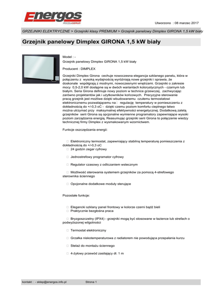 Utworzono : 08 marzec 2017 GRZEJNIKI ELEKTRYCZNE > Grzejniki klasy PREMIUM > Grzejnik panelowy Dimplex GIRONA 1,5 kW biały Grzejnik panelowy Dimplex GIRONA 1,5 kW biały Model : Grzejnik panelowy Dimplex GIRONA 1,5 kW biały Producent : DIMPLEX Grzejniki Dimplex Girona cechuje nowoczesna elegancja szklanego panelu, która w połączeniu z wysoką wydajnością wyróżniają nowe grzejniki i sprawia, że doskonale współgrają z modnymi, nowoczesnymi wnętrzami. Grzejniki o zakresie mocy 0,5-2,0 kW dostępne są w dwóch wariantach kolorystycznych - czarnym lub białym. Seria Girona definiuje nowy poziom w technice grzewczej, zachwycając zarówno projektantów jak i użytkowników końcowych. Precyzyjne sterowanie pracą grzejnik jest możliwe dzięki wbudowanemu czułemu termostatowi elektronicznemu pozwalającemu na� regulację temperatury w pomieszczeniu z dokładnością do +/-0,3 oC - dzięki czemu poziom komfortu cieplnego łatwo można utrzymać przy maksymalnej efektywności energetycznej. Dodatkową zaletą grzejników serii Girona są opcjonalne wymienne programatory zapewniające wysoki poziom zarządzania energią. Reasumując grzejniki serii Girona to połączenie wiedzy technicznej firmy Dimplex z wysmakowanym wzornictwem. Funkcje oszczędzania energii: � Elektroniczny termostat, zapewniający stabilną temperaturę pomieszczenia z dokładnością do +/-0,3 oC � 24 godzin zegar cyfrowy � Jednostrefowy programator cyfrowy � Regulator czasowy z odliczaniem wstecznym � Możliwość sterowania systemem grzejników za pomocą 4-strefowego sterownika ściennego � Opcjonalne dodatkowe moduły sterujące Pozostałe funkcje: � Elegancki szklany panel frontowy w kolorze czerni bądź bieli � Praktycznie bezgłośna praca � Bryzgoszczelny (IPX4) - grzejniki mogą być stosowane w łazience lub strefach o podwyższonej wilgotności � Termostat elektroniczny � Grzałka niskotemperaturowa z radiatorem nie powodująca przepalania kurzu � Stelaż do montażu ściennego � 4-żyłowy przewód zasilający dł. 1 m kontakt : - [email protected] Strona 1 Utworzono : 08 marzec 2017 GRZEJNIKI ELEKTRYCZNE > Grzejniki klasy PREMIUM > Grzejnik panelowy Dimplex GIRONA 1,5 kW biały Grzejnik panelowy Dimplex GIRONA 1,5 kW biały Dane techniczne: Producent � Dimplex - 3 lata gwarancji Pomiar temperatur � Termostat elektroniczny Napięcie znamionowe � 230 V~ 50/60 Hz Moc grzewcza [kW] � 1,5 Wymiary : szer. x wys. x gł. [mm] � 770 x 565 x 107 Waga [kg] � 20 Kolor � biały Masz wątpliwości? Chcesz wiedzieć więcej? Czekamy na Twoje pytania. Napisz lub zadzwoń. kontakt : - [email protected] Strona 2 Utworzono : 08 marzec 2017 GRZEJNIKI ELEKTRYCZNE > Grzejniki klasy PREMIUM > Grzejnik panelowy Dimplex GIRONA 1,5 kW biały Grzejnik panelowy Dimplex GIRONA 1,5 kW biały kontakt : - [email protected] Strona 3 Utworzono : 08 marzec 2017 GRZEJNIKI ELEKTRYCZNE > Grzejniki klasy PREMIUM > Grzejnik panelowy Dimplex GIRONA 1,5 kW biały Grzejnik panelowy Dimplex GIRONA 1,5 kW biały Cena : 1.051,00 zł Brutto ( 854,47 zł Netto) Dostępność: Produkt dostępny w naszym sklepie od 18 maj 2011 kontakt : - [email protected] Strona 4