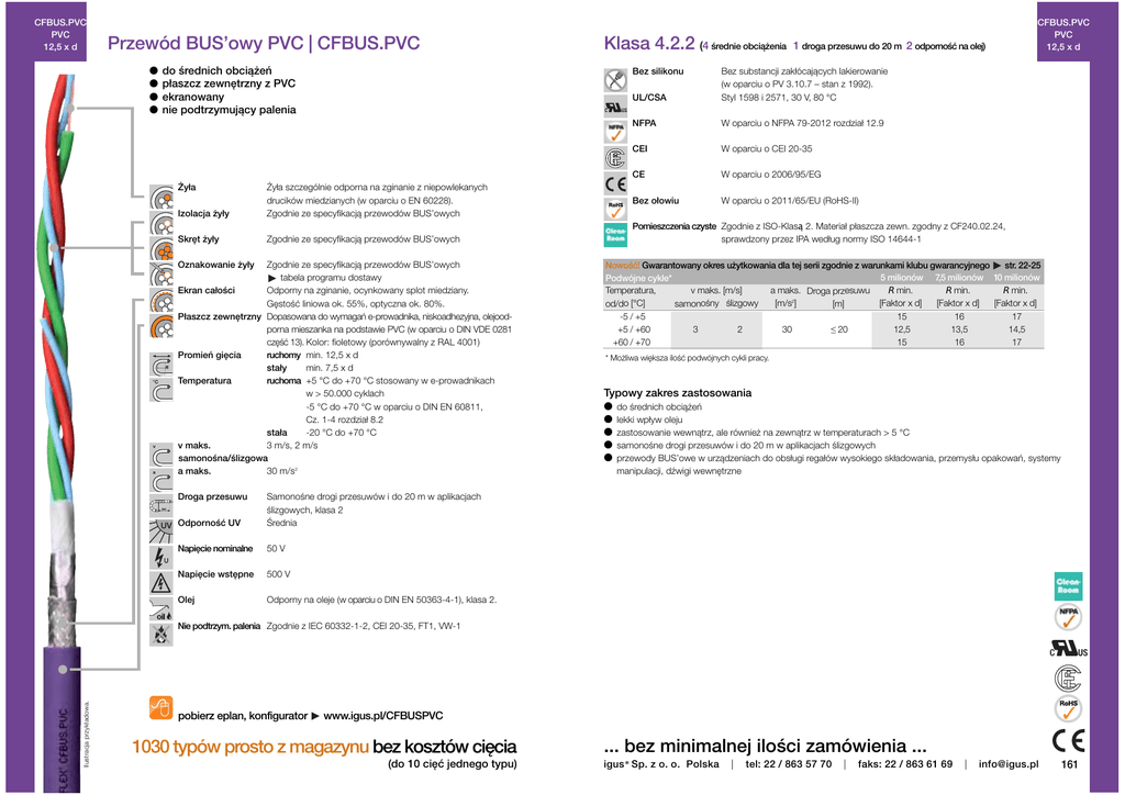 CFBUS.PVC PVC 12,5 x d Przewód BUS’owy PVC | CFBUS.PVC l l l l do średnich obciążeń płaszcz zewnętrzny z PVC ekranowany nie podtrzymujący palenia Żyła Bez silikonu Izolacja żyły Żyła szczególnie odporna na zginanie z niepowlekanych drucików miedzianych (w oparciu o EN 60228). Zgodnie ze specyfikacją przewodów BUS’owych Skręt żyły Zgodnie ze specyfikacją przewodów BUS’owych Oznakowanie żyły Zgodnie ze specyfikacją przewodów BUS’owych tabela programu dostawy Ekran całości Odporny na zginanie, ocynkowany splot miedziany. Gęstość liniowa ok. 55%, optyczna ok. 80%. Płaszcz zewnętrzny Dopasowana do wymagań e-prowadnika, niskoadhezyjna, olejoodporna mieszanka na podstawie PVC (w oparciu o DIN VDE 0281 część 13). Kolor: fioletowy (porównywalny z RAL 4001) Promień gięcia ruchomy min. 12,5 x d stały min. 7,5 x d Temperatura ruchoma +5 °C do +70 °C stosowany w e-prowadnikach w > 50.000 cyklach -5 °C do +70 °C w oparciu o DIN EN 60811, Cz. 1-4 rozdział 8.2 stała -20 °C do +70 °C v maks. 3 m/s, 2 m/s samonośna/ślizgowa a maks. 30 m/s2 Droga przesuwu Klasa 4.2.2 (4 średnie obciążenia Odporność UV Samonośne drogi przesuwów i do 20 m w aplikacjach ślizgowych, klasa 2 Średnia Napięcie nominalne 50 V Napięcie wstępne 500 V Olej Odporny na oleje (w oparciu o DIN EN 50363-4-1), klasa 2. 1 droga przesuwu do 20 m 2 odporność na olej) UL/CSA Bez substancji zakłócających lakierowanie (w oparciu o PV 3.10.7 – stan z 1992). Styl 1598 i 2571, 30 V, 80 °C NFPA W oparciu o NFPA 79-2012 rozdział 12.9 CEI W oparciu o CEI 20-35 CE W oparciu o 2006/95/EG Bez ołowiu W oparciu o 2011/65/EU (RoHS-II) CFBUS.PVC PVC 12,5 x d Pomieszczenia czyste Zgodnie z ISO-Klasą 2. Materiał płaszcza zewn. zgodny z CF240.02.24, sprawdzony przez IPA według normy ISO 14644-1 Nowość! Gwarantowany okres użytkowania dla tej serii zgodnie z warunkami klubu gwarancyjnego str. 22-25 5 milionów 7,5 milionów 10 milionów Podwójne cykle* R min. R min. R min. a maks. Droga przesuwu v maks. [m/s] Temperatura, [m/s2] [Faktor x d] [Faktor x d] [Faktor x d] od/do [°C] samonośny ślizgowy [m] 17 16 15 -5 / +5 14,5 13,5 12,5 ≤ 20 30 3 2 +5 / +60 17 16 15 +60 / +70 * Możliwa większa ilość podwójnych cykli pracy. Typowy zakres zastosowania l do średnich obciążeń l lekki wpływ oleju l zastosowanie wewnątrz, ale również na zewnątrz w temperaturach > 5 °C l samonośne drogi przesuwów i do 20 m w aplikacjach ślizgowych l przewody BUS’owe w urządzeniach do obsługi regałów wysokiego składowania, przemysłu opakowań, systemy manipulacji, dźwigi wewnętrzne Ilustracja przykładowa. Nie podtrzym. palenia Zgodnie z IEC 60332-1-2, CEI 20-35, FT1, VW-1 pobierz eplan, konfigurator www.igus.pl/CFBUSPVC 1030 typów prosto z magazynu bez kosztów cięcia (do 10 cięć jednego typu) ... bez minimalnej ilości zamówienia ... igus® Sp. z o. o. Polska | tel: 22 / 863 57 70 | faks: 22 / 863 61 69 | [email protected] 161 CFBUS.PVC PVC 12,5 x d Przewód BUS’owy PVC | CFBUS.PVC Klasa 4.2.2 (4 średnie obciążenia 2 droga przesuwu do 20 m 2 odporność na olej) CFBUS.PVC PVC 12,5 x d Ilustracja przykładowa. Program dostaw Nr art. Ilość żył i przekrój nominalny żył [mm2] Profibus CFBUS.PVC.001 CAN-Bus CFBUS.PVC.021 CFBUS.PVC.022 (2) Ethernet/CAT5/GigE CFBUS.PVC.040 (2) CFBUS.PVC.045 Ethernet/CAT6 CFBUS.PVC.050 Indeks Ciężar miedziowy [kg/km] [kg/km] 27 77 (2x0,5)C (4x0,5)C 8,5 8,5 33 46 87 97 (4x0,25)C (4x(2x0,15))C 6,5 7,5 30 35 69 69 4x(2x0,20)C 9,5 69 124 Ethernet/CAT6 CFBUS.PVC.050 (2x(2x0,15)C+2x0,38)C 9,0 62 99 FireWire CFBUS.PVC.056 7,0 35 69 7,0 41 67 (2x(2xAWG28)+2x(2xAWG28)C)C Impedancja falowa ok. [ Ω] Profibus CFBUS.PVC.001 CAN-Bus CFBUS.PVC.021 CFBUS.PVC.022 (2) Ethernet/CAT5/GigE CFBUS.PVC.040 (2) CFBUS.PVC.045 8,5 (4x0,38)C (2/16) Program dostaw Nr art. (2x0,25)C A FireWire IEEE 1394b CFBUS.PVC.056 Profinet CFBUS.PVC.060 USB 3.0 CFBUS.PVC.068 Średnica zewnętrzna maks. [mm] Profinet CFBUS.PVC.060 USB 3.0 CFBUS.PVC.068 16) Kolor płaszcza zewnętrznego: zielonożółty (porównywalny z RAL 6018) Oznakowane gwiazdką (2) typy przewodów chainflex ® bazują na pęczkach zbudowanych każdorazowo z 4 żył. Wskazówka: Podane średnice zewnętrzne są wartościami maksymalnymi i w rzeczywistości mogą mieć niższe wartości. G = z przewodem uziemiającym zielono-żółtym x = bez przewodu uziemiającego Kod koloru 150 (2x0,25)C 120 120 (2x0,5)C (4x0,5)C 100 100 (4x0,25)C (4x(2x0,15))C czerwony, zielony 100 4x(2x0,20)C biały/zielony, biały/pomarańczowy, biały/niebieski biały/brązowy 100 (2x(2x0,15)C 2x0,38 pomarańczowy/niebieski, niebieski/czerwony czarny, biały 100 (4x0,38)C 90 2x(2xAWG28) 2x(2xAWG28)C biały, brązowy biały , zielony, brązowy, żółty (pęczki skręcone z 4 żył) biały , zielony, brązowy, żółty (pęczki skręcone z 4 żył) białozielony/zielony, białopomarańczowy/pomar., białonieb./nieb., białobrązowy/brązowy A (2/16) Przykład zamówienia: Przewód CFBUS.PVC zł Grupa żył biały, pomarańczowy, niebieski, żółty(pęczkiskręconez4żył) czerwony/czarny zielony/białozielony niebieski/ żółty, czerwony/fioletowy CFBUS.PVC.001 – w wymaganej długości (0,5 m) chainflex .001 kod przewodu BUS’owego ® Przykład obliczenia dla 4 m CFBUS.PVC.001 : 4 m x 11,00 PLN/m = 44,00 PLN Obliczanie dodatku miedziowego www.igus.pl/miedz Czas dostawy 24 godz. lub dziś. Czas dostawy oznacza czas do momentu wysyłki towaru. pobierz eplan, konfigurator www.igus.pl/CFBUSPVC 1030 typów prosto z magazynu 162 bez kosztów cięcia (do 10 cięć jednego typu) ... bez minimalnej ilości zamówienia ... igus ® Sp. z o. o. Polska | tel: 22 / 863 57 70 | faks: 22 / 863 61 69 | [email protected] 163