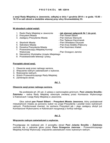 PROTOKÓŁ NR I/2014 z sesji Rady Miejskiej w Jaworznie, odbytej w dniu 1 grudnia 2014 r. w godz. 15.00 – 16.15 w sali obrad w siedzibie własnej przy ulicy Grunwaldzkiej 33. ________________________________________________________________________ W obradach udział wzięli: 1. Radni Rady Miejskiej w Jaworznie 2. Prezydent Miasta 3. Zastępcy Prezydenta Miasta - jak stanowi załącznik Nr 1 do prot. - Pan Paweł Silbert - Pan Dariusz Starzycki - Pan Tadeusz Kaczmarek - Pani Wiesława Osuszek - Pani Ewa Sidełko-Paleczny - Pan Kazimierz Kielski 4. 5. 6. 7. Skarbnik Miasta Sekretarz Miasta Doradca Prezydenta Miasta Przewodniczący Miejskiej Komisji Wyborczej - Pan Grzegorz Jamróz 8. Naczelnicy Wydziałów Urzędu Miejskiego 9. Przedstawiciele telewizji i prasy. Porządek obrad sesji. 1. 2. 3. 4. 5. Otwarcie sesji przez radnego seniora. Wręczenie radnym zaświadczeń o wyborze. Ślubowanie radnych. Wybór Przewodniczącego Rady Miejskiej. Zamknięcie obrad. Ad. 1. Otwarcie sesji przez radnego seniora. Na podstawie art. 20 ust. 2 ustawy o samorządzie gminnym, Pani Jolanta SmoliłoŻabińska – radna Rady Miejskiej otworzyła zwołaną przez Komisarza Wyborczego w Katowicach I sesję Rady Miejskiej w Jaworznie. Głos zabrał pan Paweł Silbert – Prezydent Miasta Jaworzna, który podziękował mieszkańcom miasta za ponowny wybór na urząd Prezydenta i powitał nowo wybranych radnych. Poinformował również, że zarówno Prezydent jak i Jego zastępcy złożyli już Komisarzowi Wyborczemu w Katowicach rezygnację z funkcji radnego. Ad. 2. Wręczenie radnym zaświadczeń o wyborze. Przystępując do realizacji pkt. 2 porządku obrad Pani Jolanta Smoliło – Żabińska zwróciła się o zabranie głosu przez Pana Grzegorza Jamroza - Przewodniczącego Miejskiej Komisji Wyborczej i wręczenie zaświadczeń nowo wybranym radnym. 2 Pan Grzegorz Jamróz zabierając głos wystąpił z krótkim przemówieniem, którego treść została ujęta w załączniku Nr 2 do protokołu a następnie wręczył zaświadczenia nowo wybranym radnym. Ad. 3. Ślubowanie radnych. Przewodnicząca obrad poinformowała wszystkich obecnych na sali, że stosownie do art. 23a ust. 1 ustawy o samorządzie gminnym przed przystąpieniem do wykonywania mandatu radni składają ślubowanie. Przypomniała również, że w związku z wyborem Pana Pawła Silberta na Prezydenta Miasta wygaśnięcie mandatu radnego następuje z mocy prawa z dniem wyboru na stanowisko Prezydenta Miasta – art. 383 par.1 pkt 6 Kodeksu Wyborczego. Stwierdzenie wygaśnięcia mandatu Pana Pawła Silberta nastąpi w drodze postanowienia Komisarza Wyborczego. Natomiast w odniesieniu do mandatów uzyskanych przez Pana Tadeusza Kaczmarka oraz Pana Dariusza Starzyckiego i powierzeniem im ponownie funkcji Zastępcy Prezydenta Miasta, wygaśniecie mandatu stwierdza Komisarz Wyborczy na podstawie pisemnego zrzeczenia się mandatu. Wobec tego Pan Paweł Silbert, Pan Tadeusz Kaczmarek i Pana Dariusz Starzycki nie będą składali ślubowania na radnego. Przystępując do ceremonii ślubowania radnych, Pani Jolanta Smoliło – Żabińska poinformowała zebranych, że po słowie „Ślubuję” każdy radny może dodatkowo wypowiedzieć formułę: „Tak mi dopomóż Bóg”. Zwróciła się również z prośbą do Pana Nikodema Motyki, najmłodszego wiekiem radnego o odczytywanie nazwisk radnych. Po odczytaniu przez Panią Jolantę Smoliło – Żabińską roty w brzmieniu: „Wierny Konstytucji i prawu Rzeczypospolitej Polskiej, ślubuję uroczyście obowiązki radnego sprawować godnie, rzetelnie i uczciwie, mając na względzie dobro mojej gminy i jej mieszkańców” wszyscy kolejno wywoływani radni złożyli ślubowanie. Ad. 4. Wybór Przewodniczącego Rady Miejskiej. Przewodnicząca obrad zwróciła uwagę radnym, że wybór ten następuje bezwzględną większością głosów w obecności co najmniej połowy ustawowego składu rady, w głosowaniu tajnym. Dla przeprowadzenia wyboru zaproponowała powołanie spośród radnych Komisji Skrutacyjnej w 3 osobowym składzie. W związku z powyższym zwróciła się o zgłaszanie kandydatów do Komisji Skrutacyjnej. 3 W powyższym temacie głos zabrali: Pani Anna Lichota – która zgłosiła kandydaturę Pana Dawida Domagalskiego. Kandydat wyraził zgodę na podjęcie pracy w Komisji. Pan Jerzy Nieużyła - który zgłosił kandydaturę Pana Sebastiana Pyci. Kandydat wyraził zgodę na podjęcie pracy w Komisji. Pan Paweł Bańkowski - który zgłosił kandydaturę Pani Renaty Chmielewskiej. Kandydatka wyraziła zgodę na podjęcie pracy w Komisji. W wyniku przeprowadzonego głosowania, Rada Miejska w Jaworznie jednogłośnie wybrała Komisję Skrutacyjną w składzie: 1. Pan Dawid Domagalski 2. Pan Sebastian Pycia 3. Pani Renata Chmielewska Przewodnicząca obrad poinformowała również zebranych, że Komisja wybierze ze swego grona Przewodniczącego Komisji Skrutacyjnej. Następnie Przewodnicząca obrad poprosiła o zgłaszanie kandydatów na Przewodniczącego Rady Miejskiej oraz ewentualnie o ich przedstawienie. Pani Anna Lichota – zabierając głos zgłosiła kandydaturę Pana Wiesława Więckowskiego, który wyraził zgodę na kandydowanie. Przewodnicząca obrad zarządziła tajne głosowanie. W związku z powyższym zwróciła się do Komisji Skrutacyjnej o przygotowanie kart do głosowania, urny wyborczej oraz zasad głosowania. Przewodnicząca obrad ogłosiła przerwę w obradach Po wznowieniu obrad Pan Dawid Domagalski – Przewodniczący Komisji Skrutacyjnej poinformował radnych, o fakcie przygotowania przez Komisję 20 kart do głosowania. Zwrócił uwagę radnym, iż na karcie obok nazwiska zostały umieszczone 2 kratki „za”, „przeciw”. Głosuje się poprzez postawienie znaku „x” w odpowiedniej kratce. Głos uznaje się za nieważny wtedy, gdy: • nie zostanie dokonane żadne skreślenie, • dokonano więcej niż jedno skreślenie, • postawiono inny znak niż „x”. Nadmie