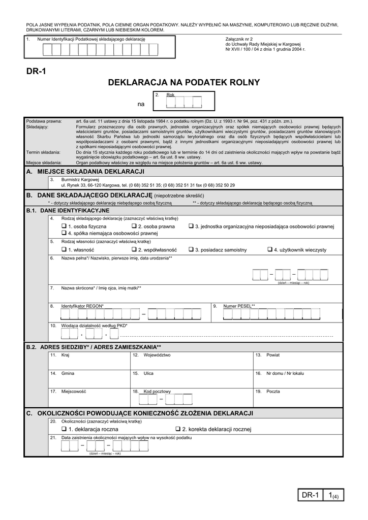 DR-1 DEKLARACJA NA PODATEK ROLNY