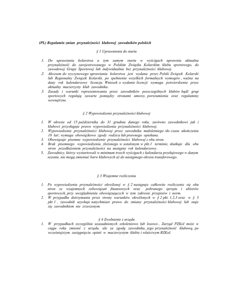 (PL) Regulamin zmian przynależności klubowej zawodników polskich § 1 Uprawnienia do startu Do uprawiania kolarstwa a tym samym startu w wyścigach uprawnia aktualna przynależność do zarejestrowanego w Polskim Związku Kolarskim klubu sportowego, do zawodowej Grupy Sportowej lub indywidualnie bez przynależności klubowej. Akcesem do wyczynowego uprawiania kolarstwa jest wydana przez Polski Związek Kolarski lub Regionalny Związek Kolarski, po spełnieniu wszelkich formalnych wymogów , ważna na dany rok kalendarzowy licencja. Wniosek o wydanie licencji wymaga potwierdzenia przez aktualny macierzysty klub zawodnika. Zasady i warunki reprezentowania przez zawodników poszczególnych klubów bądź grup sportowych regulują zawarte pomiędzy stronami umowy, porozumienia oraz regulaminy wewnętrzne. § 2 Wypowiedzenie przynależności klubowej 1. 2. 3. 4. 5. W okresie od 15 października do 31 grudnia danego roku, zarówno zawodnikowi jak i klubowi przysługuje prawo wypowiedzenia przynależności klubowej. Wypowiedzenie przynależności klubowej przez zawodnika małoletniego /do czasu ukończenia 18 lat/, wymaga obowiązkowo zgody rodzica lub prawnego opiekuna. Obowiązuje pisemne wypowiedzenie przynależności klubowej z obu stron. Brak pisemnego wypowiedzenia, złożonego w ustalonym w pkt.1 terminie, skutkuje dla obu stron przedłużeniem przynależności na następny rok kalendarzowy. Zawodnicy, którzy wystartowali w minimum trzech wyścigach z kalendarza przełajowego w danym sezonie, nie mogą zmieniać barw klubowych aż do następnego okresu transferowego. § 3 Wzajemne rozliczenia 1. Po wypowiedzeniu przynależności określonej w § 2 następuje całkowite rozliczenie się obu stron ze wzajemnych zobowiązań finansowych oraz pobranego sprzętu i ubiorów sportowych, przy uwzględnieniu obowiązujących w tym zakresie przepisów i norm. 2. W przypadku dotrzymania przez strony warunków określonych w § 2 pkt. 1,2,3 oraz w § 3 pkt 1 , zawodnik uzyskuje natychmiast prawo do zmiany przynależności klubowej lub staje się zawodnikiem nie zrzeszonym. 1. § 4 Zwolnienie z urzędu W przypadkach szczególnie uzasadnionych szkoleniowo lub losowo , Zarząd PZKol może w ciągu roku zmienić z urzędu, ale za zgodą zawodnika, jego przynależność klubową, po wcześniejszym zasięgnięciu opinii w macierzystym klubie i właściwym RZKol.