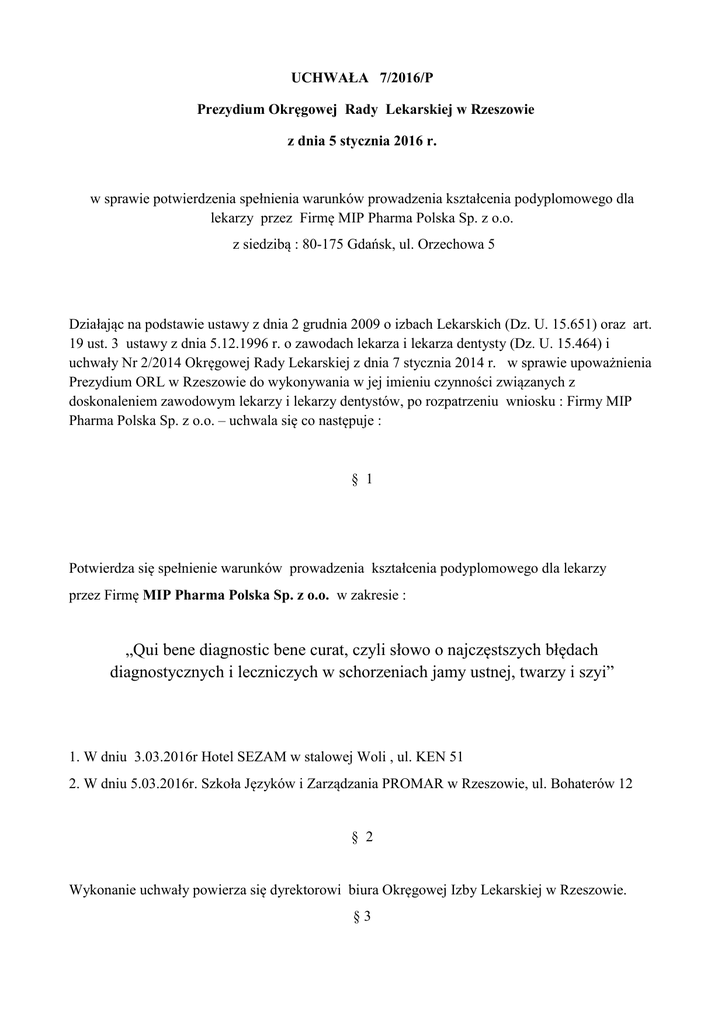 UCHWAŁA 7/2016/P Prezydium Okręgowej Rady Lekarskiej w Rzeszowie z dnia 5 stycznia 2016 r. w sprawie potwierdzenia spełnienia warunków prowadzenia kształcenia podyplomowego dla lekarzy przez Firmę MIP Pharma Polska Sp. z o.o. z siedzibą : 80-175 Gdańsk, ul. Orzechowa 5 Działając na podstawie ustawy z dnia 2 grudnia 2009 o izbach Lekarskich (Dz. U. 15.651) oraz art. 19 ust. 3 ustawy z dnia 5.12.1996 r. o zawodach lekarza i lekarza dentysty (Dz. U. 15.464) i uchwały Nr 2/2014 Okręgowej Rady Lekarskiej z dnia 7 stycznia 2014 r. w sprawie upoważnienia Prezydium ORL w Rzeszowie do wykonywania w jej imieniu czynności związanych z doskonaleniem zawodowym lekarzy i lekarzy dentystów, po rozpatrzeniu wniosku : Firmy MIP Pharma Polska Sp. z o.o. – uchwala się co następuje : § 1 Potwierdza się spełnienie warunków prowadzenia kształcenia podyplomowego dla lekarzy przez Firmę MIP Pharma Polska Sp. z o.o. w zakresie : „Qui bene diagnostic bene curat, czyli słowo o najczęstszych błędach diagnostycznych i leczniczych w schorzeniach jamy ustnej, twarzy i szyi” 1. W dniu 3.03.2016r Hotel SEZAM w stalowej Woli , ul. KEN 51 2. W dniu 5.03.2016r. Szkoła Języków i Zarządzania PROMAR w Rzeszowie, ul. Bohaterów 12 § 2 Wykonanie uchwały powierza się dyrektorowi biura Okręgowej Izby Lekarskiej w Rzeszowie. §3 Nadzór nad wykonaniem uchwały powierza się Komisji Kształcenia ORL w Rzeszowie. § 4 Uchwała wchodzi w życie z dniem podjęcia. UCHWAŁA 8/2016/P Prezydium Okręgowej Rady Lekarskiej w Rzeszowie z dnia 5 stycznia 2016 r. w sprawie wpisania do rejestru formy kształcenia przez podmiot wpisany do rejestru podmiotów prowadzących doskonalenie zawodowe lekarzy lub lekarzy dentystów Działając na podstawie art. 19 i art. 19c ust.1 ustawy z dnia 5 grudnia 1996 r o zawodach lekarza i lekarza dentysty (t.j. Dz. U.15.464), art. 107 ustawy z dnia 14 czerwca 1960 r. Kodeks postępowania administracyjnego (tekst jednolity Dz.U. Nr 98 z 2000r poz. 1071 z późn. zmianami) § 7 uchwały nr 104/05/IV Naczelnej Rady Lekarskiej z dnia 11 lutego 2005 r. w sprawie sposobu, warunków oraz trybu wpisu do rejestru okręgowej izby lekarskiej podmiotów prowadzących doskonalenie zawodowe lekarzy i lekarzy dentystów oraz zasad prowadzenia tego rejestru oraz akredytacji form doskonalenia zawodowego i uchwały Nr 2/2014 Okręgowej Rady Lekarskiej z dnia 7 stycznia 2014 r. w sprawie upoważnienia Prezydium ORL w Rzeszowie do wykonywania w jej imieniu czynności związanych z doskonaleniem zawodowym lekarzy i lekarzy dentystów po rozpatrzeniu wniosku złożonego przez przez podmiot Polskie Towarzystwo Patologów Oddział Podkarpacki uchwala się co następuje: §1 Podmiot o nazwie Polskie Towarzystwo Patologów Oddział Podkarpacki, mieszczący się pod adresem: 35-301 Rzeszów, ul. Lwowska 60, jest organizatorem szkolenia naukowego - „Czerniak – problemy diagnostyczne" na podstawie przedłożonego planu kształcenia przez osoby stanowiące kadrę dydaktyczną, prowadzonego we wskazanej bazie w sala wykładowa Zakładu Patomorfologii Klinicznego Szpitala Wojewódzkiego Nr 2, ul. Lwowska 60 w Rzeszowie w dniu 22 stycznia 2016r. § 2 Wydaje się zaświadczenie numer 64-000061-001-0020 o wpisie do rejestru podmiotów prowadzących doskonalenie zawodowe lekarzy i lekarzy dentystów Okręgowej Izby Lekarskiej w Rzeszowie o formie doskonalenia kształcenia o którym mowa w § 1 §3 1.Wnioskodawcy przysługuje prawo wniesienia odwołania od uchwały do Naczelnej Rady Lekarskiej za pośrednictwem Prezydium Okręgowej Rady Lekarskiej w Rzeszowie w terminie 14 dni od jej otrzymania. 2.Uchwała podlega wykonaniu z dniem podjęcia, jako w całości uwzględniająca wniosek. 3. Na podstawie art. 107 § 4 k.p.a. organ odstąpił od sporządzenia uzasadnienia uchwały jako uwzględniającej żądanie strony w całości. UCHWAŁA 9/2016/P Prezydium Okręgowej Rady Lekarskiej w Rzeszowie z dnia 5 stycznia 2016 r. w sprawie wpisania do rejestru formy kształcenia przez podmiot wpisany do rejestru podmiotów prowadzących doskonalenie zawodowe lekarzy lub lekarzy dentystów Działając na podstawie art. 19 i art. 19c ust.1 ustawy z dnia 5 grudnia 1996 r o zawodach lekarza i lekarza dentysty ( t.j. Dz. U.15.464.), art. 107 ustawy z dnia 14 czerwca 1960 r. Kodeks postępowania administracyjnego (tekst jednolity Dz.U. Nr 98 z 2000r poz. 1071 z późn. zmianami) § 7 uchwały nr 104/05/IV Naczelnej Rady Lekarskiej z dnia 11 lutego 2005 r. w sprawie sposobu, warunków oraz trybu wpisu do rejestru okręgowej izby lekarskiej podmiotów prowadzących doskonalenie zawodowe lekarzy i lekarzy dentystów oraz zasad prowadzenia tego rejestru oraz akredytacji form doskonalenia zawodowego i uchwały Nr 2/2014 Okręgowej Rady Lekarskiej z dnia 7 stycznia 2014 r. w sprawie upoważnienia Prezydium ORL w Rzeszowie do wykonywania w jej imieniu czynności związanych z doskonaleniem zawodowym lekarzy i lekarzy dentystów przez podmiot Oddział Podkarpacki Polskiego Towarzystwo Ortopedii i Traumatologii Narządu Ruchu uchwala się co następuje: §1 Podmiot o nazwie Polskie Towarzystwo Ortopedii i Traumatologii Narządu Ruch, mieszczący się pod adresem: 35-301 Rzeszów, ul. Lwowska 60, jest organizatorem Konferencji naukowo – szkoleniowej – XIV Bieszczadzka Konferencja Naukowa "Chirurgia kolana-zwyrodnienie i urazy sportowe" na podstawie przedłożonego planu kształcenia przez osoby stanowiące kadrę dydaktyczną, prowadzonego we wskazanej bazie w Szpital Specjalistyczny im. Świętej Rodziny w Rudnej Małej i KSW Hotel ATRIUM AMER-POL w Polańczyku w dniach 5-6 lutego 2016r. § 2 Wydaje się zaświadczenie numer 64-000015-001-0019 o wpisie do rejestru podmiotów prowadzących doskonalenie zawodowe lekarzy i lekarzy dentystów Okręgowej Izby Lekarskiej w Rzeszowie o formie doskonalenia kształcenia o którym mowa w § 1 §3 1.Wnioskodawcy przysługuje prawo wniesienia odwołania od uchwały do Naczelnej Rady 