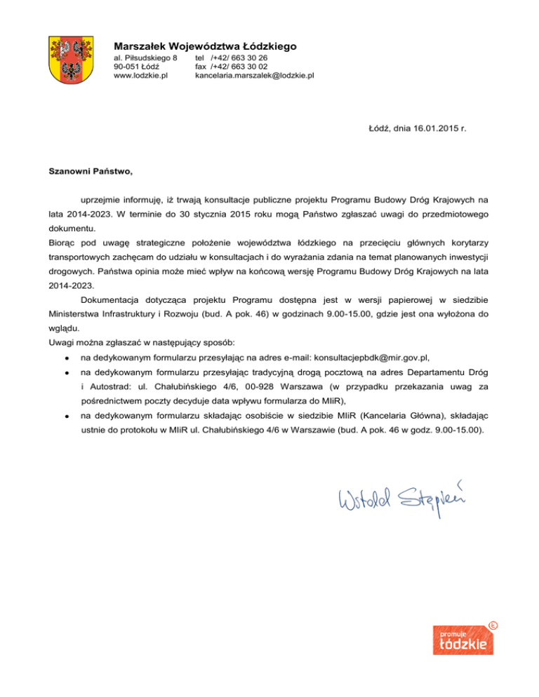 Marszałek Województwa Łódzkiego al. Piłsudskiego 8 90-051 Łódź www.lodzkie.pl tel /+42/ 663 30 26 fax /+42/ 663 30 02 [email protected] Łódź, dnia 16.01.2015 r. Szanowni Państwo, uprzejmie informuję, iż trwają konsultacje publiczne projektu Programu Budowy Dróg Krajowych na lata 2014-2023. W terminie do 30 stycznia 2015 roku mogą Państwo zgłaszać uwagi do przedmiotowego dokumentu. Biorąc pod uwagę strategiczne położenie województwa łódzkiego na przecięciu głównych korytarzy transportowych zachęcam do udziału w konsultacjach i do wyrażania zdania na temat planowanych inwestycji drogowych. Państwa opinia może mieć wpływ na końcową wersję Programu Budowy Dróg Krajowych na lata 2014-2023. Dokumentacja dotycząca projektu Programu dostępna jest w wersji papierowej w siedzibie Ministerstwa Infrastruktury i Rozwoju (bud. A pok. 46) w godzinach 9.00-15.00, gdzie jest ona wyłożona do wglądu. Uwagi można zgłaszać w następujący sposób: na dedykowanym formularzu przesyłając na adres e-mail: [email protected], na dedykowanym formularzu przesyłając tradycyjną drogą pocztową na adres Departamentu Dróg i Autostrad: ul. Chałubińskiego 4/6, 00-928 Warszawa (w przypadku przekazania uwag za pośrednictwem poczty decyduje data wpływu formularza do MIiR), na dedykowanym formularzu składając osobiście w siedzibie MIiR (Kancelaria Główna), składając ustnie do protokołu w MIiR ul. Chałubińskiego 4/6 w Warszawie (bud. A pok. 46 w godz. 9.00-15.00).