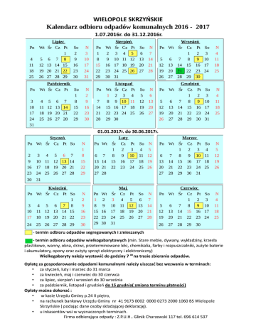 WIELOPOLE SKRZYŃSKIE Kalendarz odbioru odpadów komunalnych 2016 - 2017 1.07.2016r. do 31.12.2016r. So 2 9 16 23 30 N 3 10 17 24 31 Pn 1 8 15 22 29 Wt 2 9 16 23 30 Sierpień Śr Cz Pt So N 3 4 5 6 7 10 11 12 13 14 17 18 19 20 21 24 25 26 27 28 31 Październik Wt Śr Cz Pt So 1 4 5 6 7 8 11 12 13 14 15 18 19 20 21 22 25 26 27 28 29 N 2 9 16 23 30 Pn Wt 1 8 15 22 29 Listopad Śr Cz Pt 2 3 4 9 10 11 16 17 18 23 24 25 30 Pn Wt 4 11 18 25 5 12 19 26 Pn 3 10 17 24 31 Lipiec Śr Cz Pt 1 6 7 8 13 14 15 20 21 22 27 28 29 7 14 21 28 So N 5 6 12 13 19 20 26 27 Wrzesień Pn Wt Śr Cz Pt 1 2 5 6 7 8 9 12 13 14 15 16 19 20 21 22 23 26 27 28 29 30 Pn 5 12 19 26 Grudzień Wt Śr Cz Pt 1 2 6 7 8 9 13 14 15 16 20 21 22 23 27 28 29 30 So 3 10 17 24 N 4 11 18 25 So 3 10 17 24 31 N 4 11 18 25 So 4 11 18 25 N 5 12 19 26 So 3 10 17 24 N 4 11 18 25 01.01.2017r. do 30.06.2017r. Styczeń Pn Wt Śr Cz Pt So 2 9 16 23 3 4 5 6 10 11 12 13 17 18 19 20 24 25 26 27 30 31 7 14 21 28 N 1 8 15 22 29 Kwiecień Pn Wt Śr Cz Pt So 1 3 4 5 6 7 8 10 11 12 13 14 15 17 18 19 20 21 22 N 2 9 16 23 24 30 25 26 27 28 29 Pn Wt 6 13 20 27 Pn 1 8 15 22 29 7 14 21 28 Wt 2 9 16 23 30 Śr 1 8 15 22 Śr 3 10 17 24 31 Luty Cz 2 9 16 23 Maj Cz 4 11 18 25 Pt So N 3 4 5 10 11 12 17 18 19 24 25 26 Pt So N 5 6 7 12 13 14 19 20 21 26 27 28 Marzec Pn Wt Śr Cz Pt 1 2 3 6 7 8 9 10 13 14 15 16 17 20 21 22 23 24 27 28 29 30 31 Czerwiec Pn Wt Śr Cz Pt 1 2 5 6 7 8 9 12 13 14 15 16 19 20 21 22 23 26 27 28 29 30 - termin odbioru odpadów segregowanych i zmieszanych - termin odbioru odpadów wielkogabarytowych (min. Stare meble, dywany, wykładziny, krzesła plastikowe, wanny, okna, drzwi, przeterminowane leki, chemikalia, farby i rozpuszczalniki, zużyte baterie i akumulatory, opony oraz zużyty sprzęt elektryczny i elektroniczny) Wielkogabaryty należy wystawić do godziny 7 00 na trasie zbierania odpadów. Opłatę za gospodarowanie odpadami komunalnymi należy uiszczać bez wezwania w terminach: • za styczeń, luty i marzec do 31 marca • za kwiecień, maj i czerwiec do 30 czerwca • za lipiec, sierpień i wrzesień do 30 września • za październik, listopad i grudzień do 15 grudnia( zmiana terminu płatności) Opłaty można dokonać : • w kasie Urzędu Gminy p.24 II piętro, • na rachunek bankowy Urzędu Gminy nr 41 9173 0002 0000 0273 2000 1060 BS Wielopole Skrzyńskie ( podając dane osoby składającej deklarację). • u inkasentów wsi w wyznaczonych terminach. Firma odbierająca odpady : Z.P.U.H.. Glinik Charzewski 117 tel. 696 614 537 Apelujemy o właściwą segregację według zasad opisanych poniżej NALEŻY WRZUCAĆ 1) worek żółty – przeznaczony na tworzywa sztuczne: NIE WRZUCAMY ! - puste, zgniecione butelki plastikowe po różnych napojach typu PET, środkach czystości, kosmetykach, tzw. chemię gospodarczą - czystą folię, reklamówki, torebki z tworzyw sztucznych - skrzynki plastikowe, doniczki, wiadra - czyste kanistry plastikowe, - itp. - tworzyw piankowych, styropianu i naczyń jednorazowych styropianowych - opakowań po aerozolach - opakowań po środkach chwastobójczych - baterii oraz puszek po farbach - butelek i opakowań po olejach przemysłowych - zabawek oraz sprzętu AGD - plastikowych szyb z pleksy,- itp. 2) worek zielony– przeznaczony na szkło białe i kolorowe: NALEŻY WRZUCAĆ NIE WRZUCAMY ! - opakowania ze szkła białego i kolorowego bez - szkła okiennego zwykłego i zbrojonego, luster, nakrętek (słoiki, butelki po sokach, napojach) szyb samochodowych - opakowania szklane po kosmetykach - zniczy z woskiem, ceramiki, porcelany - inne opakowania szklane, - itp. - żarówek, świetlówek, termometrów - wyrobów ze szkła hartowanego,- itp. 3) worek czerwony– przeznaczony na metal: NALEŻY WRZUCAĆ NIE WRZUCAMY ! - zgniecione puszki aluminiowe po konserwach - puszek po farbach i lakierach oraz aerozolach i napojach, nakrętki i kapsle z resztkami zawartości - metalowe narzędzia, rury, druty i drobny złom - itp. - metalowe pokrywki, tacki i folie aluminiowe, 4) worek niebieski– przeznaczony na papier ,tekturę odzież i tekstylia, opakowania wielomateriałowe: NALEŻY WRZUCAĆ NIE WRZUCAMY ! - gazety i czasopisma - papieru z folią - prospekty, katalogi i reklamy, kalendarze - zabrudzonego, szczególnie zatłuszczonego - papierowe torby na zakupy papieru - zużyte zeszyty i stare książki - pieluch i innych artykułów higienicznych - kartony i tekturę - worków po cemencie - odpady wielomateriałowe (np.kartony po sokach - itp. i produktach mlecznych) - odzież i tekstylia (np.pościel, buty, koce) - odpady opakowaniowe ulegające biodegradacji 5) worek brązowy – przeznaczony na odpady kuchenne i odpady ogrodowe: NALEŻY WRZUCAĆ NIE WRZUCAMY ! - trawę, liście, drobne gałęzie, obierki warzyw, - nie wrzucamy pozostałych odpadów, które owoców, skorupki z jajek, zwiędłe kwiaty cięte, nadają się do odzysku i recyklingu doniczkowe, przeterminowaną żywność, - itp. trociny,- itp. 6) worek czarny - przeznaczony na odpady komunalne niesegregowanie (zmieszane): NALEŻY WRZUCAĆ - pozostałe odpady, które nie da się posegregować np. pampersy, zabrudzony tłusty papier, mocno zabrudzone opakowania, znicze, porcelana, zabawki,- itp. NIE WRZUCAMY ! - odpadów które należy gromadzić w pozostałych workach, a także: baterii, świetlówek, drobnego sprzętu elektrycznego i elektronicznego - itp. Nie będą wydawane worki czarne na śmieci zmieszane. W worki czarne należy zaopatrzyć się kupując w dowolnym sklepie (zwykłe worki bez oznaczenia firmy), naklejając na nich kod z napisem - ZMIESZANE. Worki oraz kody, które pozostały mieszkańcom są nadal aktualne (nie zmienia się przedsiębiorca odbierający odpady). Opłata za gospodarowanie odpadami komunalnymi nie ulega zmianie. 1. Kody z napisem - SEGREGOWANE do naklejania na worki kolorowe z odpadami posegregowanymi, 2. Kody z napisem – ZMIESZANE do naklejania na worki czarne z odpadami zmieszanymi, W przypadku br