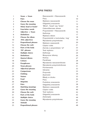 SPIS TREŚCI Rzeczownik + Rzeczownik Pary Wybierz rzeczownik Odgadnij znaczenie ‘Mind’, ‘head’ czy ‘brain’ Czteroliterowe słowa Przymiotnik + Rzeczownik Definicje Wybierz idiom Przymiotniki z końcówką ‘-ing’ Wyrażenia przyimkowe Wybierz czasownik Części ciała Zwroty z przyimkiem ‘of’ Test wyboru Definicje Muzyczne idiomy Kolory Parafraza Wyrażenia rzeczownikowe Wyrażenia przymiotnikowe Porównania Ubrania Przyroda Żywność Błędy w druku Pary Podobne znaczenia Odgadnij znaczenie Wybierz czasownik Części ciała Test wyboru Odgadnij znaczenie Zwierzęta Wyrażenia przyimkowe Przymiotniki i przysłówki Przymiotniki z końcówką ‘-ing’ Trzyliterowe słowa Prawda czy fałsz? Zwroty z przyimkiem ‘of’ Parafraza Przysłowia i powiedzenia Liczby Zwroty przymiotnikowe i przysłówkowe Przyroda Test wyboru Części ciała Odgadnij znaczenie Pary czasowników Ubrania Wyrażenia rzeczownikowe Dialogi z powiedzeniami Wyrażenia przyimkowe Błędy w druku Złożenia Zwierzęta i przyroda Zwroty z przyimkiem ‘of’ Rozmaite idiomy Definicje z czasownikami Podobne znaczenia Przymiotnik + rzeczownik Pomieszane litery Pary z przymiotnikami i przysłówkami Zwroty z przyimkiem ‘of’ Test wyboru Przysłowia i powiedzenia Parafraza Zwierzęta Imiona i nazwiska Przyroda Rysunki Definicje Dialogi Czteroliterowe słowa Zwroty z przyimkiem ‘of’ Wyrażenia przyimkowe Przysłowia i powiedzenia Wyrażenia przymiotnikowe Wybierz słowo Pomieszane litery Wybierz czasownik Części ciała Domino ze złożeniami Brakujące litery Wyrażenia przyimkowe Odgadnij znaczenie Przymiotnik + Rzeczownik Pary Przysłowia i powiedzenia Wybierz znaczenie Przymiotniki z końcówką ‘-ing’ Parafraza Test wyboru Błędy w druku Rozmaite zwroty Wyrażenia przyimkowe Przymiotnik + Rzeczownik Różne idiomy Części ciała Porównania Przysłowia i powiedzenia Definicje z czasownikami Przymiotniki i przysłówki Złożenia Rysunki Odpowiedzi do zadań Słowniczek idiomów