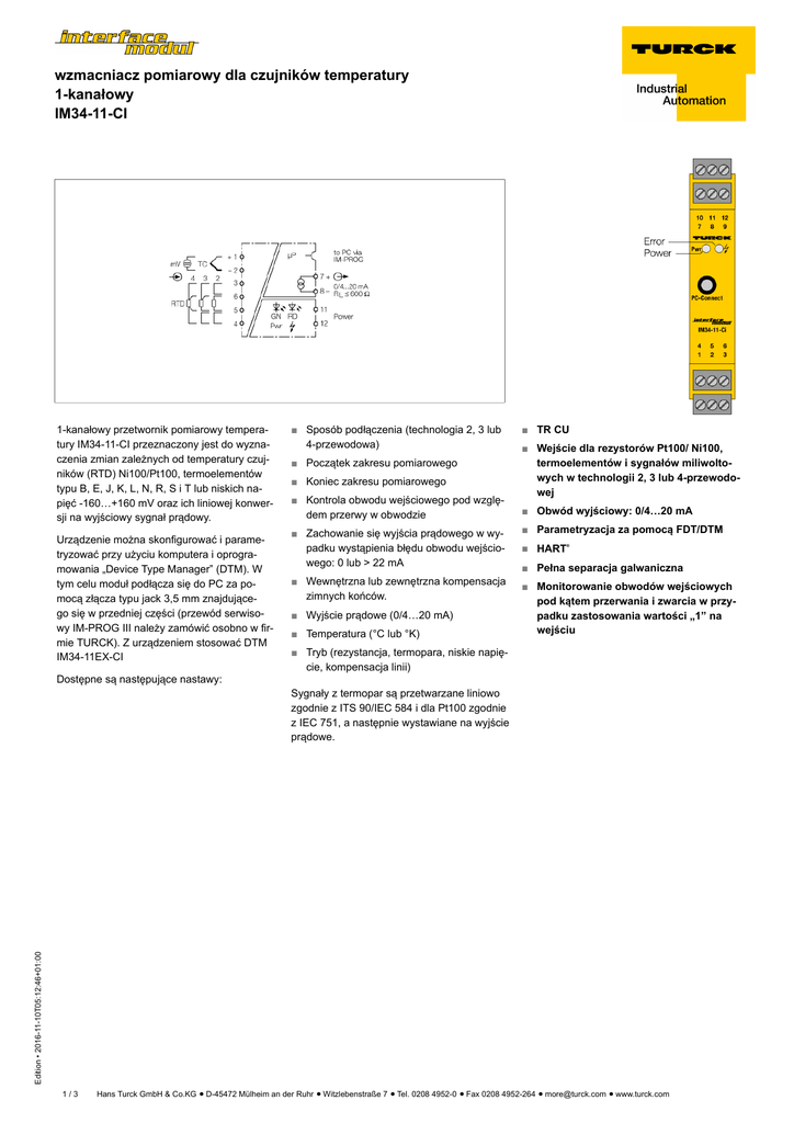 wzmacniacz pomiarowy dla czujników temperatury 1-kanałowy IM34-11-CI 1-kanałowy przetwornik pomiarowy temperatury IM34-11-CI przeznaczony jest do wyznaczenia zmian zależnych od temperatury czujników (RTD) Ni100/Pt100, termoelementów typu B, E, J, K, L, N, R, S i T lub niskich napięć -160…+160 mV oraz ich liniowej konwersji na wyjściowy sygnał prądowy. Urządzenie można skonfigurować i parametryzować przy użyciu komputera i oprogramowania „Device Type Manager” (DTM). W tym celu moduł podłącza się do PC za pomocą złącza typu jack 3,5 mm znajdującego się w przedniej części (przewód serwisowy IM-PROG III należy zamówić osobno w firmie TURCK). Z urządzeniem stosować DTM IM34-11EX-CI ■ Początek zakresu pomiarowego ■ Koniec zakresu pomiarowego ■ Kontrola obwodu wejściowego pod względem przerwy w obwodzie ■ TR CU ■ Wejście dla rezystorów Pt100/ Ni100, termoelementów i sygnałów miliwoltowych w technologii 2, 3 lub 4-przewodowej ■ Obwód wyjściowy: 0/4…20 mA ■ Zachowanie się wyjścia prądowego w wypadku wystąpienia błędu obwodu wejściowego: 0 lub > 22 mA ■ Parametryzacja za pomocą FDT/DTM ■ Wewnętrzna lub zewnętrzna kompensacja zimnych końców. ■ Monitorowanie obwodów wejściowych pod kątem przerwania i zwarcia w przypadku zastosowania wartości „1” na wejściu ■ Wyjście prądowe (0/4…20 mA) ■ Temperatura (°C lub °K) ■ HART ® ■ Pełna separacja galwaniczna ■ Tryb (rezystancja, termopara, niskie napięcie, kompensacja linii) Sygnały z termopar są przetwarzane liniowo zgodnie z ITS 90/IEC 584 i dla Pt100 zgodnie z IEC 751, a następnie wystawiane na wyjście prądowe. Edition • 2016-11-10T05:12:46+01:00 Dostępne są następujące nastawy: ■ Sposób podłączenia (technologia 2, 3 lub 4-przewodowa) 1/3 Hans Turck GmbH & Co.KG ñ D-45472 Mülheim an der Ruhr ñ Witzlebenstraße 7 ñ Tel. 0208 4952-0 ñ Fax 0208 4952-264 ñ [email protected] ñ www.turck.com wzmacniacz pomiarowy dla czujników temperatury 1-kanałowy IM34-11-CI IM34-11-CI 7506638 Napięcie nominalne Napięcie zasilania Częstotliwość Napięcie zasilania Pobór mocy Zasilanie uniwersalne 20…250 VAC 40…70 Hz 20…125 VDC ð3W Obwody wejściowe Wejście napięciowe Termopara Ni100 Pt100 sygnały mV (IEC 751), technologia 2, 3 i 4-przewodowa (DIN 43760), technologia 2, 3 i 4-przewodowa ð 0.2 mA B, E, J, K, N, R, S, T (ITS 90/IEC 584), L (DIN 43710) -0,160…+0,160 VDC Obwody wyjściowe Prąd wyjścia Rezystancja obciążenia, wyjście prądowe Prąd usterki 0/4…20 mA ð 0.6 kò ustawialne 0 / 22 mA Pt100 Ni100 Prąd sondy Termopary Rise time (10-90%) Dropout time (90…10%) Temperatura odniesienia Dokładność wyjścia prądowego Dryft temperaturowy wyjścia analogowego Dokładność wejścia RTD Dryft temperaturowy wejścia RTD Dokładność wejścia termopary Dryft temperaturowy wejścia TC Błąd kompensacji zimnych końców Edition • 2016-11-10T05:12:46+01:00 Dimensions Typ Nr kat. ð 1000 ms ð 1000 ms 23 °C ± 5 µA 0.0025 %/K ± 50 mò ± 3 mò/K ± 15 µV +/- 3.2 µV / K (z 320mV) 2-przewody < 100mò po kompensacji linii 3-przewody < 100mò z okablowaniem asymetrycznym 4-przewody < 50mò z kompensacją zimnych końców z IM-3-CJT < 1K Separacja galwaniczna Napięcie testowe 2,5 kV Wskazanie Gotowość do pracy Wskazanie błędu zielony czerwona Klasa ochrony Klasa palności zgodnie z UL 94 Temperatura pracy Temperatura składowania Wymiary Weight Instrukcja montażu Materiał obudowy Połączenie elektryczne IP20 V-0 -25 …+70 °C -40…+80 °C 104 x 18 x 110 mm 148 g Szyna DIN (NS35) lub panel poliwęglan/ABS 4 x 3-stykowe zdejmowalne terminale zaciskowe, zabezpieczenie przed odwrotną polaryzacją, połączenie śrubowe Przekrój zacisku 1 x 2,5 mm / 2 x 1,5 mm 0.5 Nm Moment dokręcający 2/3 2 2 Hans Turck GmbH & Co.KG ñ D-45472 Mülheim an der Ruhr ñ Witzlebenstraße 7 ñ Tel. 0208 4952-0 ñ Fax 0208 4952-264 ñ [email protected] ñ www.turck.com wzmacniacz pomiarowy dla czujników temperatury 1-kanałowy IM34-11-CI Akcesoria montażowe Typ Nr kat. IM-3-CJT 6900524 Rysunek wymiarowy Moduł kompensujący zimne końce w przetworniku temperaturowym IM 34; szerokość 18 mm IM-PROG III 7525111 Adapter programujący IM-PROG III stosowany jest w celu parametryzacji FDT/DTM urządzeń firmy TURCK serii IM. Ponadto IM-PROG III zapewnia separację galwaniczną. IM-CC-3X2BK/2BK 7541218 Terminale zaciskowe dla modułów serii IM (urządzenia Ex o szerokości 18 mm); zawierają: 4 szt. 3-polowego czarnego Edition • 2016-11-10T05:12:46+01:00 terminala 3/3 Hans Turck GmbH & Co.KG ñ D-45472 Mülheim an der Ruhr ñ Witzlebenstraße 7 ñ Tel. 0208 4952-0 ñ Fax 0208 4952-264 ñ [email protected] ñ www.turck.com