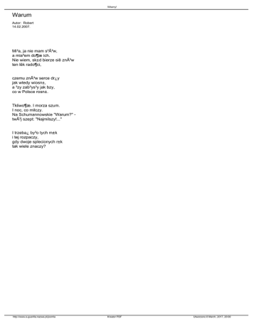 Witamy! Warum Autor: Robert 14.02.2007. Mi³a, ja nie mam s³Ã³w, a mia³em do¶æ ich. Nie wiem, sk±d bierze siê znów ten lêk rado¶ci, czemu znów serce dr¿y jak wtedy wiosn±, a ³zy zab³ys³y jak bzy, co w Polsce rosn±. Tkliwo¶æ. I morza szum. I noc, co milczy. Na Schumannowskie "Warum?" twój szept: "Najmilszy!..." I trzeba¿ by³o tych m±k i tej rozpaczy, gdy dwoje splecionych r±k tak wiele znaczy? http://www.e-guerilla.nazwa.pl/joomla Kreator PDF Utworzono 8 March, 2017, 20:00