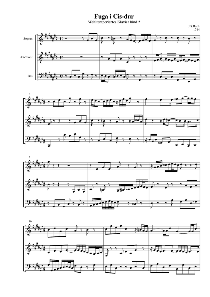 Fuga i Cis-dur Wohltemperiertes Klavier bind 2 Sopran Alt/Tenor Bas J.S.Bach 1744 #### ## c Ó & # ‰ œ œ œ œ ‰ n œ ‰ œ œ œ œ œ œ œ œj ‰ œ ‰ œ ‰ œ ‰ J J J J J #### ## c & # ‰ œ œ œ j ‰ j ‰ œ œ ∑ œœœ œœœœœœœ œœœœ ? #### ## c ‰ œ œ œ œ ‰ œ ‰ œ œ œ œ œ œ œ œ ‰ j ‰ J J # J œ ‰ œ œ œ œ œ œ œ #### ## ‰ œ œ œ œ ‰ œ ‰ œ œ œ œ œ œ œ ≈ œ œ œ œ ‰ œ J J J & # 4 œ. œ ‹œ œ œ œ œ # ## # & # # # œj ‰ Œ ? #### ## # œ j ‰ œ œ œ œ ‰ n œ ‰ œ ‰ ≈ œ ‹ œ œ œJ ‰ ≈ œ # œ œ œ œ œ . œ J J œ œ œ œ ‰ J ‰ ‰ œ œ œ œJ ‰ œ ‰ ≈ œ œ œ ‹ œ œ J œ œ œ œ #### ## œ ‰ Œ & # J Ó #### ## & # œJ ‰ Œ ‰ 7 ‰ œ œ œ j œ ‰ œj ‰ j‰ j‰ œœœœ œ #œ ‹œ œ œ œ œ œ œ nœ ? # # # # # # ‰ œ œj ‰ œj ‰ œ œ œ œ œ œ œ œ œ ‰ ‹ œj ‰ # œ J œ œ #### ## œ & # œ œ œ j œ ‰ œ ‰ J #### ## & # œœœœœ 10 œ œ œ œ œ ≈ œ œ œ ‹ œ œ œ œ œ œJ ‰ ‰ œJ j j œ ‰ œ ‰ ‰ œ œ œ œ ‰ ‰ œJ J œ œ œ ‹œ ≈ nœ œ œ œ œœœ œ œœœ j ‰ ‰ j œ œ ‰ ≈ œ œ œ œ. œ œ œ œ œ œ. œ œœ œœ œ œ œ œ œ ‰ ‰ œ œ œ œ œ œ œ œ œ ? #### ## œ œ œ œ œ œ œ œ œ ‰ œ œ œ œ J # œœ œ œ œ œ #### ## & # œ 13 œ œ œ #### ## & # ≈ œ œ œ œ. ? #### ## # œ œ œ ‹œ œ ‰ œ ‹œ œ ‹œ œ œ ‰ #œ #### ## œ œ œ & # œ. œ œ œ œ œ œ œ œ œ. 15 #### ## & # ‰ œ œ œ œ œ œ J œ ‰ ‰ œ œ œ ? # # # # # # œJ ‰ œ ‰ ‹ œ œ œ œ œ ‹ œ œ œ œ ‰ J J # œ J ‰ j ‰ Œ œ œ œ œ ‹œ Ÿ œ ‹œ œ œ œ œ ‹œ œ œ #œ j œ ‰ œ œ J #œ œ œ ‰ œ œ œ œ œ œ œ nœ œ œ œ #œ œ œ œ œ œ œ œ œ Œ Ó #### ## œ œ œ œ œ œ œ œ œ œ œ œ œ œ œ œ œ œ œ œ œ œ œ œ œ œ œ œ œ œJ & # 17 #### ## & # ˙ ? #### ## ‰ # œ œ œ #### ## j ‰ & # œ 19 #### ## & # œj ‰ œ J œ œ œ j œ œ œ. ˙ ‰ œ ≈ œ œ œ œ œ œ œ œ œ œ œ œ œ œ œ œ œ œ œ œ œ œ œ œ œ œ œ nœ œœœœ œ ? # # # # # # ≈ œ œ œ œ ‰ œj ‰ # J J.S.Bach: Fuga i Cis-dur (WK 2) Side 2 œ ≈œ œ œ œ ≈ œ ‰ œ ?œ œ ≈ œ œ œ œJ ‰ ‰ œ œ œ œ œ œ œ œ œ J j œ ‰ ‰ ‰ œ j œ #### ## & # œ. 21 ? #### ## # œ œ. œ œ œ ? #### ## # œ œ œ œ. œ œ œ œ #### ## & # œ œ œ œ. #### ## & # ≈ œj. ? #### ## œ n œ # #### ## œ & # 25 œ ≈ œ œ nœ ˙ œ œ œ œ œ œ œj ‰ n œ œ œ Œ œ œ œ œ œ œ œ j œ ‰ œ œ œ œ œ ## # & # ## # œ œ œ œ œ œ œ œ œ œ œ œ œ œ œ œ œ œ 27 œ ? #### ## # œ j œ œ œ J.S.Bach: Fuga i Cis-dur (WK 2) Side 3 ≈ œJ . œ œ œ œ œ œ & œ ≈ œ œ J œ œ œ œ œ ‹œ œ ‰ œ J ‰ œ œ œ œ œ œ œœ œ œ œ œ œ œ œ œ œ œj œ . œ œ œ œ œ œ œ œ ? #### ## ≈ œ œ œ # ‰ œ œ œ œ œ œ œ œ œœ œ œ œ œ œ œœœ ≈ œj. # ## # j & # ## œ ‰ #### ## & # œ œ œ œ #œ œ œ œ. œ œ œ œ œ nœ œ œ œ œ œ œ œ œ œ œ œ œ œ œ œ 23 œ œ œ œ œ œ œ œ œ œ œ ‰ j œ œ œ œ œ œ œ œœœ œ œ œ œ œ œ œ œ œ nœ œ œ œ œ nœ œ œ œ œ œ nœ œ œ œ œ œ œ œ œ w #### ## œ n œ œ œ n œ œ œ œ œ œ œœœ œ œ œ œ & # œ ‹œ 29 #### ## & # œ œ nœ œ ? #### ## w # #### ## œ & # 31 #### ## & # œ œ œ œ œ œ ˙ œ j j ‰ ‰ #œ ‹œ œ œ œ œœ J œ œœœ œ ‹ œ œ œ œ œ œ œ œ œ œœ ‹œ œ ‰ ‹ œj œ #œ œ œ œ œ œ nœ œ œ œ œ œ œ œ œ œ œ œ œ œ nœ œ œ œ œ ? #### ## # #### ## & # œ œ j œ . œ ≈ ? #### ## œ # œ œœ œ œ ‰ ® œ œ œ œ œ ? 32 ‰ ? #### ## # œ œ œ œ œ œ œ œ œ œ œ œ œ j ‹œ ®œ ‰ œ œ œ œ œ œ œ œ œ œ œ ‹œ œ #### ## & # 33 œ œ œœœ œ œ œ nœ œ œ œ œ œ œœ œ ? #### ## œ œ ‹ œ œ . # œ œ œ # œ œ œ œœœœœ # ? #### ## œ n œ œ # Œ œ ˙ ˙ J.S.Bach: Fuga i Cis-dur (WK 2) Side 4 ˙ w œ œ #œ œ œ œ œ œ œ U œœœ œœœœ œœœœ˙ U̇ œ œ ‰ ≈ œR œœœœœ œ w u œ U ˙