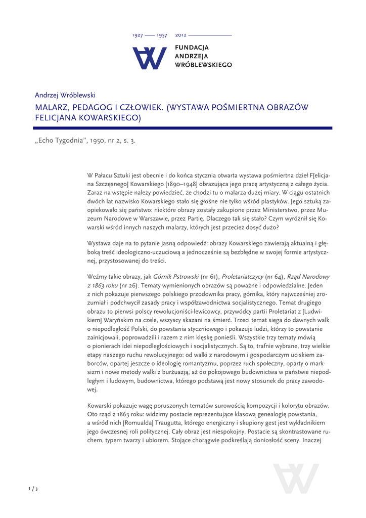 Andrzej Wróblewski MALARZ, PEDAGOG I CZŁOWIEK. (WYSTAWA POŚMIERTNA OBRAZÓW FELICJANA KOWARSKIEGO) „Echo Tygodnia”, 1950, nr 2, s. 3. W Pałacu Sztuki jest obecnie i do końca stycznia otwarta wystawa pośmiertna dzieł F[elicjana Szczęsnego] Kowarskiego [1890–1948] obrazująca jego pracę artystyczną z całego życia. Zaraz na wstępie należy powiedzieć, że chodzi tu o malarza dużej miary. W ciągu ostatnich dwóch lat nazwisko Kowarskiego stało się głośne nie tylko wśród plastyków. Jego sztuką zaopiekowało się państwo: niektóre obrazy zostały zakupione przez Ministerstwo, przez Muzeum Narodowe w Warszawie, przez Partię. Dlaczego tak się stało? Czym wyróżnił się Kowarski wśród innych naszych malarzy, których jest przecież dosyć dużo? Wystawa daje na to pytanie jasną odpowiedź: obrazy Kowarskiego zawierają aktualną i głęboką treść ideologiczno-uczuciową a jednocześnie są bezbłędne w swojej formie artystycznej, przystosowanej do treści. Weźmy takie obrazy, jak Górnik Pstrowski (nr 61), Proletariatczycy (nr 64), Rząd Narodowy z 1863 roku (nr 26). Tematy wymienionych obrazów są poważne i odpowiedzialne. Jeden z nich pokazuje pierwszego polskiego przodownika pracy, górnika, który najwcześniej zrozumiał i podchwycił zasady pracy i współzawodnictwa socjalistycznego. Temat drugiego obrazu to pierwsi polscy rewolucjoniści-lewicowcy, przywódcy partii Proletariat z [Ludwikiem] Waryńskim na czele, wszyscy skazani na śmierć. Trzeci temat sięga do dawnych walk o niepodległość Polski, do powstania styczniowego i pokazuje ludzi, którzy to powstanie zainicjowali, poprowadzili i razem z nim klęskę ponieśli. Wszystkie trzy tematy mówią o pionierach idei niepodległościowych i socjalistycznych. Są to, trafnie wybrane, trzy wielkie etapy naszego ruchu rewolucyjnego: od walki z narodowym i gospodarczym uciskiem zaborców, opartej jeszcze o ideologię romantyzmu, poprzez ruch społeczny, oparty o marksizm i nowe metody walki z burżuazją, aż do pokojowego budownictwa w państwie niepodległym i ludowym, budownictwa, którego podstawą jest nowy stosunek do pracy zawodowej. Kowarski pokazuje wagę poruszonych tematów surowością kompozycji i kolorytu obrazów. Oto rząd z 1863 roku: widzimy postacie reprezentujące klasową genealogię powstania, a wśród nich [Romualda] Traugutta, którego energiczny i skupiony gest jest wykładnikiem jego ówczesnej roli politycznej. Cały obraz jest niespokojny. Postacie są skontrastowane ruchem, typem twarzy i ubiorem. Stojące chorągwie podkreślają doniosłość sceny. Inaczej 1/3 przedstawiają się Proletariatczycy ([nr] 64). Na ławie, pod murem więziennym siedzą skupieni mężczyźni, tworzący jedną zwartą grupę. Widać, że nie ma między nimi różnic czy rozbieżności. Ciężko spoczywają ich dłonie na kolanach. Twarze poważne. Być może jest niedociągnięciem ze strony malarza, że nie pokazał ich dość dynamicznie, jakby należało oczekiwać: są to skazani na śmierć działacze polityczni. Być może też, że Kowarski nie dość konsekwentnie namalował ich ubrania: są one płaskie i schematycznie okonturowane; ale te braki okupuje wyrazistość twarzy i rąk. Obraz przedstawiający Pstrowskiego jest obrazem uroczystym, ale i bardzo prawdziwym. Twarz górnika jest codzienna, jego postawa nieco sztywna, jak postawa człowieka nie nawykłego do uroczystości. Sztandary mówią o tym, czym był Pstrowski dla obu Partii robotniczych i dla ogółu górników. Taki obraz jest nie gorszy od pomnika – jeżeli chodzi o hołd, jaki składamy ludziom, którym wiele zawdzięczamy. Powyżej opisane obrazy Kowarskiego, to były, ogólnie biorąc, obrazy pokazujące pewną postawę ideologiczną człowieka na przykładzie postaci i zdarzeń historycznych. A więc w opisanych wypadkach, chodziło o postawę pioniera i rewolucjonisty, pokazaną na przykładzie Pstrowskiego, działaczy Proletariatu czy kierowników powstania styczniowego. Kowarski nie zawsze posługiwał się postaciami historycznymi kiedy chciał pokazać sugestywnie interesujący go typ człowieka i jego światopoglądu. Tak na przykład, kiedy pokazuje człowieka osamotnionego w swoim społeczeństwie, używa postaci potocznych, wymyślonych i bezimiennych. Takimi postaciami są Wędrowcy, Grajki i Uchodźcy – częste tematy jego obrazów. Jaki jest temat, a raczej treść, wymienionych obrazów? Chodzi tu o ludzi, którzy z przyczyn zewnętrznych (społecznych) lub wewnętrznych (psychologicznych) popadli w konflikt z panującym porządkiem społecznym. Samo postawienie tego problemu jest niewątpliwie nawiązaniem do romantyzmu. Ale tylko nawiązaniem. Pielgrzym w pojęciu romantyzmu (zwłaszcza romantyzmu zachodnioeuropejskiego), to był często poeta, arystokrata we fraku, który po nasyceniu się wszelkimi uciechami dostępnymi dla człowieka bogatego, choruje na wyimaginowane przeżycia natury religijnej czy moralnej. Z tej racji patrzy on z góry na ludzi, nudzących się życiem codziennym, i unika ich towarzystwa. Mamy tu przykład konfliktu z porządkiem społecznym, ale z przyczyn wewnętrznych. Wędrowcy Kowarskiego popadli w konflikt z przyczyn zewnętrznych: są to ludzie starsi i raczej silni, których złamał i wypędził na pustynię wrogi im porządek społeczny. Wystarczy przyjrzeć się szkicom o analogicznym temacie (rysunki w gablotach), aby zrozumieć protest przeciw niesprawiedliwości społecznej, zawarty w Wędrowcach. Protest ten jest jednak o tyle słaby, że ani Wędrowiec (nr 51), ani Grajek (nr 58), ani ideologicznie pokrewny Don Kichot (nr 46) nie myślą o poprawie swego losu, przeciwnie, pielgrzymstwo i melancholijne osamotnienie jest dla nich czymś w rodzaju pożądanego narkotyku. Do najwyższego napięcia doszedł wątek tragiczny w twórczości Kowarskiego podczas wojny. W roku [19]44 i [19]46 powstają Głowy Żydów, których ekspresja naprawdę nie pomn