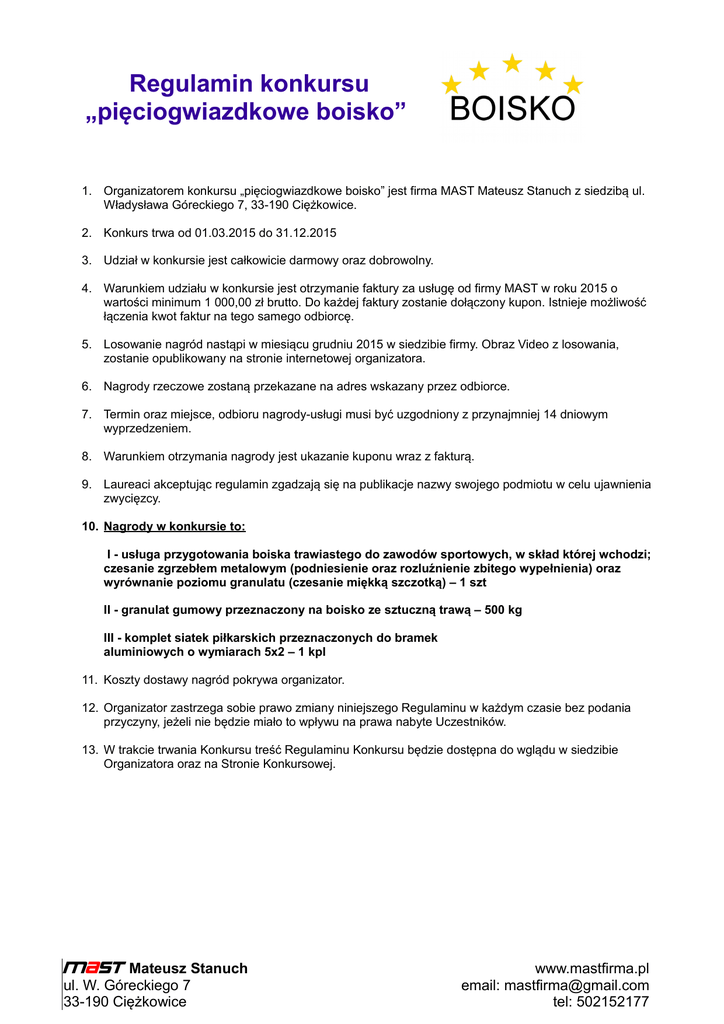 Regulamin konkursu „pięciogwiazdkowe boisko” 1. Organizatorem konkursu „pięciogwiazdkowe boisko” jest firma MAST Mateusz Stanuch z siedzibą ul. Władysława Góreckiego 7, 33-190 Ciężkowice. 2. Konkurs trwa od 01.03.2015 do 31.12.2015 3. Udział w konkursie jest całkowicie darmowy oraz dobrowolny. 4. Warunkiem udziału w konkursie jest otrzymanie faktury za usługę od firmy MAST w roku 2015 o wartości minimum 1 000,00 zł brutto. Do każdej faktury zostanie dołączony kupon. Istnieje możliwość łączenia kwot faktur na tego samego odbiorcę. 5. Losowanie nagród nastąpi w miesiącu grudniu 2015 w siedzibie firmy. Obraz Video z losowania, zostanie opublikowany na stronie internetowej organizatora. 6. Nagrody rzeczowe zostaną przekazane na adres wskazany przez odbiorce. 7. Termin oraz miejsce, odbioru nagrody-usługi musi być uzgodniony z przynajmniej 14 dniowym wyprzedzeniem. 8. Warunkiem otrzymania nagrody jest ukazanie kuponu wraz z fakturą. 9. Laureaci akceptując regulamin zgadzają się na publikacje nazwy swojego podmiotu w celu ujawnienia zwycięzcy. 10. Nagrody w konkursie to: I - usługa przygotowania boiska trawiastego do zawodów sportowych, w skład której wchodzi; czesanie zgrzebłem metalowym (podniesienie oraz rozluźnienie zbitego wypełnienia) oraz wyrównanie poziomu granulatu (czesanie miękką szczotką) – 1 szt II - granulat gumowy przeznaczony na boisko ze sztuczną trawą – 500 kg III - komplet siatek piłkarskich przeznaczonych do bramek aluminiowych o wymiarach 5x2 – 1 kpl 11. Koszty dostawy nagród pokrywa organizator. 12. Organizator zastrzega sobie prawo zmiany niniejszego Regulaminu w każdym czasie bez podania przyczyny, jeżeli nie będzie miało to wpływu na prawa nabyte Uczestników. 13. W trakcie trwania Konkursu treść Regulaminu Konkursu będzie dostępna do wglądu w siedzibie Organizatora oraz na Stronie Konkursowej. MAST Mateusz Stanuch ul. W. Góreckiego 7 33-190 Ciężkowice www.mastfirma.pl email: [email protected] tel: 502152177