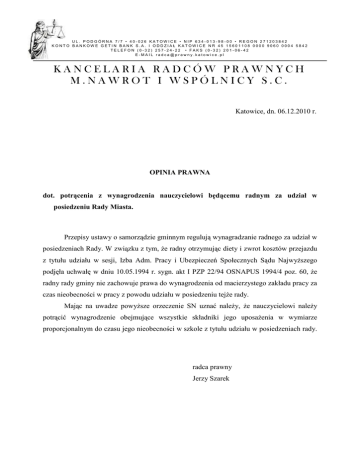 UL. PODGÓRNA 7/7 • 40-026 KATOW ICE • NIP 634-013-98-00 • REGON 271203842 KONTO BANKOW E GETIN BANK S.A. I ODDZIAŁ KATOWICE NR 45 15601108 0000 9060 0004 5842 TELEFON (0-32) 257-24-22 • FAKS (0-32) 201-06-42 E-MAIL [email protected] _______________________________________________________________________________________________ KANCELARIA RADCÓW PRAWNYCH M.NAWROT I WSPÓLNICY S.C. Katowice, dn. 06.12.2010 r. OPINIA PRAWNA dot. potrącenia z wynagrodzenia nauczycielowi będącemu radnym za udział w posiedzeniu Rady Miasta. Przepisy ustawy o samorządzie gminnym regulują wynagradzanie radnego za udział w posiedzeniach Rady. W związku z tym, Ŝe radny otrzymując diety i zwrot kosztów przejazdu z tytułu udziału w sesji, Izba Adm. Pracy i Ubezpieczeń Społecznych Sądu NajwyŜszego podjęła uchwałę w dniu 10.05.1994 r. sygn. akt I PZP 22/94 OSNAPUS 1994/4 poz. 60, Ŝe radny rady gminy nie zachowuje prawa do wynagrodzenia od macierzystego zakładu pracy za czas nieobecności w pracy z powodu udziału w posiedzeniu tejŜe rady. Mając na uwadze powyŜsze orzeczenie SN uznać naleŜy, Ŝe nauczycielowi naleŜy potrącić wynagrodzenie obejmujące wszystkie składniki jego uposaŜenia w wymiarze proporcjonalnym do czasu jego nieobecności w szkole z tytułu udziału w posiedzeniach rady. radca prawny Jerzy Szarek