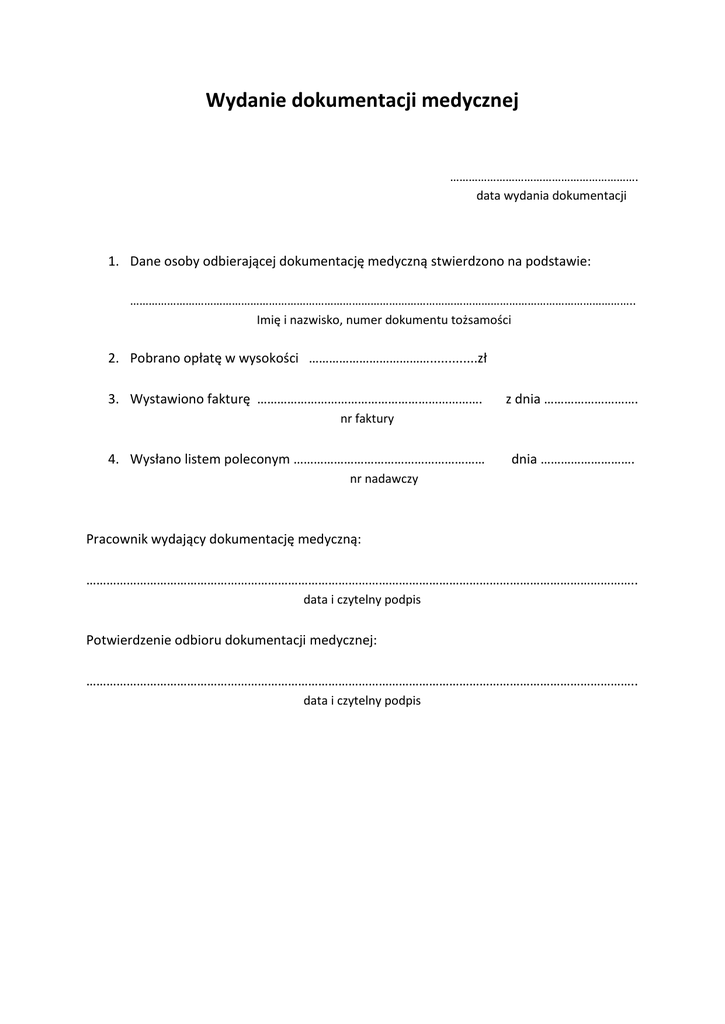 Wydanie dokumentacji medycznej ……………………………………………………. data wydania dokumentacji 1. Dane osoby odbierającej dokumentację medyczną stwierdzono na podstawie: ……………………………………………………………………………………………………………………………………………….. Imię i nazwisko, numer dokumentu tożsamości 2. Pobrano opłatę w wysokości ……………………………….............zł 3. Wystawiono fakturę …………………………………………………………. z dnia ………………………. nr faktury 4. Wysłano listem poleconym ………………………………………………… dnia ………………………. nr nadawczy Pracownik wydający dokumentację medyczną: ……………………………………………………………………………………………………………………………………………….. data i czytelny podpis Potwierdzenie odbioru dokumentacji medycznej: ……………………………………………………………………………………………………………………………………………….. data i czytelny podpis