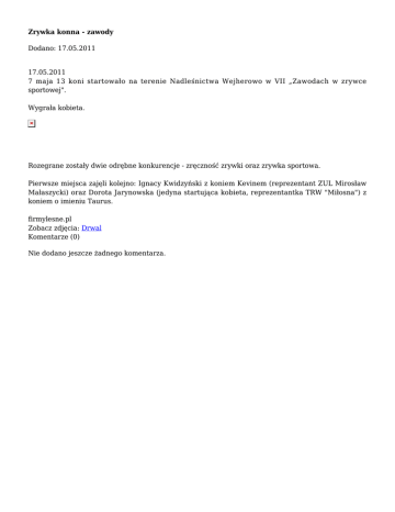 Zrywka konna - zawody Dodano: 17.05.2011 17.05.2011 7 maja 13 koni startowało na terenie Nadleśnictwa Wejherowo w VII „Zawodach w zrywce sportowej". Wygrała kobieta. Rozegrane zostały dwie odrębne konkurencje - zręczność zrywki oraz zrywka sportowa. Pierwsze miejsca zajęli kolejno: Ignacy Kwidzyński z koniem Kevinem (reprezentant ZUL Mirosław Małaszycki) oraz Dorota Jarynowska (jedyna startująca kobieta, reprezentantka TRW "Miłosna") z koniem o imieniu Taurus. firmylesne.pl Zobacz zdjęcia: Drwal Komentarze (0) Nie dodano jeszcze żadnego komentarza.