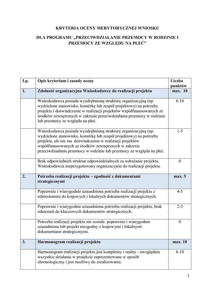 KRYTERIA OCENY MERYTORYCZNEJ WNIOSKU DLA PROGRAMU „PRZECIWDZIAŁANIE PRZEMOCY W RODZINIE I PRZEMOCY ZE WZGLĘDU NA PŁEĆ” Lp. Opis kryterium i zasady oceny 1. Zdolność organizacyjna Wnioskodawcy do realizacji projektu Wnioskodawca posiada wyodrębnioną strukturę organizacyjną (np. wydzielone stanowisko, komórkę lub zespół projektowy) na potrzeby projektu i doświadczenie w realizacji projektów współfinansowanych ze środków zewnętrznych w zakresie przeciwdziałania przemocy w rodzinie lub przemocy ze względu na płeć. 6-10 Wnioskodawca posiada wyodrębnioną strukturę organizacyjną (np. wydzielone stanowisko, komórkę lub zespół projektowy) na potrzeby projektu, ale nie ma doświadczenia w realizacji projektów współfinansowanych ze środków zewnętrznych w zakresie przeciwdziałania przemocy w rodzinie lub przemocy ze względu na płeć. 1-5 Brak odpowiednich struktur odpowiedzialnych za wdrażanie projektu. Wnioskodawca nieprzygotowany organizacyjnie do realizacji projektu. 2. Potrzeba realizacji projektu – zgodność z dokumentami strategicznymi 0 max. 5 Poprawnie i wiarygodnie uzasadniona potrzeba realizacji projektu z odniesieniem do krajowych i lokalnych dokumentów strategicznych. 4-5 Poprawnie i wiarygodnie uzasadniona potrzeba realizacji projektu, brak odniesień do kluczowych dokumentów strategicznych. 2-3 Potrzeba realizacji projektu nie została poprawnie i wiarygodnie uzasadniona lub projekt niezgodny z krajowymi i lokalnymi dokumentami strategicznymi. 3. Liczba punktów max. 10 Harmonogram realizacji projektu Harmonogram realizacji projektu jest kompletny i realny - uwzględnia wszystkie działania w projekcie zaprezentowane w sposób chronologiczny i jest możliwy do zrealizowania. 0 max. 10 6-10 1 Harmonogram realizacji projektu jest niepełny, jednak posiada informacje umożliwiające ocenę projektu i jest możliwy do zrealizowania. Harmonogram realizacji projektu jest niepełny, uniemożliwia ocenę projektu lub jest nierealny. 4. 5. Ocena budżetu projektu 1-5 0 max. 20 Wydatki są niezbędne i bezpośrednio związane z realizacją projektu. Koszty zostały oszacowane na realnym poziomie, nie są zawyżone w stosunku do cen rynkowych. 11-20 Wydatki są bezpośrednio związane z realizacją projektu, ale nie wszystkie wydatki są niezbędne do jego realizacji i/lub niektóre koszty są zawyżone w stosunku do cen rynkowych. 1-10 Przedstawione wydatki są niewystarczająco uzasadnione i/lub większość wydatków jest zawyżona w stosunku do cen rynkowych. 0 Wkład projektu w osiągnięcie rezultatów i wyników Programu max. 30 UWAGA: ocenie podlega wkład projektu w osiągnięcie założeń jednego celu ogólnego. Cel 2: zmniejszenie zjawiska Cel 1: zmniejszenie zjawiska przemocy ze względu na płeć przemocy w rodzinie Rezultat 1.1 Rozwój działań profilaktycznych i wsparcie infrastrukturalne w zakresie przeciwdziałania przemocy w rodzinie na szczeblu regionalnym i lokalnym Ocena działań w zakresie zwiększenia dostępności i podniesienia jakości usług na rzecz osób dotkniętych przemocą w rodzinie, w tym w zakresie poradnictwa specjalistycznego dla różnych kategorii ofiar. 0-10 Ocena działań w zakresie poprawy i dostosowania infrastruktury instytucjonalnej do potrzeb osób dotkniętych przemocą w rodzinie. 0-10 Ocena działań w zakresie zwiększenia dostępności i podniesienia jakości usług adresowanych do osób stosujących przemoc w rodzinie. 0-10 Rezultat 2.1. Wsparcie podmiotów realizujących programy terapeutyczne dla osób dotkniętych przemocą ze względu na płeć Ocena działań na rzecz poprawy jakości usług dla ofiar przemocy ze względu na płeć, w tym w zakresie oddziaływań terapeutycznych i poradnictwa specjalistycznego. 0-15 Ocena działań w zakresie zwiększania dostępności do usług świadczonych przez placówki pomocowe osobom dotkniętym przemocą ze względu na płeć. 0-15 2 6. 7. Wskaźniki Poprawne metodologicznie i adekwatne wskaźniki, możliwe do pozyskania i zmierzenia. Przedstawiono przejrzysty sposób monitorowania wskaźników. 4-5 Poprawność niektórych wskaźników i/lub sposobu ich monitorowania budzi zastrzeżenia. 1-3 Nie określono lub błędnie wybrano wskaźniki realizacji projektu. Nie określono poprawnego sposobu monitorowania wskaźników. 0 Innowacyjność i atrakcyjność projektu 4-7 Projekt zawiera działania w postaci sprawdzonych, powszechnie stosowanych wzorców, zgodnych z obecnym stanem wiedzy i możliwości realizacji. 1-3 Analiza ryzyka 0 max. 5 Wnioskodawca prawidłowo określił czynniki ryzyka wraz z ich znaczeniem i prawdopodobieństwem wystąpienia oraz przewidział odpowiednie środki nastawione na minimalizowanie ryzyka. 4-5 Analiza nie uwzględnia istotnych ryzyk lub nie dokonano trafnej oceny znaczenia i prawdopodobieństwa ryzyk. Przewidziane środki na minimalizowanie ryzyk nie są wystarczające. 1-3 Brak analizy ryzyka lub analiza została przeprowadzona błędnie. Nie przewidziano środków minimalizowania ryzyka. 9. max. 7 Projekt cechuje nowatorskie podejście do problemu, zawiera działania w postaci nowych wzorców do naśladowania. Działania przewidziane w projekcie są niezgodne z obecnym stanem wiedzy oraz nieodpowiednie pod względem możliwości realizacji projektu. 8. max. 5 0 Zagadnienia horyzontalne (zrównoważony rozwój, równość płci, dobre rządzenie) max. 5 Projekt w pełni wpisuje się w realizację więcej niż jednego zagadnienia horyzontalnego. 4-5 Projekt odnosi się przynajmniej do jednego zagadnienia horyzontalnego. 1-3 Projekt nie odnosi się do zagadnień horyzontalnych. 0 3 10. Potrzeby grup szczególnie wrażliwych (w tym Romów i imigrantów) max. 3 Projekt uwzględnia potrzeby grup szczególnie wrażliwych, w tym Romów i imigrantów. 3 Projekt częściowo uwzględnia potrzeby grup szczególnie wrażliwych. 2 W projekcie brak jest odniesień do potrzeb grup szczególnie wrażliwych. 1 Maksymalna liczba 