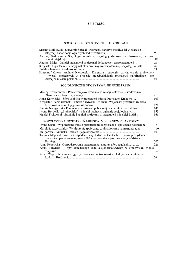 SPIS TREŚCI SOCJOLOGIA PRZESTRZENI: INTERPRETACJE Marian Malikowski, Sławomir Sołecki - Potrzeby, bariery i możliwości w zakresie integracji badań socjologicznych nad przestrzenią...................................................... 9 Andrzej Sadowski - Socjologia miasta - socjologią zbiorowości ulokowanej w prze strzeni miejskiej ............................................................................................... 18 Andrzej Majer - Od idei przestrzeni społecznej do koncepcji czasoprzestrzeni ... 26 Krzysztof Frysztacki - Paradygmat ekonomiczny we współczesnej socjologii miasta 42 Bohdan Jałowiecki - Metropolizacja ....................................................................... 53 Krzysztof Czekaj, Andrzej Niesporek - Diagnoza i strategia rozwiązywania problemów i kwestii społecznych w procesie przeciwdziałania procesowi marginalizacji spo łecznej w mieście polskim................................................................................ 69 SOCJOLOGICZNE ODCZYTYWANIE PRZESTRZENI Maciej Kowalewski - Przestrzeń jako zmienna w relacji człowiek - środowisko. Obszary socjologicznej analizy ........................................................................ Anna Karwińska - Sfera osobista w przestrzeni miasta. Przypadek Krakowa .... Krzysztof Bierwiaczonek, Tomasz Nawrocki - W cieniu Wojaczka: przestrzeń miejska Mikołowa w oczach jego mieszkańców ........................................................... Danuta Niczyporuk - Przemiany przestrzeni publicznej. Na przykładzie Lublina . . Iwona Borowik - „Blokowiska" - miejski habitat w oglądzie socjologicznym ... Maciej Frykowski - Zaufanie i kapitał społeczny w przestrzeni miejskiej Łodzi . . 91 103 120 145 153 166 WSPÓŁCZESNA PRZESTRZEŃ MIEJSKA: MECHANIZMY I AKTORZY Iwona Sagan - Współczesne miasto przestrzennie rozproszone i społecznie podzielone 181 Marek S. Szczepański - Wykluczenie społeczne, czyli ładowanie na marginesach? 186 Małgorzata Dymnicka - Miasto i jego obywatele ................................................... 193 Tatiana Majcherkiewicz - Gospodarze czy ludzie w teczkach? ... nowi prezydenci miast i kampania samorządowa 2002 r. w powiatach grodzkich województwa śląskiego .......................................................................................................... 207 Anna Rębowska - Gospodarowanie przestrzenią - aktorzy sfery regulacji ............ 226 Anna Bujwicka - Typy sąsiedzkiego ładu aksjonormatywnego w środowisku wielko miejskim .......................................................................................................... 246 Adam Wojciechowski - Kręgi stycznościowe w środowisku lokalnym na przykładzie Łodzi i Brudzewic .......................................................................................... 264