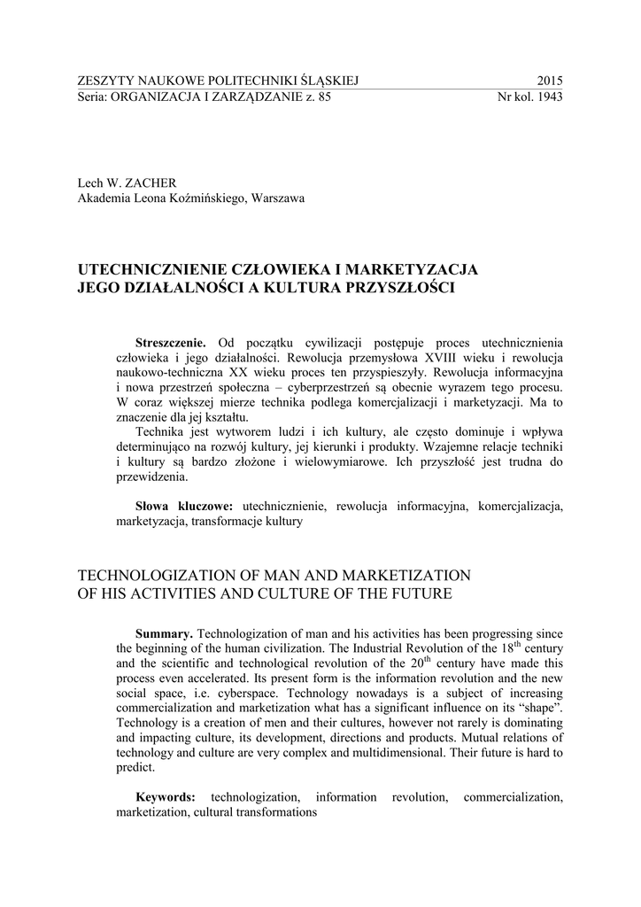 ZESZYTY NAUKOWE POLITECHNIKI ŚLĄSKIEJ Seria: ORGANIZACJA I ZARZĄDZANIE z. 85 2015 Nr kol. 1943 Lech W. ZACHER Akademia Leona Koźmińskiego, Warszawa UTECHNICZNIENIE CZŁOWIEKA I MARKETYZACJA JEGO DZIAŁALNOŚCI A KULTURA PRZYSZŁOŚCI Streszczenie. Od początku cywilizacji postępuje proces utechnicznienia człowieka i jego działalności. Rewolucja przemysłowa XVIII wieku i rewolucja naukowo-techniczna XX wieku proces ten przyspieszyły. Rewolucja informacyjna i nowa przestrzeń społeczna – cyberprzestrzeń są obecnie wyrazem tego procesu. W coraz większej mierze technika podlega komercjalizacji i marketyzacji. Ma to znaczenie dla jej kształtu. Technika jest wytworem ludzi i ich kultury, ale często dominuje i wpływa determinująco na rozwój kultury, jej kierunki i produkty. Wzajemne relacje techniki i kultury są bardzo złożone i wielowymiarowe. Ich przyszłość jest trudna do przewidzenia. Słowa kluczowe: utechnicznienie, rewolucja informacyjna, komercjalizacja, marketyzacja, transformacje kultury TECHNOLOGIZATION OF MAN AND MARKETIZATION OF HIS ACTIVITIES AND CULTURE OF THE FUTURE Summary. Technologization of man and his activities has been progressing since the beginning of the human civilization. The Industrial Revolution of the 18th century and the scientific and technological revolution of the 20th century have made this process even accelerated. Its present form is the information revolution and the new social space, i.e. cyberspace. Technology nowadays is a subject of increasing commercialization and marketization what has a significant influence on its “shape”. Technology is a creation of men and their cultures, however not rarely is dominating and impacting culture, its development, directions and products. Mutual relations of technology and culture are very complex and multidimensional. Their future is hard to predict. Keywords: technologization, information marketization, cultural transformations revolution, commercialization, 618 L.W. Zacher 1. Proces utechnicznienia człowieka i jego działalności sięga początków cywilizacji. Jest to proces w zasadzie ewolucyjny, choć przerywany wielkimi przewrotami technicznymi. XVIII wiek to rewolucja przemysłowa z jej masowością, maszynizacją, nowym typem napędu, także nowymi kwalifikacjami i kompetencjami ludzi. Wiek XX to rewolucja naukowo-techniczna1, do pewnego stopnia nakładająca się na procesy industrializacji, charakteryzująca się unaukowieniem techniki, wielkim rozwojem badań i edukacji, upowszechnianiem naukowego myślenia i technicznej racjonalności. Koniec wieku XX i początki XXI to dominacja nowych kierunków (czy „kanałów” rozwojowych tej rewolucji): energetyka (i broń) atomowa, rewolucja materiałowa (od plastiku do kompozytów), później – rewolucja informacyjna, rewolucja biotechnologiczna, rewolucja nanotechnologiczna (ta ostatnia dopiero „w powijakach”). Rewolucje te wytworzyły nowe środowisko życia ludzi. Choć przez ludzi (badania, innowacje, ich aplikacje, instytucje, organizacje, polityki, zachowania) były dokonywane, to ich rezultaty tylko częściowo były planowane, pożądane, oczekiwane, pozytywne. Rewolucje te generowały poważne ryzyko i zagrożenia oraz negatywne skutki uboczne (natychmiastowe i oddalone w czasie). Miały też wielką zdolność transformacyjną, praktycznie we wszystkich dziedzinach życia ludzi oraz odnośnie do samych ludzi, czyli ich twórców i agentów technicznych zmian. Nastąpiły radykalne transformacje w sferze: B+R, edukacji, przemyśle i usługach, medycynie, zarządzaniu, również w instytucjach i organizacjach, także w świadomości ludzi, wyobraźni2, zachowaniach, stylu życia, polityce i kulturze (nie tylko technicznej), w mediach, rozrywce, sporcie, nie mówiąc o sferze militarnej. Rosło utechnicznienie ludzi (stąd termin technological man), cywilizacji (technological civilization), kultury (technolpol). Szczególną, jak się zdaje, rolę odgrywa rewolucja informacyjna (znana też jako komputerowa, telematyczna, mikroprocesorowa, cyfrowa). Jej efektem jest uinformacyjnienie i usieciowienie świata ludzi3. Co więcej, wytworzyła ona niejako dodatkową przestrzeń społeczną – cyberprzestrzeń. Powiększył się więc „obszar” funkcjonowania człowieka. A zatem, świat ludzi stał się mocno utechniczniony i (wirtualnie) powiększony, a jednocześnie skomplikowany i złożony, silnie zróżnicowany (rozmaite luki techniczne, ostatnio – luka cyfrowa) i różnorodny (stąd termin cywilizacja różnorodności). Zróżnicowanie i różnorodność wyrażają się nie tylko w – niejako naturalnej ze względu na moment startu do rozwoju i jego tempa oraz kierunków – jego wielopoziomowości 1 2 3 Zacher L.W.: Rewolucja naukowo-techniczna. Encyklopedia Socjologii, t. 3. Oficyna Naukowa, Warszawa 2000. Zacher L.W.: Wyobraźnia – orientacja prospektywna – kształtowanie przyszłości. Światłocienie wyobraźni. Wróbel S. i in. (red.), UAM, Poznań-Kalisz 2008. Zacher L.W.: Uinformacyjnienie i usieciowienie działań i życia ludzi (niektóre problemy) – Model konceptualny. Informacja w społeczeństwie XXI wieku. Łapińska A., Wędrowska E. (red.), Uniwersytet Warmińsko Mazurski, Olsztyn 2004, s. 161-171. Utechnicznienie człowieka i marketyzacja… 619 i wielotrajektoryjności, lecz też w zróżnicowaniu jego pozytywnych i negatywnych efektów wynikających nie tyle z samej techniki, ile ze zdolności kulturowej do jej tworzenia, stosowania, asymilacji, dyfuzji, kontrolowania. Ważnym wymiarem rozwoju techniki, jej wpływów jest globalizacja, która jako proces zaczęła się na dobre od Kolumba i obecnie osiągnęła apogeum– dzięki nowym środkom transportu (statki, samoloty, transkontynentalne koleje itp.) oraz telekomunikacji i mediom (telefony, kable, satelity, radio i TV, Internet). Globalna mediatyzacja, globalne audytorium pozwalają na hegemonizację kulturowego oddziaływania i n