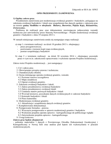 1 Załącznik nr III/A do SIWZ OPIS PRZEDMIOTU ZAMÓWIENIA 1) Ogólny zakres prac. Przedmiotem zamówienia jest modernizacja ewidencji gruntów i budynków, polegająca na założeniu ewidencji budynków i lokali oraz uzupełnienia baz danych zgodnie z zakresem prac na terenie gminy Siedlisko w obrębach: Bielawy, Borowiec, Piękne Kąty, Różanówka, Zwierzyniec. Podstawą do realizacji prac oraz dokumentem zawierającym jednocześnie warunki techniczne jest zatwierdzony przez Starostę Nowosolskiego - Projekt modernizacji ewidencji gruntów i budynków z dnia 19 sierpnia 2013 r. W ramach niniejszego zamówienia ustala się następujące etapy realizacji: a) etap 1 z terminem realizacji na dzień 10 grudnia 2013 r. obejmujący: - prace przygotowawcze, - porównanie z terenem kopii map ewidencyjnych, - pomiar uzupełniający budynków b) etap 2 z terminem realizacji na dzień 30 września 2014 r. obejmujący pozostałe prace w tym m.in. zakończenie opracowania i wyłożenie operatu Projektu modernizacji... Zakres treści Projektu modernizacji… jest następujący: l. Cel i zakres prac. 2. Obowiązujące przepisy prawne i techniczne. 3. Charakterystyka obiektu. 4. Ocena istniejącego operatu ewidencji gruntów, wnioski. 4.1 Pozioma osnowa szczegółowa 4.2 Mapa zasadnicza 4.3 Operat ewidencji gruntów. 5. Założenie ewidencji budynków i lokali. 5.1 Zakres przedmiotowy ewidencji budynków 5.2 Zakres przedmiotowy ewidencji lokali 5.3 Ustalenie stanów prawnych budynków i lokali 5.4 Wywiad terenowy, pozyskanie danych ewidencyjnych w zakresie budynków 5.5 Kartoteki budynków i lokali 5.6 Prace kameralne. 6. Modernizacja ewidencji gruntów. 6.1 Aktualizacja i uzupełnienie danych ewidencji gruntów. 7. Kompletowanie dokumentacji. 8. Postępowanie formalno - prawne. 8.1 Wszczęcie postępowania w sprawie modernizacji gruntów i budynków 8.2 Wyłożenie projektu operatu opisowo - kartograficznego do publicznego wglądu 8.3 Zatwierdzenie projektu opisowo - kartograficznego. 9. Uwagi końcowe. Zakres prac będzie obejmował: - pobranie materiałów i danych z Powiatowego Ośrodka Dokumentacji Geodezyjnej i Kartograficznej w Nowej Soli oraz analiza pod kątem ich wykorzystania w pracach modernizacyjnych, 2 Załącznik nr III/A do SIWZ - porównanie mapy zasadniczej z terenem w zakresie budynków, pomiar brakujących budynków, - założenie ewidencji budynków i lokali, - uzupełnienie istniejącej ewidencji gruntów (czyści opisowej i kartograficznej) o dane zgodnie z wymogami rozporządzenia z 29.03.2001 r. w sprawie ewidencji gruntów i budynków: a) numery rejestru zabytków, b) numery dróg publicznych, c) numer PESEL (gdy brak w danych ewidencyjnych), d) numer REGON, e) aktualnego adresu podmiotów ewidencyjnych, f) informacja, czy osoba prawna lub fizyczna jest cudzoziemcem, - zweryfikowanie użytków gruntowych i granic użytków zaliczonych do gruntów zabudowanych i zurbanizowanych pod względem faktycznego sposobu użytkowania nieruchomości. 2) Ogólna charakterystyka obiektu – 080408_2 Siedlisko Ilość jednostek rejestrowych obręb 0001 Bielawy 0002 Borowiec 0003 Piękne Kąty 0004 Różanówka 0005 Siedlisko 0006 Zwierzyniec RAZEM Ilość budynków gruntów budynków lokali 399 136 62 101 662 39 - - 1062 287 176 125 1479 53 1399 - - 3182 Orientacyjna ilość lokali wyodrębnionych 310 Przewiduje się, że ilość budynków nieujawnionych w bazie mapy numerycznej, a wymagających pomiaru w terenie, wynosi około 30% w stosunku do ilości uwidocznionych budynków w GEO-INFO. 3) Tryb postępowania w przypadku zaistnienia sytuacji nieuwzględnionych w uwarunkowaniach określonych w projekcie modernizacji… Do obowiązku Wykonawcy prac w ramach niniejszego zadania jest założenie oraz bieżące prowadzenie Dziennika Robót. W szczególności należy w nim zapisywać: - każdy zrealizowany etap prac, - występujące problemy i dokonane uzgodnienia z Zamawiającym. Dopuszcza się zmianę sposobu realizacji zadania jedynie po uprzednim pisemnym uzgodnieniu zamieszczonym w Dzienniku Robót. W przypadku ogłoszenia zmiany w obowiązujących przepisach, tworzone i bazy danych należy uzupełnić zgodnie z nowym brzmieniem przepisów. 3 Załącznik nr III/A do SIWZ 4. Zasady współpracy i rozliczania z PODGiK w Nowej Soli. Dokumentacja wyjściowa do wykonania opracowania zostanie udostępniona Wykonawcy w zakresie danych numerycznych na płytach DVD, natomiast pozostałe w formie poświadczonych kserokopii dokumentów z zasobu geodezyjnego. Opłaty dla PODGiK zostaną naliczone zgodnie z Rozporządzeniem Ministra Infrastruktury z dnia 19 lutego 2004 r w sprawie wysokości opłat za czynności geodezyjne i kartograficzne oraz udzielanie informacji, a także za wykonywanie wyrysów i wypisów z operatu ewidencyjnego. (Dz. U. Nr 37, poz.333).