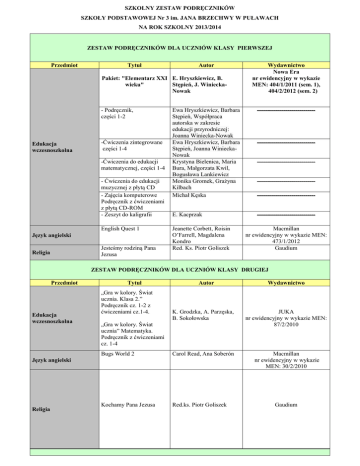 SZKOLNY ZESTAW PODRĘCZNIKÓW SZKOŁY PODSTAWOWEJ Nr 3 im. JANA BRZECHWY W PUŁAWACH NA ROK SZKOLNY 2013/2014 ZESTAW PODRĘCZNIKÓW DLA UCZNIÓW KLASY PIERWSZEJ Przedmiot Tytuł Autor Pakiet: "Elementarz XXI E. Hryszkiewicz, B. wieku" Stępień, J. WinieckaNowak - Podręcznik, części 1-2 Edukacja wczesnoszkolna -Ćwiczenia zintegrowane części 1-4 -Ćwiczenia do edukacji matematycznej, części 1-4 - Ćwiczenia do edukacji muzycznej z płytą CD - Zajęcia komputerowe Podręcznik z ćwiczeniami z płytą CD-ROM - Zeszyt do kaligrafii English Quest 1 Język angielski Jesteśmy rodziną Pana Jezusa Religia Wydawnictwo Nowa Era nr ewidencyjny w wykazie MEN: 404/1/2011 (sem. 1), 404/2/2012 (sem. 2) Ewa Hryszkiewicz, Barbara Stępień, Współpraca autorska w zakresie edukacji przyrodniczej: Joanna Winiecka-Nowak Ewa Hryszkiewicz, Barbara Stępień, Joanna WinieckaNowak Krystyna Bielenica, Maria Bura, Małgorzata Kwil, Bogusława Lankiewicz Monika Gromek, Grażyna Kilbach Michał Kęska ----------------------------- E. Kacprzak ----------------------------- Jeanette Corbett, Roisin O’Farrell, Magdalena Kondro Red. Ks. Piotr Goliszek ----------------------------- ----------------------------- --------------------------------------------------------- Macmillan nr ewidencyjny w wykazie MEN: 473/1/2012 Gaudium ZESTAW PODRĘCZNIKÓW DLA UCZNIÓW KLASY DRUGIEJ Przedmiot Edukacja wczesnoszkolna Tytuł „Gra w kolory. Świat ucznia. Klasa 2.” Podręcznik cz. 1-2 z ćwiczeniami cz.1-4. Autor K. Grodzka, A. Parzęska, B. Sokołowska JUKA nr ewidencyjny w wykazie MEN: 87/2/2010 Bugs World 2 Carol Read, Ana Soberón Macmillan nr ewidencyjny w wykazie MEN: 30/2/2010 Kochamy Pana Jezusa Red.ks. Piotr Goliszek „Gra w kolory. Świat ucznia” Matematyka. Podręcznik z ćwiczeniami cz. 1-4 Język angielski Religia Wydawnictwo Gaudium ZESTAW PODRĘCZNIKÓW DLA UCZNIÓW KLASY TRZECIEJ Przedmiot Tytuł Gra w kolory. Podręcznik cz. 1 i 2 Gra w kolory. Ćwiczenia cz. 1, 2, 3, 4. Gra w kolory. Matematyka cz. 1, 2, 3, 4. Autor Katarzyna Grodzka Gra w kolory. Wyprawka. Katarzyna Grodzka. Beata Sokołowska Aleksandra Kozyra – Wiśniewska, Jolanta Parła Gra w kolory. Śpiewnik Edukacja wczesnoszkolna Katarzyna Grodzka. Ewa Wierzchowska Beata Sokołowska Wydawnictwo Juka nr ewidencyjny w wykazie MEN: 87/3/2010 Gra w kolory. Zajęcia techniczne. Gra w kolory. Multibook. Juka Małgorzata Struczewska. Anna Parzęcka Gra w kolory. Matematyka. Beata Sokołowska Zbiór zadań. Juka Gra w kolory. Zeszyt z zadaniami o podwyższonym stopniu trudności. Barbara Mazur. Beata Sokołowska Juka Język angielski Bugs World 3 Carol Read, Ana Soberón Religia Radość spotkania z Jezusem Red. Ks. Ryszrd Lis Juka Macmillan nr ewidencyjny w wykazie MEN: 30/3/2011 Gaudium ZESTAW PODRĘCZNIKÓW DLA UCZNIÓW KLASY CZWARTEJ Przedmiot Język polski Przyroda Tytuł Słowa z uśmiechem” + Zeszyt ćwiczeń ,,Nauka o języku i ortografia” część 1 i 2 „Przyrodo, Witaj” + zeszyt ćwiczeń ,,Wczoraj i dziś” (podręcznik) Historia i Społeczeństwo Matematyka Zajęcia komputerowe Autor Ewa Horwath, Anita Żegleń Wydawnictwo WSiP nr ewidencyjny w wykazie MEN: 551/1/2012 Ewa Gromek, Ewa Kłos, Wawrzyniec Kofta, Ewa Laskowska, Andrzej Melson Grzegorz Wojciechowski WSiP nr ewidencyjny w wykazie MEN: 530/1/2012 ,,Wczoraj i dziś” (zeszyt ćwiczeń) Tomasz Maćkowski „Matematyka wokół nas” klasa 4 + ćwiczenia na I i II semestr „Lubię to!” Podręcznik multimedialny pendrive + zbiór zadań, klasa 4-6 Discover English 1 Helena Lewicka, Marianna Kowalczyk Punkt. Język niemiecki dla klasy 4 Anna Potapowicz Muzyka. Nuty, smyki i patyki. Podręcznik z ćwiczeniami dla klasy 4 część I i II. Malina Sarnowska, Katarzyna Jakóbczak – Drążek ,Olivia Kaczyńska, Urszula Smoczyńska. Język angielski Michał Kęska Izabella Hearn, Jayne Wildman Język niemiecki Muzyka Nowa Era nr ewidencyjny w wykazie MEN:443/1/2012 Nowa Era WSiP nr ewidencyjny w wykazie MEN: 275/1/2010 Nowa Era nr ewidencyjny w wykazie MEN: 583/m/2012 Pearson, Longman nr ewidencyjny w wykazie MEN: 402/2/2011 WSiP nr ewidencyjny w wykazie MEN: 304/1/2010 WSiP nr ewidencyjny w wykazie MEN: 547/1/2012 Plastyka 4. Podręcznik do Szkoły Podstawowej Plastyka S.K. Stopczyk, B. Neubart Jak to działa? Podręcznik z ćwiczeniami do zajęć Lech Łabecki, technicznych dla klas Marta Łabecka 4-6 Szkoły Podstawowej Zajęcia techniczne Jestem chrześcijaninem Religia WSiP nr ewidencyjny w wykazie MEN: 440/1/2012 Nowa Era nr ewidencyjny w wykazie MEN: 295/2010 Red. Ks. Waldemar Janiga Gaudium ZESTAW PODRĘCZNIKÓW DLA UCZNIÓW KLASY PIĄTEJ Przedmiot Język polski Przyroda Tytuł ,,Słowa z uśmiechem” + Zeszyt ćwiczeń, , nauka o języku i ortografia” część 1 i 2 „Przyrodo Witaj” Podręcznik dla klasy 5 + ćwiczenia ,,Wczoraj i dziś” (podręcznik) Autor Ewa Horwath, Anita Żeglń Wydawnictwo WSiP nr ewidencyjny w wykazie MEN: 551/3/2013 E. Gromek, E. Kłos, W. Kofta ,,Wczoraj i dziś” (zeszyt ćwiczeń) „Matematyka wokół nas” klasa 5 + ćwiczenia na I i II semestr Punkt. Język niemiecki dla klasy 4 Tomasz Maćkowski WSiP nr ewidencyjny w wykazie MEN: 530/2/2013 Nowa Era nr ewidencyjny w wykazie MEN: 443/2/2013 Nowa Era Grzegorz Wojciechowski Historia i Społeczeństwo Matematyka Język niemiecki Zajęcia techniczne Zajęcia komputerowe Jak to działa? Podręcznik z ćwiczeniami do zajęć technicznych dla klas 4-6 Szkoły Podstawowej Zajęcia komputerowe dla Szkoły Podstawowej kl. IV-VI Discover English 2 Język angielski Helena Lewicka, Marianna Kowalczyk Anna Potapowicz Lech Łabecki, Marta Łabecka Grażyna Koba Izabella Hearn, Jayne Wildman WSiP nr ewidencyjny w wykazie MEN: 275/2/2010 WSiP nr ewidencyjny w wykazie MEN: 304/1/2010 Nowa Era nr ewidencyjny w wykazie MEN: 295/2010 Migra nr ewidencyjny w wykazie MEN: 373/2011 Pearson, Longman nr ewidencyjny w wykazie MEN: 402/3/2011 Muzyka. Nuty, smyki i patyki. Podręcznik z ćwiczeniam