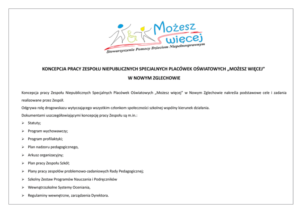 KONCEPCJA PRACY ZESPOŁU NIEPUBLICZNYCH SPECJALNYCH PLACÓWEK OŚWIATOWYCH „MOŻESZ WIĘCEJ” W NOWYM ZGLECHOWIE Koncepcja pracy Zespołu Niepublicznych Specjalnych Placówek Oświatowych „Możesz więcej” w Nowym Zglechowie nakreśla podstawowe cele i zadania realizowane przez Zespół. Odgrywa rolę drogowskazu wytyczającego wszystkim członkom społeczności szkolnej wspólny kierunek działania. Dokumentami uszczegółowiającymi koncepcję pracy Zespołu są m.in.: Statuty; Program wychowawczy; Program profilaktyki; Plan nadzoru pedagogicznego, Arkusz organizacyjny; Plan pracy Zespołu Szkół; Plany pracy zespołów problemowo-zadaniowych Rady Pedagogicznej; Szkolny Zestaw Programów Nauczania i Podręczników Wewnątrzszkolne Systemy Oceniania, Regulaminy wewnętrzne, zarządzenia Dyrektora. MOTTO ZESPOŁU NIEPUBLICZNYCH SPECJALNYCH PLACÓWEK OŚWIATOWYCH „MOŻESZ WIĘCEJ” W NOWYM ZGLECHOWIE: "Nie idź za mną, bo nie umiem prowadzić. Nie idź przede mną, bo mogę za tobą nie nadążyć. Idź po prostu obok mnie i bądź moim przyjacielem." Albert Camus MISJA Misją Zespołu Niepublicznych Specjalnych Placówek Oświatowych „Możesz więcej” w Nowym Zglechowie jest zintegrowana edukacja i rehabilitacja oraz wsparcie społeczne wychowanków/uczniów oraz ich rodzin. CELE: Do głównych celów działalności Zespołu zalicza się: 1. tworzenie warunków do możliwie wszechstronnego rozwoju wychowanków/uczniów w dostępnym im zakresie, 2. przygotowanie dzieci i młodzieży do pełnienia różnych ról społecznych oraz autonomicznego (na miarę ich możliwości rozwojowych) i aktywnego dorosłego życia, 3. utrwalanie i poszerzanie zakresu posiadanej wiedzy, kształcenie kompetencji społecznych, zdolności adaptacyjnych i nabywanie nowych umiejętności umożliwiających samodzielne, niezależne funkcjonowanie wychowanków/uczniów w każdej ze sfer rozwoju. 4. współtworzenie z uczniami i rodzicami indywidualnego planu na życie. WIZJA: Zespół Niepublicznych Specjalnych Placówek Oświatowych „Możesz więcej” w Nowym Zglechowie będzie: bezpiecznym i przyjaznym miejscem codziennej nauki i terapii dla wychowanków/uczniów i ich rodziców zapewniać wychowankom/uczniom i ich rodzicom wysoki poziom realizacji ich oczekiwań, rozwijać w wychowankach/uczniach motywację do codziennej nauki i rehabilitacji, włączać do współpracy oraz wspierać rodziców i rodziny, aby wspólnie zaspokajać specjalne potrzeby edukacyjno-rehabilitacyjno-społeczne wychowanków/uczniów SPODZIEWANE EFEKTY NASZEJ PRACY: Absolwent Zespołu Niepublicznych Specjalnych Placówek Oświatowych „Możesz więcej” w Nowym Zglechowie w miarę swoich możliwości: Posiada wiedzę i umiejętności niezbędne do pracy i życia w warunkach współczesnego świata , Jest pełnosprawnym uczestnikiem życia społecznego i kulturalnego, Wie gdzie i do kogo zwrócić się o pomoc w sprawach osobistych, rodzinnych i prawnych, Potrafi dokonywać właściwych wyborów i hierarchizacji wartości w różnych sytuacjach życiowych, Jest kreatywny i chętny do poszerzania swych wiadomości i umiejętności w różnych dziedzinach życia, Stara się przestrzegać ogólnie przyjętych norm, jednocześnie zachowując prawo do inności, Radzi sobie z emocjami oraz potrafi rozwiązywać konflikty na drodze negocjacji, Posiada ukształtowany model rodziny oparty na odpowiedzialności, Zna zasady zdrowego stylu życia i odżywiania się. Wartości preferowane: W zakresie wdrażania do samodzielności: Wyrabianie szacunku do pracy, systematyczność, dbałość o jakość wyników pracy, punktualność. Wdrażanie do wiary we własne możliwości, wysoka samoocena. Wyrabianie umiejętności współżycia w rodzinie, rozumienia cudzych potrzeb i nawyków, uczucie empatii. W zakresie kultury osobistej: Umiejętność zachowania się w miejscach publicznych, korzystanie z różnych urządzeń technicznych. Umiejętność załatwiania spraw w publicznych urzędach i instytucjach. Kultura języka, eliminowanie wulgaryzmów. Umiejętność spędzania wolnego czasu. Umiejętność współżycia z ludźmi, rozwiązywania konfliktów, eliminowanie agresji w kontaktach z ludźmi. W zakresie dbania o własne zdrowie: Umiejętność ochrony przed niebezpiecznymi zjawiskami społecznymi: napady, kradzieże, gwałty. Umiejętność mówienia „nie” na używki i środki uzależniające. Wdrożenie do stałej dbałości o zdrowie przez higienę, tryb życia i kontakty ze służbą zdrowia. W zakresie wychowania patriotycznego: Wdrażanie do patriotyzmu, szacunku do symboli narodowych. Wyrabianie miłości i szacunku do środowiska lokalnego, swego miasta. Wychowanie w duchu tolerancji szeroko pojętej. Wdrażanie do poczucia odpowiedzialności za swoje czyny.