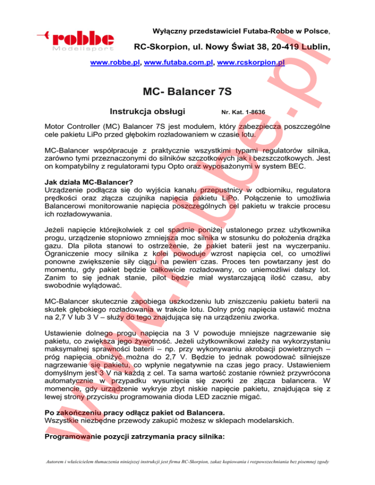 Wyłączny przedstawiciel Futaba-Robbe w Polsce, rob be .pl RC-Skorpion, ul. Nowy Świat 38, 20-419 Lublin, www.robbe.pl, www.futaba.com.pl, www.rcskorpion.pl MC- Balancer 7S Instrukcja obsługi Nr. Kat. 1-8636 Motor Controller (MC) Balancer 7S jest modułem, który zabezpiecza poszczególne cele pakietu LiPo przed głębokim rozładowaniem w czasie lotu. MC-Balancer współpracuje z praktycznie wszystkimi typami regulatorów silnika, zarówno tymi przeznaczonymi do silników szczotkowych jak i bezszczotkowych. Jest on kompatybilny z regulatorami typu Opto oraz wyposażonymi w system BEC. Jak działa MC-Balancer? Urządzenie podłącza się do wyjścia kanału przepustnicy w odbiorniku, regulatora prędkości oraz złącza czujnika napięcia pakietu LiPo. Połączenie to umożliwia Balancerowi monitorowanie napięcia poszczególnych cel pakietu w trakcie procesu ich rozładowywania. w. Jeżeli napięcie którejkolwiek z cel spadnie poniżej ustalonego przez użytkownika progu, urządzenie stopniowo zmniejsza moc silnika w stosunku do położenia drążka gazu. Dla pilota stanowi to ostrzeżenie, że pakiet baterii jest na wyczerpaniu. Ograniczenie mocy silnika z kolei powoduje wzrost napięcia cel, co umożliwi ponowne zwiększenie siły ciągu na pewien czas. Proces ten powtarzany jest do momentu, gdy pakiet będzie całkowicie rozładowany, co uniemożliwi dalszy lot. Zanim to się jednak stanie, pilot będzie miał wystarczającą ilość czasu, aby swobodnie wylądować. MC-Balancer skutecznie zapobiega uszkodzeniu lub zniszczeniu pakietu baterii na skutek głębokiego rozładowania w trakcie lotu. Dolny próg napięcia ustawić można na 2,7 V lub 3 V – służy do tego znajdująca się na urządzeniu zworka. ww Ustawienie dolnego progu napięcia na 3 V powoduje mniejsze nagrzewanie się pakietu, co zwiększa jego żywotność. Jeżeli użytkownikowi zależy na wykorzystaniu maksymalnej sprawności baterii – np. przy wykonywaniu akrobacji powietrznych – próg napięcia obniżyć można do 2,7 V. Będzie to jednak powodować silniejsze nagrzewanie się pakietu, co wpłynie negatywnie na czas jego pracy. Ustawieniem domyślnym jest 3 V na każdą z cel. Ta sama wartość zostanie również przywrócona automatycznie w przypadku wysunięcia się zworki ze złącza balancera. W momencie, gdy urządzenie wykryje zbyt niskie napięcie pakietu, znajdująca się z lewej strony przycisku programowania dioda LED zacznie migać. Po zakończeniu pracy odłącz pakiet od Balancera. Wszystkie niezbędne przewody zakupić możesz w sklepach modelarskich. Programowanie pozycji zatrzymania pracy silnika: Autorem i właścicielem tłumaczenia niniejszej instrukcji jest firma RC-Skorpion, zakaz kopiowania i rozpowszechniania bez pisemnej zgody Wyłączny przedstawiciel Futaba-Robbe w Polsce, rob be .pl RC-Skorpion, ul. Nowy Świat 38, 20-419 Lublin, www.robbe.pl, www.futaba.com.pl, www.rcskorpion.pl Aby umożliwić MC-Balancerowi wyłączenie regulatora silnika przy zbyt niskim napięciu pakietu, należy zaprogramować odpowiednią pozycję drążka. W tym celu podłącz urządzenie do odbiornika i regulatora obrotów (biały przewód złącza regulatora obrotów powinien znaleźć się po stronie zewnętrznej). Następnie podłącz przewód czujnika napięcia pakietu do MC-Balancera tak, aby czarny przewód (biegun ujemny pakietu) znajdował się w miejscu oznaczonym strzałką patrz szkic. Następnie wychyl drążek gazu do wybranej pozycji i naciśnij przycisk programowania MC-Balancera. Dioda LED zaświeci się na czerwono, co oznacza, że urządzenie zapamiętało ustawioną pozycję drążka. Uwaga: Położenie drążka, przy którym ma nastąpić wyłączenie silnika musi być takie samo dla MC-Balancera oraz regulatora silnika. ww w. Dane techniczne: Obsługiwana liczba cel: 2 – 7 cel LiPo Wymiary: 43,5 x 24,7 x 8,5 mm Waga: 95 g Autorem i właścicielem tłumaczenia niniejszej instrukcji jest firma RC-Skorpion, zakaz kopiowania i rozpowszechniania bez pisemnej zgody