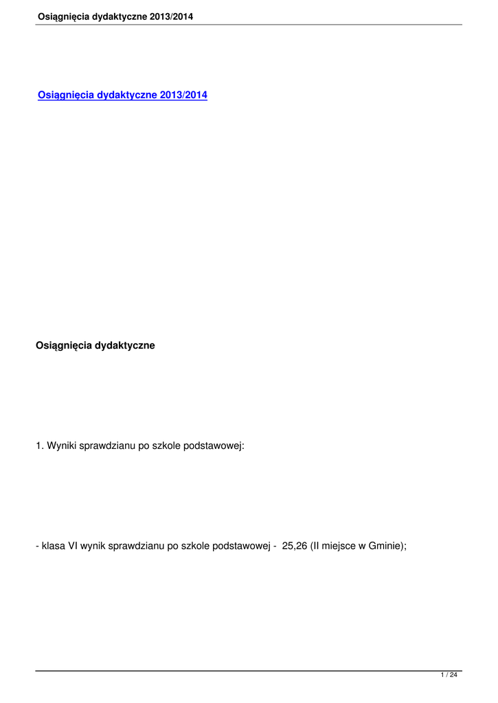 Osiągnięcia dydaktyczne 2013/2014 Osiągnięcia dydaktyczne 2013/2014 Osiągnięcia dydaktyczne 1. Wyniki sprawdzianu po szkole podstawowej: - klasa VI wynik sprawdzianu po szkole podstawowej - 25,26 (II miejsce w Gminie); 1 / 24 Osiągnięcia dydaktyczne 2013/2014 2. Badanie uczniów klasy V przez AUP w Kwidzynie: I miejsce w gminie umiejętności polonistyczne 3. Badanie uczniów klasy III II miejsce w gminie 4. Osiągnięcia w konkursach: Nazwa konkursu Lokata 2 / 24 Osiągnięcia dydaktyczne 2013/2014 Międzynarodowy Konkurs KANGUR MATEMATYCZNY Nagroda organizatora XI Edycja Ogólnopolskiego Konkursu Twórczości Plastycznej Dzieci „Moja Mała Ojczyzna” Nagroda Główna, wyróżnienie V Finał Jubileuszowej Edycji Konkursu ODKRYWAMY TALENTY Wyróżnienie Ogólnopolska Olimpiada Wiedzy O Janie Pawle II Wyróżnienie Ogólnopolski Konkurs „Ratujemy Życie” udział 3 / 24 Osiągnięcia dydaktyczne 2013/2014 Ogólnopolski Konkurs Plastyczno – Komputerowy „Pomyśl zanim wrzucisz - dbaj o swoją tożsamość” Udział Wojewódzki etap konkursu „Szlakiem pomorskich baśni i legend” Zakwalifikowanie i udział dwóch uczniów Wojewódzki Konkurs Twórczości Regionalnej Dzieci i Młodzieży pn. MÓJ REGION II, wyróżnienie Regionalny Konkurs Wiedzy Historycznej POWIŚLE I KWIDZYN II Wojewódzki Konkurs Plastyczny WIELKANOC NA POMORZU wyróżnienie 4 / 24 Osiągnięcia dydaktyczne 2013/2014 Rejonowy Konkurs Plastyczny dla klas I-III-bohaterowie mojego podręcznika zwiedzają Londyn II miejsce Międzyszkolny Konkurs Wiem Prawie Wszystko czyli „1z12” III Powiatowy Konkurs Plastyczny SZKOŁA BEZ PRZEMOCY – AKTYWNIE PO ZDROWIE I Powiatowy Konkurs Poetycki Mój region – miejscowość, w której mieszkam” II miejsce, wyróżnienie Powiatowy Konkurs Plastyczny „Co mnie zachwyca zimą” I Konkurs Recytatorski Szkół Wiejskich Powiatu Kwidzyńskiego WIERSZOMANIAK 5 / 24 Osiągnięcia dydaktyczne 2013/2014 III Powiatowy Konkurs Recytatorski Szkół Wiejskich III VII Powiatowy Konkurs Poetycki ZIEMIA NASZYM SKARBEM Wyróżnienie Powiatowy Konkurs Matematyczny ALFA I OMEGA 2014 udział Młodzież zapobiega pożarom-konkurs ogólnopolski -etap gminny: I, II, III miejsce 6 / 24 Osiągnięcia dydaktyczne 2013/2014 -etap powiatowy: I, III, VI miejsce Zakwalifikowanie się i udział ucznia w eliminacjach wojewódzkich Powiatowe Potyczki Matematyczne udział Powiatowy Konkurs BYSTRZAK III Powiatowy Turniej Wiedzy i Umiejętności Informatycznych Udział Powiatowy Konkurs Historyczny „BAWIMY SIĘ HIOSTORIĄ POLSKI” dla klas IV - VI IV 7 / 24 Osiągnięcia dydaktyczne 2013/2014 Powiatowy Konkurs Historyczny „BAWIMY SIĘ HIOSTORIĄ POLSKI” dla klas II - III II Turniej BRD III Powiatowy Konkurs Czytelniczy „Polscy Poeci i pisarze dzieci i młodzieży – Maria Kownacka” III Powiatowy Konkurs Plastyczny „Co mnie zachwyca zimą?” Wyróżnienie Powiatowy Konkurs Frazeologiczny V 8 / 24 Osiągnięcia dydaktyczne 2013/2014 Powiatowy Konkurs Czytelniczy „W krainie Fantazji” Wyróżnienie Powiatowy Konkurs Plastyczno – Literacki „Szkoła bez przemocy- aktywnie po zdrowie” Wyróżnienie Powiatowy Konkurs Plastyczny Jan Paweł II Wyróżnienie Powiatowy Konkurs Walentynkowy Wyróżnienie Powiatowy Konkurs Poetycki „Mój Region” Wyróżnienie 9 / 24 Osiągnięcia dydaktyczne 2013/2014 Powiatowe Zawody Sportowe MAŁY OLIMPIJCZYK V Międzyszkolny Konkurs Poezji i Prozy o Ojczyźnie IV Powiatowy Konkurs Języka Angielskiego udział Mistrzostwa Powiatu LA w rzucie piłeczką palantową dziewcząt I Mistrzostwa Powiatu LA w rzucie piłeczką palantową chłopców II, V Mistrzostwa Powiatu w Piłce Ręcznej Chłopców 10 / 24 Osiągnięcia dydaktyczne 2013/2014 VI Mistrzostwa Powiatu LA w biegu na 300 m V TEATRALIA Rakowiec 2014 Udział Turniej Feryjny w Halowej Piłce Nożnej Szkół Podstawowych w Kwidzynie I Turniej Piłki Nożnej o Puchar Wójta Gminy Kwidzyn IV Gminny Konkurs Wiedzy z Wychowania Zdrowotnego 11 / 24 Osiągnięcia dydaktyczne 2013/2014 II Gminny Konkurs Plastyczny „Majowe święta w historii Polski – Barwy Narodowe – święto Konstytucji” I Kolory Wolności – konkurs plastyczny ogłoszony przez Ministra Edukacji Narodowej Udział 5. Realizacja innowacji pedagogicznych: • Zajęcia czytelniczo – ortograficzne „Nie taki diabeł straszny”; 12 / 24 Osiągnięcia dydaktyczne 2013/2014 • Powiatowy Konkurs czytelniczy dla klas III – IV; • Poznajemy legendy polskie; • „Polubić ortografię”. II. Działania wychowawczo-opiekuńcze 13 / 24 Osiągnięcia dydaktyczne 2013/2014 1. Udział w projektach: • Szkoła otrzymała Certyfikat Ministerstwa Edukacji Narodowej za udział w projekcie SZKOŁA W RUCHU; • Certyfikat LEPSZA SZKOŁA – za udział w projekcie Wydawnictwa GWO; • Realizacja projektu firmy Danone; • Realizacja we współpracy z Biblioteką Publiczną w Korzeniewie projektu „PAKUJEMY WALIZKĘ - W PODRÓŻ NA CAŁE ŻYCIE”. 2. Wycieczki: 14 / 24 Osiągnięcia dydaktyczne 2013/2014 • Wycieczka na Festyn Archeologiczny w Biskupinie oraz do Muzeum Kolejki Wąskotorowej w Wenecji; • Wycieczka edukacyjna na Kaszuby „Od ziarenka do bochenka”; • Wycieczka do Teatru w Grudziądzu na bajkę „Zatruta studnia”; • Wycieczka na Moskiewską Rewię na Lodzie do Gdańska; • Wiosenny Rajd Pieszy im. Haliny Klein; 15 / 24 Osiągnięcia dydaktyczne 2013/2014 • Wycieczka Kraków – Pieniny; • Pobyt w Zielonej Szkole w Brachlewie klasy III; • Całodniowa wycieczka do Gdańska; • Wycieczka do Zamku w Kwidzynie – TKACTWO, POCHÓWKI NA NASZYCH TERENACH. 3. Szkoła zorganizowała: • Powiatowy Konkurs Czytelniczy „W krainie Fantazji”; 16 / 24 Osiągnięcia dydaktyczne 2013/2014 • Powiatowy Konkurs Historyczny „BAWIMY SIĘ HIOSTORIĄ POLSKI” dla klas IV - VI ; • Powiatowy Konkurs Historyczny „BAWIMY SIĘ HIOSTORIĄ POLSKI” dla klas II – III; • Powiatowy Konkurs Języka Angielskiego dla 