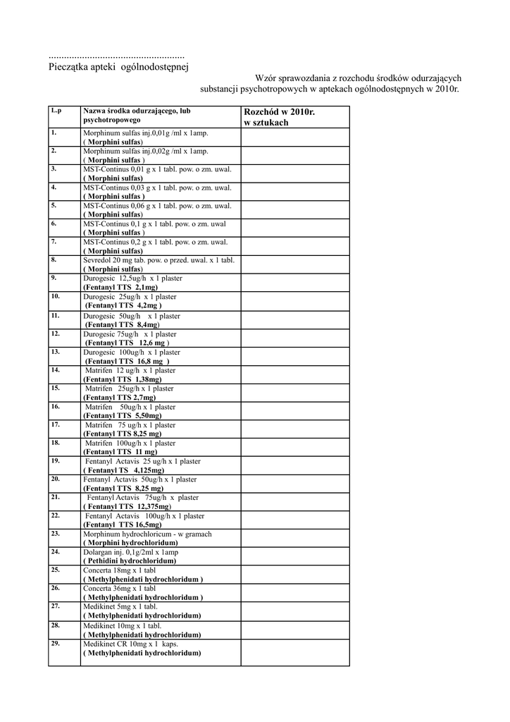 ..................................................... Pieczątka apteki ogólnodostępnej Wzór sprawozdania z rozchodu środków odurzających substancji psychotropowych w aptekach ogólnodostępnych w 2010r. L.p Nazwa środka odurzającego, lub psychotropowego 1. Morphinum sulfas inj.0,01g /ml x 1amp. ( Morphini sulfas) Morphinum sulfas inj.0,02g /ml x 1amp. ( Morphini sulfas ) MST-Continus 0,01 g x 1 tabl. pow. o zm. uwal. ( Morphini sulfas) MST-Continus 0,03 g x 1 tabl. pow. o zm. uwal. ( Morphini sulfas ) MST-Continus 0,06 g x 1 tabl. pow. o zm. uwal. ( Morphini sulfas) MST-Continus 0,1 g x 1 tabl. pow. o zm. uwal ( Morphini sulfas ) MST-Continus 0,2 g x 1 tabl. pow. o zm. uwal. ( Morphini sulfas) Sevredol 20 mg tab. pow. o przed. uwal. x 1 tabl. ( Morphini sulfas) Durogesic 12,5ug/h x 1 plaster (Fentanyl TTS 2,1mg) Durogesic 25ug/h x 1 plaster (Fentanyl TTS 4,2mg ) Durogesic 50ug/h x 1 plaster (Fentanyl TTS 8,4mg) Durogesic 75ug/h x 1 plaster (Fentanyl TTS 12,6 mg ) Durogesic 100ug/h x 1 plaster (Fentanyl TTS 16,8 mg ) Matrifen 12 ug/h x 1 plaster (Fentanyl TTS 1,38mg) Matrifen 25ug/h x 1 plaster (Fentanyl TTS 2,7mg) Matrifen 50ug/h x 1 plaster (Fentanyl TTS 5,50mg) Matrifen 75 ug/h x 1 plaster (Fentanyl TTS 8,25 mg) Matrifen 100ug/h x 1 plaster (Fentanyl TTS 11 mg) Fentanyl Actavis 25 ug/h x 1 plaster ( Fentanyl TS 4,125mg) Fentanyl Actavis 50ug/h x 1 plaster (Fentanyl TTS 8,25 mg) Fentanyl Actavis 75ug/h x plaster ( Fentanyl TTS 12,375mg) Fentanyl Actavis 100ug/h x 1 plaster (Fentanyl TTS 16,5mg) Morphinum hydrochloricum - w gramach ( Morphini hydrochloridum) Dolargan inj. 0,1g/2ml x 1amp ( Pethidini hydrochloridum) Concerta 18mg x 1 tabl ( Methylphenidati hydrochloridum ) Concerta 36mg x 1 tabl ( Methylphenidati hydrochloridum ) Medikinet 5mg x 1 tabl. ( Methylphenidati hydrochloridum) Medikinet 10mg x 1 tabl. ( Methylphenidati hydrochloridum) Medikinet CR 10mg x 1 kaps. ( Methylphenidati hydrochloridum) 2. 3. 4. 5. 6. 7. 8. 9. 10. 11. 12. 13. 14. 15. 16. 17. 18. 19. 20. 21. 22. 23. 24. 25. 26. 27. 28. 29. Rozchód w 2010r. w sztukach 30. 31. 32. 33. 34. 35. 36. 37. 38. 39. 40. 41. 42. 43. 44. 45. 46. 47 48. Methadone hydrochloride 0,1% syrop x 1ml ( Methadonum) Pentazocinum inj. 0,03g/ml x 1 amp. ( Pentazocinu hydrochloridum) Bunondol 0,2mg x 1tabl ( Buprenorphini hydrochloridum ) Bunondol 0,4mg x 1 tabl ( Buprenorphini hydrochloridum) Bunondol inj. 0,3mg/1ml x 1 amp. ( Buprenorphini hydrochloridum) Dolforin 25ug/h x 1 plaster (Fentanyl TTS 4,8mg) Dolforin 50ug/h x 1 plaster (Fentanyl TTS 9,6mg) Doforin 75ug/h x 1 plaster (Fentanyl TTS 14,4 mg ) Dolforin 100ug/h x 1 plaster (Fentanyl TTS 19,2mg) Fenta MX 25ug/h x 1 plaster (Fentanyl TTS 5,78 mg) Fenta MX 50ug/h x 1 plaster (Fentanyl TTS 11,56 mg) Fenta MX 75ug/h x 1 plaster (Fentanyl TTS 17,34 mg) Fenta MX 100ug/h x 1 plaster (Fentanyl TTS 23,12 mg) Doltard tabl. o przed. uwal. 0,01 g x 1 tabl. (Morphini sulfas) Doltard tabl. o przed. uwal. 0,03 g x 1 tabl. ( Morphini sulfas) Doltard tabl. o przed. uwal. 0,06 g x 1 tabl. (Morphini sulfas) DHC Continus 60 mg x 1 tabl ( Dihydrocodeini tartas) DHC Continus 90mg x 1 tabl ( Dihydrocodeini tartas) DHC Continus 120mg x 1 tabl ( Dihydrocodeini tartas) 49. 50. 51. 52. 53. 54. 55. Data, podpis i pieczątka kierownika apteki Uwagi! Proszę o czytelne wypełnienie i odesłanie w terminie do 20 stycznia 2011r., na adres: Wojewódzki Inspektorat Farmaceutyczny 40-074 Katowice, ul. Raciborska 15 tel. 032) 204-89-95. 1. W przypadku braku rozchodu proszę zostawić puste miejsce / nie wpisywać zera / 2. Przeterminowanych i zutylizowanych środków odurzających i psychotropowych proszę nie ujmować w rozchodzie. 3. W przypadku rozchodu środka nie ujętego w zestawieniu proszę wpisać w wolne miejsce.