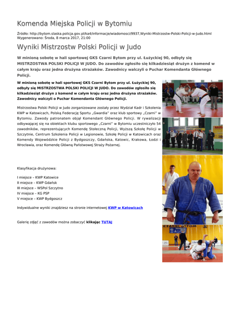 Komenda Miejska Policji w Bytomiu Źródło: http://bytom.slaska.policja.gov.pl/ka4/informacje/wiadomosci/9937,Wyniki-Mistrzostw-Polski-Policji-w-Judo.html Wygenerowano: Środa, 8 marca 2017, 21:00 Wyniki Mistrzostw Polski Policji w Judo W minioną sobotę w hali sportowej GKS Czarni Bytom przy ul. Łużyckiej 90, odbyły się MISTRZOSTWA POLSKI POLICJI W JUDO. Do zawodów zgłosiło się kilkadziesiąt drużyn z komend w całym kraju oraz jedna drużyna strażaków. Zawodnicy walczyli o Puchar Komendanta Głównego Policji. W minioną sobotę w hali sportowej GKS Czarni Bytom przy ul. Łużyckiej 90, odbyły się MISTRZOSTWA POLSKI POLICJI W JUDO. Do zawodów zgłosiło się kilkadziesiąt drużyn z komend w całym kraju oraz jedna drużyna strażaków. Zawodnicy walczyli o Puchar Komendanta Głównego Policji. Mistrzostwa Polski Policji w Judo zorganizowane zostały przez Wydział Kadr i Szkolenia KWP w Katowicach, Polską Federację Sportu „Gwardia” oraz klub sportowy „Czarni” w Bytomiu. Zawody patronatem objął Komendant Głównego Policji. W rywalizacji odbywającej się na obiektach klubu sportowego „Czarni” w Bytomiu uczestniczyło 54 zawodników, reprezentujących Komendę Stołeczną Policji, Wyższą Szkołę Policji w Szczytnie, Centrum Szkolenia Policji w Legionowie, Szkołę Policji w Katowicach oraz Komendy Wojewódzkie Policji z Bydgoszczy, Gdańska, Katowic, Krakowa, Łodzi i Wrocławia, oraz Komendę Główną Państwowej Straży Pożarnej. Klasyfikacja drużynowa: I miejsce – KWP Katowice II miejsce – KWP Gdańsk III miejsce – WSPol Szczytno IV miejsce – KG PSP V miejsce – KWP Bydgoszcz Indywidualne wyniki znajdziesz na stronie internetowej KWP w Katowicach Galerię zdjęć z zawodów można zobaczyć klikając TUTAJ Ocena: 0/5 (0) Tweetnij