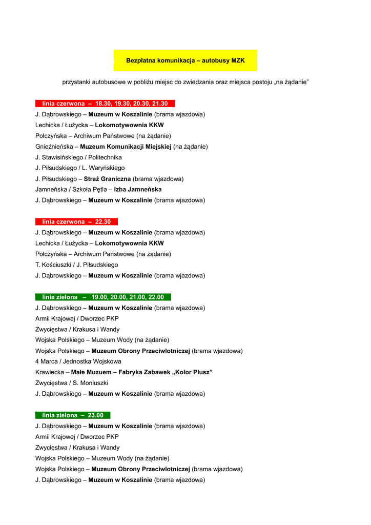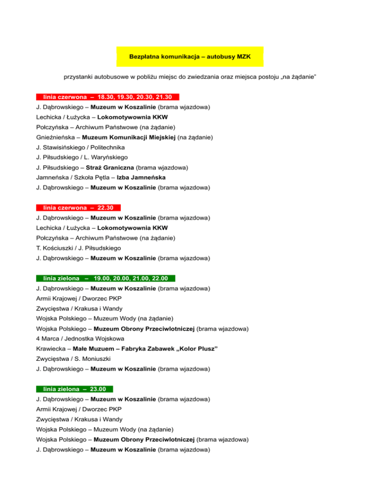 Bezpłatna komunikacja – autobusy MZK przystanki autobusowe w pobliżu miejsc do zwiedzania oraz miejsca postoju „na żądanie” linia czerwona – 18.30, 19.30, 20.30, 21.30 J. Dąbrowskiego – Muzeum w Koszalinie (brama wjazdowa) Lechicka / Łużycka – Lokomotywownia KKW Połczyńska – Archiwum Państwowe (na żądanie) Gnieźnieńska – Muzeum Komunikacji Miejskiej (na żądanie) J. Stawisińskiego / Politechnika J. Piłsudskiego / L. Waryńskiego J. Piłsudskiego – Straż Graniczna (brama wjazdowa) Jamneńska / Szkoła Pętla – Izba Jamneńska J. Dąbrowskiego – Muzeum w Koszalinie (brama wjazdowa) linia czerwona – 22.30 J. Dąbrowskiego – Muzeum w Koszalinie (brama wjazdowa) Lechicka / Łużycka – Lokomotywownia KKW Połczyńska – Archiwum Państwowe (na żądanie) T. Kościuszki / J. Piłsudskiego J. Dąbrowskiego – Muzeum w Koszalinie (brama wjazdowa) linia zielona – 19.00, 20.00, 21.00, 22.00 J. Dąbrowskiego – Muzeum w Koszalinie (brama wjazdowa) Armii Krajowej / Dworzec PKP Zwycięstwa / Krakusa i Wandy Wojska Polskiego – Muzeum Wody (na żądanie) Wojska Polskiego – Muzeum Obrony Przeciwlotniczej (brama wjazdowa) 4 Marca / Jednostka Wojskowa Krawiecka – Małe Muzuem – Fabryka Zabawek „Kolor Plusz” Zwycięstwa / S. Moniuszki J. Dąbrowskiego – Muzeum w Koszalinie (brama wjazdowa) linia zielona – 23.00 J. Dąbrowskiego – Muzeum w Koszalinie (brama wjazdowa) Armii Krajowej / Dworzec PKP Zwycięstwa / Krakusa i Wandy Wojska Polskiego – Muzeum Wody (na żądanie) Wojska Polskiego – Muzeum Obrony Przeciwlotniczej (brama wjazdowa) J. Dąbrowskiego – Muzeum w Koszalinie (brama wjazdowa)