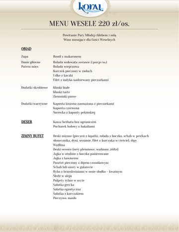 MENU WESELE 220 zł/os. Powitanie Pary Młodej chlebem i solą Wino musujące dla Gości Weselnych OBIAD Zupa Rosół z makaronem Danie główne Patera mięs Rolada wołowa(w zestawie 2 porcje/os.) Rolada wieprzowa Karczek pieczony w ziołach Udko z kaczki Filet z indyka nadziewany pieczarkami Dodatki skrobiowe Kluski białe Kluski tarte Ziemniaki puree Dodatki warzywne Kapusta kiszona zasmażana z pieczarkami Kapusta czerwona Surówka z kapusty pekińskiej DESER Kawa/herbata bez ograniczeń Pucharek lodowy z bakaliami ZIMNY BUFET Deski mięsne (pieczeń z łopatki, rolada z boczku, schab w pestkach słonecznika, dyni, sezamie, filet z kurczaka w cieście), dipy Wędlina Deski serowe (sery pleśniowe, wędzone, żółte) Jajka w otulinie z boczku panierowane Jajka z kawiorem Pasztet pieczony z dipem czosnkowym Schab lub ozory w galarecie Ryba z brzoskwiniami w sosie słodko - kwaśnym Śledź w oleju Pulpety rybne w occie Sałatka grecka Sałatka egzotyczna Sałatka z kurczakiem Pieczywo, masło I KOLACJA Patery mięs i ryb Filet z kurczaka nadziewany ananasem i serem Karczek w czosnku Szwajcar Golonko peklowane pieczone Ryba ze szpinakiem (w zestawie 1 porcja/os.) Dodatki skrobiowe Frytki Ziemniaki opiekane Ziemniaki puree Dodatki warzywne Zestaw surówek Bukiet warzyw gotowanych z sosem cytrynowo - serowym II KOLACJA Żurek w chlebie III KOLACJA Strogonow Poprawiny OBIAD Zupa Krem brokułowy z groszkiem ptysiowym Danie główne Patera mięs Karczek (w zestawie 1porcja/os.) Kotlet schabowy panierowany Dodatki skrobiowe: Kluski białe Kluski tarte Ziemniaki puree Dodatki warzywne Kapusta kiszona zasmażana z pieczarkami Surówka z czerwonej kapusty Surówka z białej kapusty DESER Kawa/herbata bez ograniczeń Panna cotta z sosem malinowym ZIMNY BUFET Deski mięsne (pieczeń z łopatki, schab w pestkach słonecznika, dyni, sezamie, filet z kurczaka w cieście) Wędlina Deski serowe (sery pleśniowe, wędzone, żółte) Galantyna z drobiu Roladki z szynki z musem chrzanowym nadziewane szparagami Ryba po grecku Śledź w śmietanie z jabłkiem Sałatka z tuczykiem Sałatka brokułowa Pieczywo, masło KOLACJA Barszcz czerwony z pasztecikiem