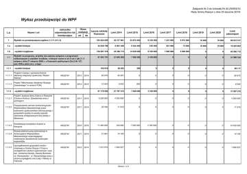 Załącznik Nr 2 do Uchwały Nr XLVIII/503/14 Rady Gminy Raszyn z dnia 30 stycznia 2014r Wykaz przedsięwzięć do WPF L.p. 1 Nazwa i cel - wydatki bieżące 1.b - wydatki majątkowe 1.1.1 Okres realizacji od do Wydatki na przedsięwzięcia-ogółem (1.1+1.2+1.3) 1.a 1.1 Jednostka odpowiedzialna lub koordynująca Wydatki na programy, projekty lub zadania związane z programami realizowanymi z udziałem środków, o których mowa w art.5 ust.1 pkt 2 i 3 ustawy z dnia 27 sierpnia 2009.r. o finansach publicznych (Dz.U.Nr 157, poz.1240,z późn.zm.), z tego: - wydatki bieżące Łączne nakłady finansowe Limit 2014 Limit 2015 Limit 2016 Limit 2017 Limit 2018 Limit 2019 Limit zobowiązań Limit 2020 183 024 085 43 317 961 23 874 492 9 318 300 7 221 000 5 073 840 76 800 79 800 89 012 517 32 026 709 8 961 246 9 344 492 218 300 221 000 73 840 76 800 79 800 19 025 802 150 997 376 34 356 715 14 530 000 9 100 000 7 000 000 5 000 000 0 0 69 986 715 91 283 701 21 845 508 7 000 500 3 100 000 0 0 0 0 31 996 332 104 619 48 293 500 0 0 0 0 0 99 117 1.1.1.1 Program rozwoju i upowszechniania aktywnej integreacji społecznej "Razem Raźniej" RASZYN 2013 2014 92 615 42 291 0 0 0 0 0 0 92 615 1.1.1.2 Projekt "Włochowska Akademia Rozwoju Zawodowego" w ramach POKL RASZYN 2013 2015 12 004 6 002 500 0 0 0 0 0 6 502 91 179 082 21 797 215 7 000 000 3 100 000 0 0 0 0 31 897 215 1.1.2 1.1.2.1 1.1.2.2 1.1.2.3 1.1.2.4 1.1.2.5 - wydatki majątkowe Projekt i budowa domu Kultury w Raszynie (Centrum Kultury i Dziedzictwa) wraz z parkingiem Przyspieszenie wzrostu konkurencyjności Województwa Mazowieckiego przez budowanie społeczeństwa informacyjnego i gospodarki opartej na wiedzy poprzez stworzenie zintegrowanych baz wiedzy o Mazowszu Rewitalizacja kompleksu Austerii w Raszynie Rozwój elektronicznej administracji w Samorządach Województwa Mazowieckiego wspomagającej niwelowanie dwudzielności potencjału województw Uporządkowanie gospodarki wodno ściekowej w Gminie Raszyn II Faza w szczególności studium wykonalności i wyk. kan. sanitarnej Dawidy, Dawidy Bankowe (ul. Warszawska i ul. Starzyńskiego wraz z ulicami przyległymi) oraz Łady i Falenty ul. Falencka RASZYN 2011 2014 8 200 000 4 200 000 0 0 0 0 0 0 4 200 000 RASZYN 2011 2014 29 790 11 518 0 0 0 0 0 0 11 518 RASZYN 2010 2016 11 400 000 330 000 7 000 000 3 100 000 0 0 0 0 10 430 000 RASZYN 2011 2014 31 991 14 105 0 0 0 0 0 0 14 105 RASZYN 2012 2014 7 231 974 1 840 527 0 0 0 0 0 0 1 840 527 Strona 1 z 5 1.1.2.6 Uporządkowanie gospodarki wodno ściekowej w Gminie Raszyn (I faza) 1.1.2.7 Uporządkowanie gospodarki wodnościekowej w Gminie Raszyn III Faza 1.1.2.8 Uporządkowanie gospodarki wodnościekowej w Gminie Raszyn IV Faza 2006 2014 61 785 327 13 901 065 0 0 0 0 0 0 13 901 065 RASZYN 2013 2014 2 100 000 1 200 000 0 0 0 0 0 0 1 200 000 RASZYN 2013 2014 400 000 300 000 0 0 0 0 0 0 300 000 Wydatki na programy, projekty lub zadania związane z umowami partnerstwa publiczno-prywatnego, z tego: 0 0 0 0 0 0 0 0 0 1.2.1 - wydatki bieżące 0 0 0 0 0 0 0 0 0 1.2.2 - wydatki majątkowe 1.2 1.3 1.3.1 0 0 0 0 0 0 0 0 0 Wydatki na programy, projekty lub zadania pozostałe (inne niż wymienione w pkt 1.1 i 1.2),z tego 91 740 384 21 472 453 16 873 992 6 218 300 7 221 000 5 073 840 76 800 79 800 57 016 185 - wydatki bieżące 31 922 090 8 912 953 9 343 992 218 300 221 000 73 840 76 800 79 800 18 926 685 1.3.1.1 Dofinansowanie 50% studiów pracownika RASZYN 2012 2015 6 300 2 100 350 0 0 0 0 0 2 450 1.3.1.2 Dofinansowanie transportu autobusowego na terenie Gminy RASZYN 2011 2015 13 202 672 2 975 653 2 967 192 0 0 0 0 0 5 942 845 1.3.1.3 Dowóz dzieci do szkół w roku szkolnym 2013/2014 RASZYN 2013 2015 730 000 360 000 370 000 0 0 0 0 0 730 000 1.3.1.4 Dożywianie dzieci/ obiady dla uczniów szkół gminnych RASZYN 2012 2015 1 055 000 344 000 350 000 0 0 0 0 0 694 000 Dzierżawa nieruchomości o powierzchni 1800m2 zabudowanej budynkiem o powierzchni 355m, na potrzeby Gminnego Przedszkola w Dawidach RASZYN 2010 2020 674 068 63 200 65 700 68 300 71 000 73 840 76 800 79 800 498 640 1.3.1.6 Konserwacja i bieżąca obsługa fontanny RASZYN 2013 2015 5 000 2 500 2 500 0 0 0 0 0 5 000 1.3.1.7 Konserwacja oświetlenia ulicznego RASZYN 2013 2015 1 130 000 380 000 380 000 0 0 0 0 0 760 000 1.3.1.8 Obsługa serwisowa kopiarki Konica Minolta bizhub C220 RASZYN 2012 2015 35 800 12 000 12 000 0 0 0 0 0 24 000 1.3.1.9 Ochrona budynków/Austerii RASZYN 2013 2015 170 000 85 000 85 000 0 0 0 0 0 170 000 RASZYN 2013 2015 150 000 75 000 75 000 0 0 0 0 0 150 000 RASZYN 2014 2015 100 000 50 000 50 000 0 0 0 0 0 100 000 1.3.1.5 1.3.1.10 Ochrona budynku Urzędu Gminy 1.3.1.11 Opieka nad dziećmi dowożonymi do szkół w roku szkolnym 2014-2015 Strona 2 z 5 1.3.1.12 Plany zagospodarowania przestrzennego RASZYN 2011 2017 1 824 000 363 000 215 000 150 000 150 000 0 0 0 878 000 RASZYN 2011 2015 386 250 82 500 83 250 0 0 0 0 0 165 750 RASZYN 2013 2014 0 0 0 0 0 0 0 0 0 RASZYN 2012 2015 2 208 000 270 000 300 000 0 0 0 0 0 570 000 Selektywna zbiórka odpadów (w tym 1.3.1.16 realizacja ustawy z dnia 01 lipca 2011r o zmianie ustawy o utrzymaniu czystosci i porządku w gminie RASZYN 2013 2015 7 538 000 2 538 000 3 000 000 0 0 0 0 0 5 538 000 Serwis i utrzymanie aplikacji 1.3.1.17 wspomagającej (programu) dot. gospodarki odpadami komunalnymi RASZYN 2013 2015 15 000 5 000 5 000 0 0 0 0 0 10 000 1.3.1.18 Utrzymanie czystości na terenie gminy RASZYN 2013 2015 1 072 000 500 000 572 000 0 0 0 0 0 1 072 000 1.3.1.19 wynajem kontenerów wraz z transportem RASZYN 2013 2014 8 000 4 000 0 0 0 0 0 0 4 000 Wywóz nieczystości z budynków komunalnych RASZYN 2013 2015 60 000 30 000 30 000 0 0 0 0 0 60 000 1.3.1.21 Wywóz nieczystości z gimnazjum RASZYN 2013 2015 20 000 10 000 10 000 0 0 0 0 0 20 000 1.3.1.22 Wywóz nieczystości z GOPS-u RASZYN 2013 2015 2 000 1 000 1 000 0 0 0 0 0 2 000 1.3.1.23 Wywóz nieczystości z GOS-u RASZYN 2013 2015 20 000 10 000 10 000 0 0 0 0 0 20 000 Wywóz nieczystości z Ogniska