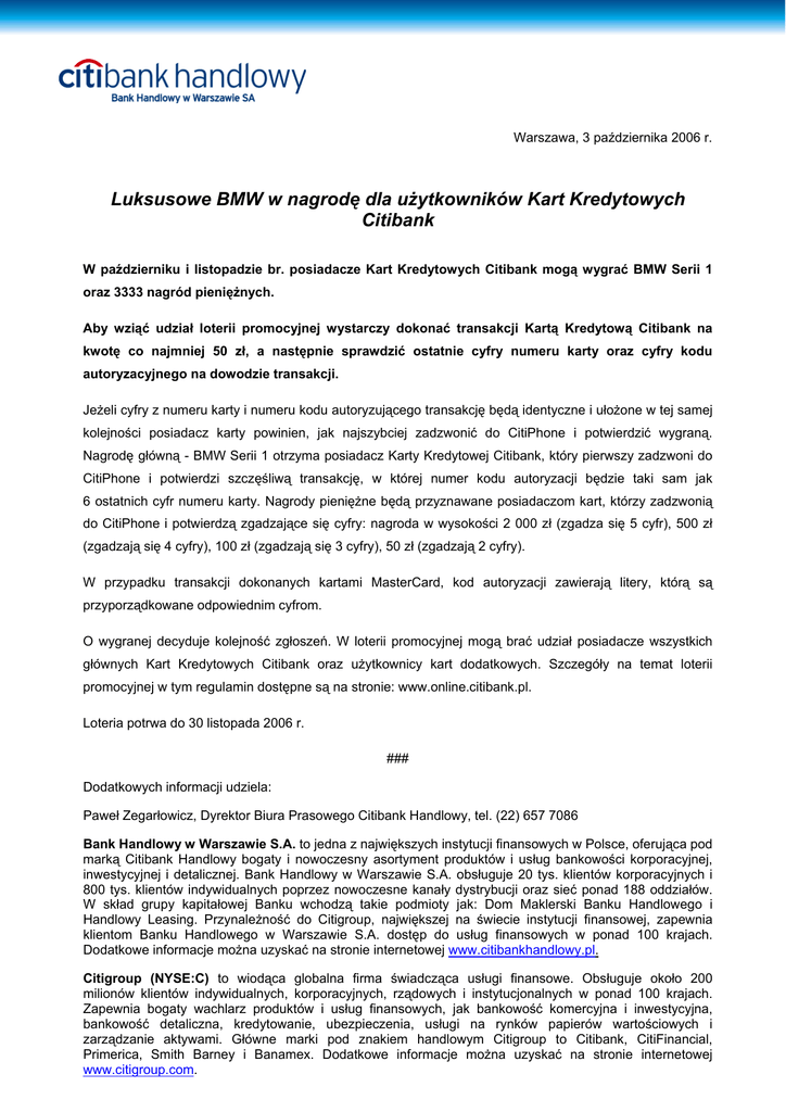 Warszawa, 3 października 2006 r. Luksusowe BMW w nagrodę dla użytkowników Kart Kredytowych Citibank W październiku i listopadzie br. posiadacze Kart Kredytowych Citibank mogą wygrać BMW Serii 1 oraz 3333 nagród pieniężnych. Aby wziąć udział loterii promocyjnej wystarczy dokonać transakcji Kartą Kredytową Citibank na kwotę co najmniej 50 zł, a następnie sprawdzić ostatnie cyfry numeru karty oraz cyfry kodu autoryzacyjnego na dowodzie transakcji. Jeżeli cyfry z numeru karty i numeru kodu autoryzującego transakcję będą identyczne i ułożone w tej samej kolejności posiadacz karty powinien, jak najszybciej zadzwonić do CitiPhone i potwierdzić wygraną. Nagrodę główną - BMW Serii 1 otrzyma posiadacz Karty Kredytowej Citibank, który pierwszy zadzwoni do CitiPhone i potwierdzi szczęśliwą transakcję, w której numer kodu autoryzacji będzie taki sam jak 6 ostatnich cyfr numeru karty. Nagrody pieniężne będą przyznawane posiadaczom kart, którzy zadzwonią do CitiPhone i potwierdzą zgadzające się cyfry: nagroda w wysokości 2 000 zł (zgadza się 5 cyfr), 500 zł (zgadzają się 4 cyfry), 100 zł (zgadzają się 3 cyfry), 50 zł (zgadzają 2 cyfry). W przypadku transakcji dokonanych kartami MasterCard, kod autoryzacji zawierają litery, którą są przyporządkowane odpowiednim cyfrom. O wygranej decyduje kolejność zgłoszeń. W loterii promocyjnej mogą brać udział posiadacze wszystkich głównych Kart Kredytowych Citibank oraz użytkownicy kart dodatkowych. Szczegóły na temat loterii promocyjnej w tym regulamin dostępne są na stronie: www.online.citibank.pl. Loteria potrwa do 30 listopada 2006 r. ### Dodatkowych informacji udziela: Paweł Zegarłowicz, Dyrektor Biura Prasowego Citibank Handlowy, tel. (22) 657 7086 Bank Handlowy w Warszawie S.A. to jedna z największych instytucji finansowych w Polsce, oferująca pod marką Citibank Handlowy bogaty i nowoczesny asortyment produktów i usług bankowości korporacyjnej, inwestycyjnej i detalicznej. Bank Handlowy w Warszawie S.A. obsługuje 20 tys. klientów korporacyjnych i 800 tys. klientów indywidualnych poprzez nowoczesne kanały dystrybucji oraz sieć ponad 188 oddziałów. W skład grupy kapitałowej Banku wchodzą takie podmioty jak: Dom Maklerski Banku Handlowego i Handlowy Leasing. Przynależność do Citigroup, największej na świecie instytucji finansowej, zapewnia klientom Banku Handlowego w Warszawie S.A. dostęp do usług finansowych w ponad 100 krajach. Dodatkowe informacje można uzyskać na stronie internetowej www.citibankhandlowy.pl. Citigroup (NYSE:C) to wiodąca globalna firma świadcząca usługi finansowe. Obsługuje około 200 milionów klientów indywidualnych, korporacyjnych, rządowych i instytucjonalnych w ponad 100 krajach. Zapewnia bogaty wachlarz produktów i usług finansowych, jak bankowość komercyjna i inwestycyjna, bankowość detaliczna, kredytowanie, ubezpieczenia, usługi na rynków papierów wartościowych i zarządzanie aktywami. Główne marki pod znakiem handlowym Citigroup to Citibank, CitiFinancial, Primerica, Smith Barney i Banamex. Dodatkowe informacje można uzyskać na stronie internetowej www.citigroup.com.