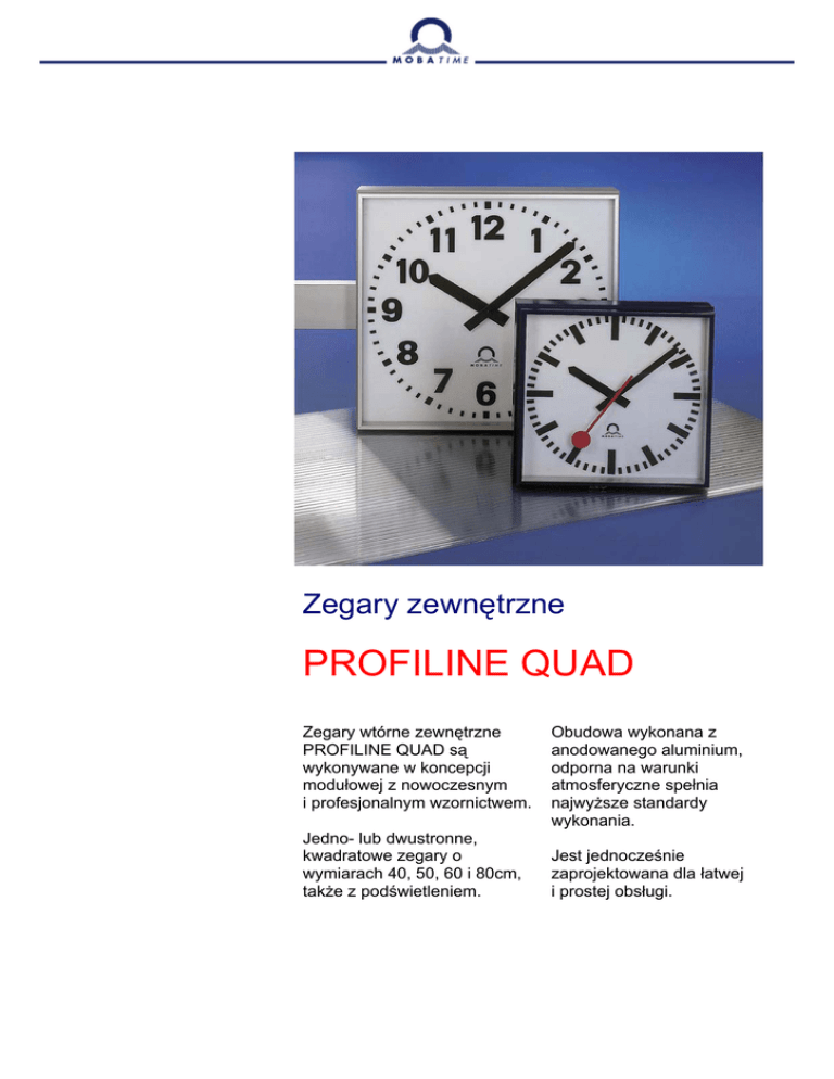 Zegary zewnętrzne PROFILINE QUAD Zegary wtórne zewnętrzne PROFILINE QUAD są wykonywane w koncepcji modułowej z nowoczesnym i profesjonalnym wzornictwem. Jedno- lub dwustronne, kwadratowe zegary o wymiarach 40, 50, 60 i 80cm, także z podświetleniem. Obudowa wykonana z anodowanego aluminium, odporna na warunki atmosferyczne spełnia najwyższe standardy wykonania. Jest jednocześnie zaprojektowana dla łatwej i prostej obsługi. Typy wykonań PROFILINE QUAD Mocowanie ścienne (E), jednostronne ∅ cm A mm B mm C mm Waga ca.kg 40 446 155 175 10 50 546 205 225 15 60 646 255 275 22 80 846 355 375 34 ∅ cm A mm B mm Waga ca.kg 40 446 364 10 50 546 464 15 60 646 564 22 80 846 864 34 ∅ cm A mm B mm C mm Waga ca.kg 40 446 150 400 22 50 546 180 500 27 60 646 240 600 38 80 846 320 800 60 Ścienne (W), sufitowe (D) lub gniazdowe (S) mocowanie, dwustronny Wysięgnik ścienny (WA) lub wysięgnik sufitowy (DA), dwustronny Mocowanie centralne na słupie (ZM), dwustronny ∅ cm A mm Waga ca.kg 50 546 26 60 646 34 80 846 55 ∅ cm A mm Waga ca.kg 50 546 20 60 646 28 Mocowanie boczne na słupie (SM), dwustronny