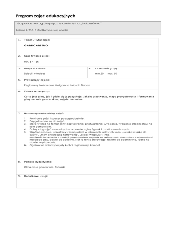 Program zajęć edukacyjnych Gospodarstwo agroturystyczne osada leśna „Doboszówka” Kalenne 9, 23-310 Modliborzyce, woj. lubelskie 1. Temat / tytuł zajęć: GARNCARSTWO 2. Czas trwania zajęć: min. 3 h – 5h 3. Grupa docelowa: 4. Dzieci i młodzież 5. Liczebność grupy: min.20 max. 50 Prowadzący zajęcia: Regionalny twórca oraz Małgorzata i Marcin Dobosz 6. Zakres tematyczny: Co to jest glina, jak i gdzie się ją pozyskuje, jak się przetwarza, etapy przygotowania i formowania gliny na kole garncarskim, zajęcia manualne 7. Harmonogram/przebieg zajęć: 1. 2. 3. 4. 5. 6. 8. Powitanie gości i spacer po gospodarstwie. Przygotowanie się do zajęć. Krótki wykład na temat gliny, pozyskiwania, przetwarzania, wypalania, tworzenie przedmiotów na kole garncarskim. Dalszy ciąg zajęć manualnych – tworzenie z gliny figurek i ozdób ceramicznych. Wspólna zabawa. Uczestnicy wezmą udział w zabawach ludowych: m.in. „uciekaj myszko do dziury”, „mam chusteczkę haftowaną”, „ojciec Wirgiliusz” i inne. Możliwość korzystania z atrakcji gospodarstwa: zagrody ze zwierzętami, plac zabaw z elementami małpiego gaju, boisko do siatkówki, stół to tenisa stołowego, rakietki do badmintona, łódka na stawie, wędkowanie. Ognisko lub obiad(specjały kuchni regionalnej), kompot Pomoce dydaktyczne: Glina, koło garncarskie, fartuszki 9. Dodatkowe uwagi: