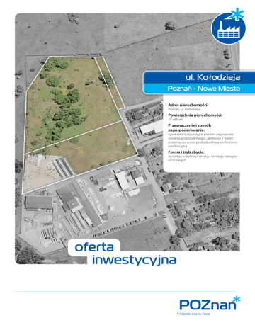ul. Kołodzieja Poznań - Nowe Miasto Adres nieruchomości: Poznań, ul. Kołodzieja Powierzchnia nieruchomości: 25 465 m2 Przeznaczenie i sposób zagospodarowania: zgodnie z miejscowym planem zagospodarowania przestrzennego „Janikowo 1” teren przeznaczony jest pod zabudowę technicznoprodukcyjną Forma i tryb zbycia: sprzedaż w trybie przetargu ustnego nieograniczonego* oferta inwestycyjna Poznań - Nowe Miasto Szczecin Kopenhaga Gdańsk sztokholm BERLIN wrocław praga 1. Oznaczenia geodezyjne: obręb Karolin arkusz 8 działka 2/1, KW PO2P/00101361/7 działka 2/2KW PO2P/00101361/7 działka 3/2 KW PO2P/00137563/4 2. Opis nieruchomości: Położenie położona w strefie peryferyjnej miasta Poznania, przy ul. Kołodzieja o nawierzchni utwardzonej płytami betonowymi Obecne użytkowanie fragment działki 2 o powerzchni 3395 m2 w północno-zachodniej części nieruchomości jest użytkowany bezumownie przez właściciela nieruchomości sąsiedniej; zagospodarowany jest na potrzeby placu składowomagazynowego; teren został dodatkowo ogrodzony siatką metalową, wyposażony w oświetlenie oraz miejscowo utwardzony wylewką betonową pod tunelami magazynowymi Zabudowa na terenie teren zabudowany tunelami magazynowymi Dojazd ul. Kołodzieja Sąsiedztwo bezpośrednie sąsiedztwo stanowią zabudowania o charakterze przemysłowo-usługowym, jednorodzinne budynki mieszkalne oraz tereny niezagospodarowane Biuro Obsługi Inwestorów i Promocji Inwestycji Urząd Miasta Poznania pI. Kolegiacki 17, 61-841 Poznań, Polska tel. +48 61 878 54 28, fax +48 61 878 55 00 [email protected], www.poznan.pl warszawa katowice Uzbrojenie sieć wodociągowa, energetyczna, gazowa - w ulicy; brak sieci kanalizacyjnej w zasięgu 3. Przeznaczenie i sposób zagospodarowania: zgodnie z miejscowym planem zagospodarowania przestrzennego „Janikowo 1” teren przeznaczony jest pod zabudowę technicznoprodukcyjną 4. Informacje dodatkowe: tekst i rysunek planu miejscowego obejmującego ten teren są dostępne na stronie internetowej: www.mpu.pl, integralną częścią mpzp „Janikowo 1” w Poznaniu jest rysunek planu, zatem konieczne jest łączne czytanie części tekstowej i graficznej planu, co da kompletną informację o możliwościach zagospodarowania nieruchomości i ewentualnych ograniczeniach *Powyższe materiały mają charakter informacyjny i nie stanowią oferty w rozumieniu prawa cywilnego **Szczegółowe informacje na temat ceny uzyskać można w Biurze Obsługi Inwestorów i Promocji Inwestycji