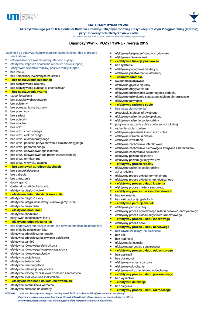 MATERIAŁY DYDAKTYCZNE Akredytowanego przez ICN Centrum Badania i Rozwoju Międzynarodowej Klasyfikacji Praktyki Pielęgniarskiej (ICNP ®) przy Uniwersytecie Medycznym w Łodzi 90-136 136 Łódź, Tel. 42 678 87 53, fax. 42 678 03 67 email: [email protected] Diagnozy/Wyniki POZYTYWNE - wersja 2015 zdolność do zdobywania/pozyskania/otrzymania leku (able able to procure medication) odpowiednie odżywianie (adequate food supply) efektywne wsparcie społeczne (effective effective social support) support (pozytywne wsparcie rodziny) positive family support bez infekcji bez komplikacji związanych ze stomią - bez nadużywania substancji bez nadużywania alkoholu bez nadużywania substancji chemicznych - bez nadużywania tytoniu rzucenie palenia bez obrzęków obwodowych bez odleżyny bez poruszania się bez celu bez przemocy bez sedacji bez ucieczki bez upadku bez urazu bez urazu chemicznego bez urazu elektrycznego bez urazu okołooperacyjnego bez urazu podczas pozycjonowania okołooperacyjnego ooperacyjnego bez urazu popromiennego bez urazu spowodowanego laserem bez urazu spowodowanego przemieszczaniem się bez urazu termicznego bez urazu w wyniku upadku - bez zachowań autodestrukcyjnych bez samookaleczenia bez zatrucia bez zmęczenia dobry apetyt dostęp do środków transportu efektywna ciągłość opieki - efektywna integralność tkanek ciała efektywna ciągłość skóry efektywna integralność błony śluzowej jamy ustnej efektywna masa ciała - efektywna mobilność efektywne chodzenie pozytywna mobilność w łóżku - efektywna odpowiedź na lek bez negatywnej interakcji z lekami (no no adverse medication interaction) interaction bez efektów ubocznych leku efektywna odpowiedź na terapię efektywna odpowiedź na żywienie dojelitowe efektywna pamięć efektywna równowaga elektrolitowa efektywna równowaga kwasowo-zasadowa efektywna równowaga płynów efektywna socjalizacja efektywna świadomość efektywna termoregulacja efektywna tolerancja aktywności efektywna wewnątrzczaszkowa zdolność adaptacyjna efektywna więź opiekuna z dzieckiem - efektywna zdolność do komunikowania się efektywna komunikacja werbalna efektywna zdolność do ochrony LEGENDA: efektywne bezpieczeństwo w środowisku rodowisku efektywne ciśnienie krwi - efektywne funkcje poznawcze bez splątania efektywne podejmowanie decyzji efektywne przetwarzanie informacji - samoświadomość świadomość objawów efektywne gojenie się rany efektywne odgrywanie roli efektywne odstawienie wspomagania oddechu efektywne odzyskanie statusu po zabiegu chirurgicznym efektywne połykanie - efektywne radzenie sobie bez wyparcia (no denial) akceptacja statusu zdrowotnego efektywne radzenie sobie opiekuna efektywne radzenie sobie rodziny pozytywne radzenie sobie społeczno eczności lokalnej radzenie sobie z bólem efektywne ujawnianie informacji o sobie efektywne warunki sanitarne efektywne wzrastanie efektywne zachowanie interaktywne efektywne zachowanie niemowlęcia cia związane zwi z karmieniem efektywne zachowanie seksualne efektywny poziom biblirubiny efektywny poziom glukozy we krwi - efektywny proces rodziny efektywne radzenie sobie rodziny żal w rodzinie efektywny proces układu adu hormonalnego efektywny proces układu adu immunologicznego - efektywny proces układu krążenia efektywny proces mięśnia sercowego - efektywny proces naczyń obwodowych bez krwawienia bez zakrzepicy żył głębokich - efektywna perfuzja tkanek efektywna perfuzja rany efektywny proces obwodowego układu uk nerwowo-naczyniowego efektywny proces układu mięśniowo niowo-szkieletowego - efektywny proces układu adu moczowego efektywny proces nerek - efektywny proces układu adu nerwowego bez zawrotów głowy (no no dizziness) dizziness bez bólu bez nudności efektywna kinestezja efektywna percepcja sensoryczna - efektywny proces układu adu oddechowego bez aspiracji bez duszności efektywna wymiana gazowa efektywne oddychanie efektywne udrożnienie nienie dróg oddechowych - efektywny proces układu adu pokarmowego bez wymiotów - efektywna defekacja bez biegunki - efektywny proces układu adu rozrodczego czcionko koloru granatowego - terminy wersji 2015, w trakcie walidacji pozostawiona wersja ang. Punktory wskazują na miejsce terminu w hierarchii Klasyfikacji, główne terminy oznaczono kolorem żółtym; Interwencje powtarzające się w kilku miejscach efekt hierar ierarchii terminów w Klasyfikacji. DIAGNOZY/WYNIKI POZYTYWNE ICNP wersja 2015, ACBiR ICNP przy UM w Łodzi © str. 2 skurcze macicy w normie (uterine contractions within normal limits) efektywne funkcjonowanie seksualne - efektywny rozwój człowieka efektywny rozwój niemowlęcia (effective foetal development) efektywny rozwój dziecka efektywny rozwój starszej osoby dorosłej efektywny status duchowy - efektywny status fizjologiczny wiedza o rozwoju niemowlęcia (knowledge of foetal development) wiedza o ciąży (knowledge of pregnancy) efektywna pojemność minutowa serca efektywna temperatura ciała efektywny status (wydolność) oddechowy - efektywny status neurologiczny efektywna zdolność odczuwania efektywna zdolność odczuwania smaku efektywna zdolność odczuwania zapachów kontrola bólu efektywny status sercowo-naczyniowy efektywny status układu hormonalnego efektywny status układu mięśniowo-szkieletowego - efektywny status układu pokarmowego trzymanie stolca trzymanie moczu wiedza o odpowiedzi na zabieg (efektach zabiegu) zdolność do rozwoju efektywny status układu moczowo-płciowego gotowość do efektywnego procesu rodziny gotowość do osiągnięcia efektywnego statusu duchowego gotowość do otrzymania wiedzy gotowość do pozytywnego rodzicielstwa gotowość do wypisu jakość życia komfortowy - kontrola objawów kontrola objawów zespołu abstynencyjnego nadzieja nawodnienie adekwatne pozytywna częstość akcji serca pozytywna duma - pozytywna postawa opiekuna efektywne radzenie sobie opiekuna pozytywna postawa wobec opieki p