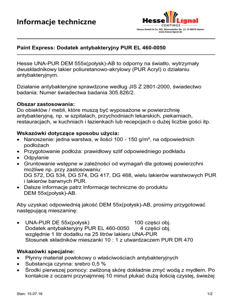 Informacje techniczne Hesse GmbH & Co. KG, Warendorfer Str. 21, D 59075 Hamm www.hesse-lignal.de Paint Express: Dodatek antybakteryjny PUR EL 460-0050 Hesse UNA-PUR DEM 555x(połysk)-AB to odporny na światło, wytrzymały dwuskładnikowy lakier poliuretanowo-akrylowy (PUR Acryl) o działaniu antybakteryjnym. Działanie antybakteryjne sprawdzone według JIS Z 2801-2000, świadectwo badania: Numer świadectwa badania 305.826/2. Obszar zastosowania: Do obiektów / mebli, które muszą być wyposażone w powierzchnię antybakteryjną, np. w szpitalach, przychodniach lekarskich, piekarniach, restauracjach, w kuchniach i łazienkach lub recepcjach o dużej liczbie gości itp. Wskazówki dotyczące sposobu użycia: Nanoszenie: jedna warstwa, w ilości 100 - 150 g/m², na odpowiednich podłożach Przygotowanie podłoża: prawidłowy szlif odpowiedniego podkładu Odpylanie Gruntowanie wstępne w zależności od wymagań dla gotowej powierzchni możliwe np. przy zastosowaniu: DG 572, DG 534, DG 574, DG 417, DG 468, wielu lakierów warstwowych PUR i lakierów barwnych PUR. Dalsze informacje patrz Informacje techniczne do produktu DEM 55x(połysk)-AB. Aby uzyskać odpowiednią jakość DEM 55x(połysk)-AB, prosimy przygotować następującą mieszaninę: UNA-PUR DE 55x(połysk) 100 części obj. Dodatek antybakteryjny PUR EL 460-0050 4 części obj. względnie 1 litr dodatku na 25 litrów lakieru UNA-PUR Stosunek składników mieszanki 10 : 1 z utwardzaczem PUR DR 470 Wskazówki specjalne: Płynny materiał powłokowy o właściwościach antybakteryjnych Substancja czynna: srebro 0,5 % Środki pierwszej pomocy: zwilżoną skórę dokładnie zmyć wodą z mydłem. Po kontakcie z oczami przynajmniej 10 minut płukać dużą ilością czystej, świeżej Stan: 15.07.16 1/2 Informacje techniczne Hesse GmbH & Co. KG, Warendorfer Str. 21, D 59075 Hamm www.hesse-lignal.de Paint Express: Dodatek antybakteryjny PUR EL 460-0050 wody. W przypadku wystąpienia objawów zatrucia lub jakichkolwiek wątpliwości zasięgnąć porady lekarza. Usuwanie odpadów: nieopróżnione z resztek pojemniki usunąć w odpowiedni sposób (do punktu odbioru odpadów niebezpiecznych) Całkowicie opróżnione poddać utylizacji. ChemBiozidMeldeV: N-24934 Stosować tylko zgodnie z przeznaczeniem! Uwaga: Przedstawione informacje mają charakter doradczy, opierają się na najlepszej wiedzy i starannych badaniach, zgodnie z aktualnym stanem techniki. Informacje te nie mają charakteru prawnie wiążącego. Oprócz tego odsyłamy Państwa do naszych warunków handlowych. Karta charakterystyki zgodnie z dyrektywą 91/155/EWG zostanie udostępniona. Stan: 15.07.16 2/2