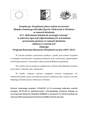 Projekt pn. Urządzenie placu zabaw na terenie Miejsko-Gminnego Gminnego Ośrodka Sportu i Rekreacji w Drobinie w ramach działania 413 „Wdrażanie lokalnych strategii rozwoju” w zakresie operacji odpowiadających warunkom przyznania pomocy w ramach działania „Odnowa i rozwój wsi” objętego Program Rozwoju Obszarów Wiejskich na lata 2007-2013 2007 W ramach projektu wymieniono podłoże z piasku pod montaż urządzeń a następnie zamontowano urządzenia/zabawki przy zachowaniu odpowiednich stref bezpieczeństwa. Teren placu zabaw został dodatkowo ogrodzony. Plac zabaw stał się miejscem wyjątkowym, chętnie odwiedzanym zarówno przez dzieci i młodzież, jak i opiekunów. W wyniku realizacji operacji osiągnięty zostanie następujący cel: Podniesienie jakości życia mieszkańców poprzez urządzenie placu zabaw na terenie Miejskiego Ośrodka Sportu i Rekreacji w Drobinie Wartość założonego projektu: 155.003,87 zł. Po przetargu całkowita wartość projektu: 85.557,60 zł, dofinansowanie z Europejskiego Funduszu Rolnego na rzecz Rozwoju Obszarów Wiejskich EFRROW w wysokości 55.739,00 zł jednak nie więcej niż 80% poniesionych sionych kosztów kwalifikowalnych kwalifikowa operacji.. Plac zabaw na terenie Miejskiego Ośrodka Sportu i Rekreacji w Drobinie Plac zabaw na terenie Miejskiego Ośrodka Sportu i Rekreacji w Drobinie Plac zabaw na terenie Miejskiego Ośrodka Sportu i Rekreacji w Drobinie Plac zabaw na terenie Miejskiego Ośrodka Sportu i Rekreacji w Drobinie