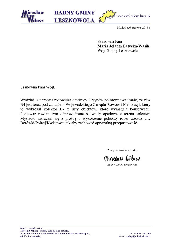 Mysiadło, 6 czerwca 2016 r. Szanowna Pani Maria Jolanta Batycka-Wąsik Wójt Gminy Lesznowola Szanowna Pani Wójt. Wydział Ochrony Środowiska dzielnicy Ursynów poinformował mnie, że rów B4 jest teraz pod zarządem Wojewódzkiego Zarządu Rowów i Melioracji, który to wykreślił kolektor B4 z listy obiektów, które wymagają konserwacji. Ponieważ rowem tym odprowadzane są wody opadowe z terenu sołectwa Mysiadło zwracam się z prośbą o wykoszenie poboczy rowu wzdłuż ulic Borówki/Polnej/Kwiatowej tak aby zachować optymalną przepustowość. Z wyrazami szacunku Radny Gminy Lesznowola