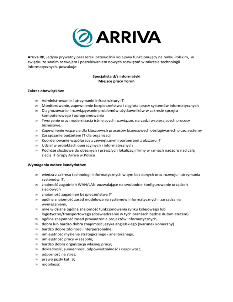 Arriva RP, jedyny prywatny pasażerski przewoźnik kolejowy funkcjonujący na rynku Polskim, w związku ze swoim rozwojem i poszukiwaniem nowych rozwiązań w zakresie technologii informatycznych, poszukuje: Specjalista d/s informatyki Miejsce pracy Toruń Zakres obowiązków: • • • • • • • • • Administrowanie i utrzymanie infrastruktury IT Monitorowanie, zapewnienie bezpieczeństwa i ciągłości pracy systemów informatycznych Diagnozowanie i rozwiązywanie problemów użytkowników w zakresie sprzętu komputerowego i oprogramowania Tworzenie oraz modernizacja istniejących rozwiązań, narzędzi wspierających procesy biznesowe; Zapewnienie wsparcia dla kluczowych procesów biznesowych obsługiwanych przez systemy Zarządzanie budżetem IT dla organizacji Koordynowanie współpracy z zewnętrznymi partnerami z obszaru IT Udział w projektach operacyjnych i informatycznych Podróże służbowe do obecnych i przyszłych lokalizacji firmy w ramach nadzoru nad całą siecią IT Grupy Arriva w Polsce Wymagania wobec kandydatów: • • • • • • • • • • • • • • • wiedza z zakresu technologii informatycznych w tym baz danych oraz rozwoju i utrzymania systemów IT, znajmość zagadnień WAN/LAN pozwalające na swobodne konfigurowanie urządzeń sieciowych znajomość zagadnień bezpieczeństwa IT ogólna znajomość zasad modelowania systemów informatycznych i zarządzania wymaganiami, mile widziana ogólna znajomość funkcjonowania rynku kolejowego lub logistyczno/transportowego (doświadczenie w tych branżach będzie dużym atutem) ogólna znajomość zasad prowadzenia projektów informatycznych, dobra lub bardzo dobra znajomość języka angielskiego (warunek konieczny) bardzo dobre zdolności interpersonalne; umiejętność myślenia strategicznego i analitycznego; umiejętność pracy w zespole; bardzo dobra organizacja własnej pracy; dokładność, sumienność, odpowiedzialność i cierpliwość; odporność na stres; prawo jazdy kat. B; mobilność Oferujemy: • • • • • • • • stabilne zatrudnienie w firmie o ugruntowanej pozycji na rynku, w oparciu o umowę o pracę przyjazne środowisko pracy oraz wsparcie przełożonych możliwość podwyższenia kwalifikacji zawodowych poprzez szkolenia uczciwe wynagrodzenie, pracę w ambitnym zespole, szkolenia tematyczne, możliwość rozwoju zawodowego opiekę medyczną Osoby zainteresowane złożeniem aplikacji proszone są o wysłanie swojego CV oraz listu motywacyjnego na adres mailowy [email protected] z podaniem nazwy stanowiska w tytule maila. Prosimy Kandydatów o zamieszczenie w załączonych dokumentach klauzuli: „Wyrażam zgodę na przetwarzanie moich danych osobowych dla potrzeb niezbędnych dla realizacji procesu rekrutacji, zgodnie z ustawą z dnia 29 sierpnia 1997 roku o ochronie danych osobowych (tekst jedn.: Dz. U. z 2002 r. Nr 101, poz. 926 z późn. zm.)”. Informujemy, że skontaktujemy się z wybranymi kandydatami. Więcej informacji o firmie znajdziecie Państwo na www.arriva.pl