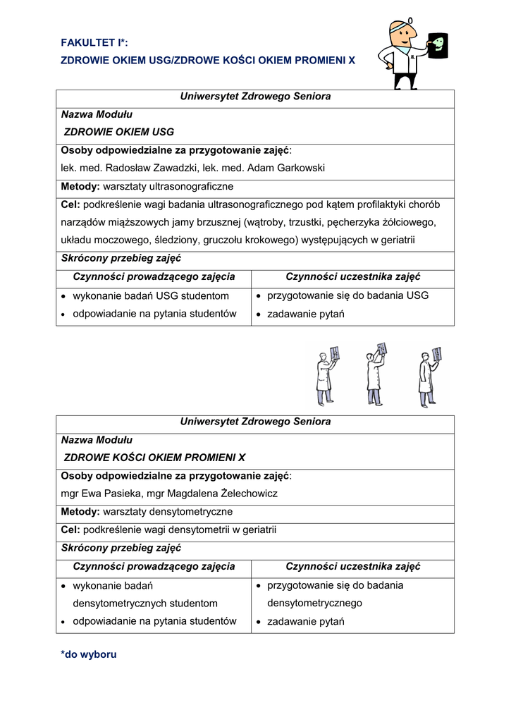 FAKULTET I*: ZDROWIE OKIEM USG/ZDROWE KOŚCI OKIEM PROMIENI X Uniwersytet Zdrowego Seniora Nazwa Modułu ZDROWIE OKIEM USG Osoby odpowiedzialne za przygotowanie zajęć: lek. med. Radosław Zawadzki, lek. med. Adam Garkowski Metody: warsztaty ultrasonograficzne Cel: podkreślenie wagi badania ultrasonograficznego pod kątem profilaktyki chorób narządów miąższowych jamy brzusznej (wątroby, trzustki, pęcherzyka żółciowego, układu moczowego, śledziony, gruczołu krokowego) występujących w geriatrii Skrócony przebieg zajęć Czynności prowadzącego zajęcia wykonanie badań USG studentom odpowiadanie na pytania studentów Czynności uczestnika zajęć przygotowanie się do badania USG zadawanie pytań Uniwersytet Zdrowego Seniora Nazwa Modułu ZDROWE KOŚCI OKIEM PROMIENI X Osoby odpowiedzialne za przygotowanie zajęć: mgr Ewa Pasieka, mgr Magdalena Żelechowicz Metody: warsztaty densytometryczne Cel: podkreślenie wagi densytometrii w geriatrii Skrócony przebieg zajęć Czynności prowadzącego zajęcia wykonanie badań densytometrycznych studentom odpowiadanie na pytania studentów *do wyboru Czynności uczestnika zajęć przygotowanie się do badania densytometrycznego zadawanie pytań