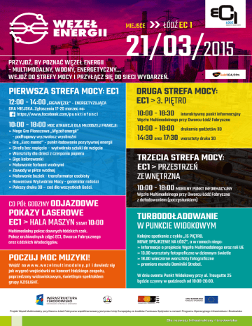 miejsce ŁÓDŹ EC 1 21/03/2015 Przyjdź, by poznać Węzeł Energii - Multimodalny, wodny, energetyczny… Wejdź do strefy mocy i przyłącz się do sieci wydarzeń. pierwsza strefa mocy: ec1 12:00 -14:00 „Gigawęzeł” - energetyzująca gra miejska. Zgłoszenia 17-20 marzec na: https://www.facebook.com/punk tinf oncl 10:00 -18:00 Moc atrakcji dla młodszej frakcji: »»Mega Gra Planszowa „Węzeł energii” - podłogowy wyzwalacz wyobraźni »»Gra „Euro memo” - punkt ładowania pozytywnej energii »»Strefa bez napięcia – wytwórnia sztuki do wzięcia »»Warsztaty dla dzieci z czerpania papieru »»Giga kolorowanki »»Malowanie farbami wodnymi »»Zawody w piłce wodnej »»Malowanie buziek - transformator osobisty »»Rowerowa Wytwórnia Mocy - generator radości »»Pokazy druku 3D – coś dla wszystkich Gości. co pół godziny odjazdowe pokazy laserowe ec1 > hala maszyn start 10:00 Multimedialny pokaz dawnych łódzkich rzek. Pokaz archiwalnych zdjęć EC1, Dworca Fabrycznego oraz Łódzkich Wodociągów. poczuj moc muzyki! Wejdź na w w w.we zelmultimodalny.pl i dowiedz się jak wygrać wejściówki na koncert łódzkiego zespołu, poprzedzony widowiskowym, świetlnym spektaklem grupy Azislight. druga strefa mocy: ec1 > 3. piętro 10:00 -18:30 interaktywny punkt informacyjny Węzła Multimodalnego przy Dworcu Łódź Fabryczna 10:00 -18:00 drukarnia gadżetów 3D 14:30 oraz17:30 warsztaty druku 3D trzecia strefa mocy: ec1 > przestrzeń zewnętrzna 10:00 -18:00 mobilny punkt informacyjny Węzła Multimodalnego przy Dworcu Łódź Fabryczna z doładowaniem (poczęstunkiem) turbodoładowanie w punkcie widokowym Kolejne spotkanie z cyklu „15 piętro. Nowe spojrzenie na Łódź”, a w ramach niego: »»Informacje o projekcie Węzła Multimodalnego oraz roli UE »»13.00 warsztaty fotograficzne w dziennym świetle »»18.00 wieczorne warsztaty fotograficzne »»premiera muralu Dominiki Strobel. W dniu eventu Punkt Widokowy przy ul. Traugutta 25 będzie czynny w godzinach od 10:00-20:00. Projekt Węzeł Multimodalny przy Dworcu Łódź Fabryczna współfinansowany jest przez Unię Europejską ze środków Funduszu Spójności w ramach Programu Operacyjnego Infrastruktura i Środowisko