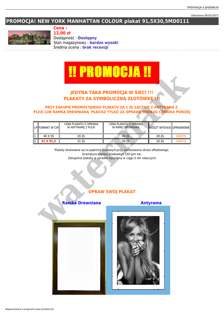 Informacje o produkcie Utworzono 08-03-2017 PROMOCJA! NEW YORK MANHATTAN COLOUR plakat 91,5X30,5MD0111 Cena : 12,00 zł er m ar k Dostępność : Dostępny Stan magazynowy : bardzo wysoki Średnia ocena : brak recenzji JEDYNA TAKA PROMOCJA W SIECI !!! PLAKATY ZA SYMBOLICZNĄ ZŁOTÓWKĘ !!! PRZY ZAKUPIE PROMOCYJNEGO PLAKATU ZA 1 ZŁ ŁĄCZNIE Z ANTYRAMĄ Z PLEXI LUB RAMKĄ DREWNIANĄ PŁACISZ TYLKO ZA OPRAWĘ WEDŁUG CENNIKA PONIŻEJ LP FORMAT W CM 1 40 X 50 2 61 X 91,5 CENA PLAKATU Z OPRAWĄ W ANTYRAMĘ Z PLEXI CENA PLAKATU Z OPRAWĄ W RAMĘ DREWNIANĄ 20 ZŁ 40 ZŁ 20 ZŁ GRATIS 31 ZŁ 50 ZŁ 20 ZŁ GRATIS KOSZT WYSYŁKI OPRAWIENIE at Plakaty drukowane są na papierze kredowym,przy zastosowaniu druku offsetowego. Gramatura papieru kredowego 150 g/m kw. Zakupione plakaty w oprawie wysyłamy w ciągu 5 dni roboczych OPRAW SWÓJ PLAKAT w Ramka Drewniana Wygenerowano w programie www.oscGold.com Antyrama ZOBACZ RÓWNIEŻ RAMY DREWNIANE er m ar k ANTYRAMY w at TABLICE KORKOWE PLAKATY