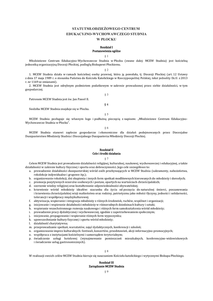 STATUTMŁODZIEŻOWEGO CENTRUM EDUKACYJNO-WYCHOWAWCZEGO STUDNIA W PŁOCKU Rozdział I Postanowienia ogólne §1 Młodzieżowe Centrum Edukacyjno-Wychowawcze Studnia w Płocku (zwane dalej: MCEW Studnia) jest kościelną jednostką organizacyjną Diecezji Płockiej, podległą Biskupowi Płockiemu. §2 1. MCEW Studnia działa w ramach kościelnej osoby prawnej, która ją powołała, tj. Diecezji Płockiej (art. 12 Ustawy z dnia 17 maja 1989 r. o stosunku Państwa do Kościoła Katolickiego w Rzeczypospolitej Polskiej, tekst jednolity Dz.U. z 2013 r. nr 1169 ze zmianami). 2. MCEW Studnia jest odrębnym podmiotem podatkowym w zakresie prowadzonej przez siebie działalności, w tym gospodarczej. §3 Patronem MCEW Studnia jest św. Jan Paweł II. §4 Siedziba MCEW Studnia znajduje się w Płocku. §5 MCEW Studnia posługuje się własnym logo i podłużną pieczęcią z napisem: „Młodzieżowe Centrum EdukacyjnoWychowawcze Studnia w Płocku”. §6 MCEW Studnia stanowi zaplecze gospodarcze i ekonomiczne dla działań podejmowanych przez Diecezjalne Duszpasterstwo Młodzieży Studnia i Diecezjalnego Duszpasterza Młodzieży Diecezji Płockiej. Rozdział II Cele i środki działania §7 Celem MCEW Studnia jest prowadzenie działalności religijnej, kulturalnej, naukowej, wychowawczej i edukacyjnej, a także działalności w zakresie kultury fizycznej i sportu oraz dobroczynności. Jego cele szczegółowe to: a. prowadzenie działalności duszpasterskiej wśród osób przebywających w MCEW Studnia (sakramenty, nabożeństwa, rekolekcje indywidualne i grupowe itp.); b. organizowanie rekolekcji, dni skupienia i innych form spotkań modlitewnych kierowanych do młodzieży i dorosłych; c. promocja pozytywnych wzorców osobowych i postaw, opartych na wartościach chrześcijańskich; d. szerzenie wiedzy religijnej oraz kształtowanie odpowiedzialności obywatelskiej; e. krzewienie wśród młodzieży ideałów: szacunku dla życia od poczęcia do naturalnej śmierci, poszanowania i krzewienia chrześcijańskiej wizji małżeństwa oraz rodziny, patriotyzmu jako miłości Ojczyny, jedności i solidarności, tolerancji i współpracy międzykulturowej; f. aktywizacja, wspieranie i integracja młodzieży z różnych środowisk, ruchów, wspólnot i organizacji; g. inicjowanie i wspieranie działalności młodzieży w różnorodnych dziedzinach kultury i sztuki; h. wspieranie wszechstronnego rozwoju naukowego i różnych form samokształcenia wśród młodzieży; i. prowadzenie pracy dydaktycznej i wychowawczej, zgodnie z zapotrzebowaniem społecznym; j. inicjowanie, propagowanie i wspieranie różnych form wypoczynku; k. upowszechnianie kultury fizycznej i sportu wśród młodzieży; l. działalność charytatywna; m. przeprowadzanie spotkań, warsztatów, zajęć dydaktycznych, konferencji i szkoleń; n. organizowanie imprez kulturalnych: festiwali, koncertów, przedstawień, akcji informacyjno-promocyjnych; o. współpraca z instytucjami kościelnymi i samorządem terytorialnym; p. świadczenie usługi hotelowej (wynajmowanie pomieszczeń mieszkalnych, konferencyjno-widowiskowych i świadczenie usług gastronomicznych). §8 W realizacji swoich celów MCEW Studnia kieruje się nauczaniem Kościoła katolickiego i wytycznymi Biskupa Płockiego. Rozdział III Zarządzanie MCEW Studnia §9 Zwierzchnią władzę nad MCEW Studnia we wszystkich sprawach ma Biskup Płocki. § 10 W imieniu Biskupa Płockiego MCEW Studnia zarządza Dyrektor Młodzieżowego Centrum Edukacyjno-Wychowawczego Studnia. § 11 Dyrektora MCEW Studnia powołuje i odwołuje Biskup Płocki. Rozdział IV Dyrektor § 12 Dyrektor jest bezpośrednim zarządcą MCEW Studnia. Odpowiada za funkcjonowanie MCEW Studnia we wszystkich wymiarach i płaszczyznach działalności. § 13 Dyrektor reprezentuje MCEW Studnia na zewnątrz, w szczególności wobec organów administracji rządowej i samorządowej. Dyrektor upoważniony jest do udzielania pełnomocnictw w granicach swojej kompetencji. § 14 Dyrektor ustala Regulamin MCEW Studnia, w którym określa zakres działań i sposób funkcjonowania MCEW Studnia oraz zakres obowiązków pracowników MCEW Studnia. Rozdział V Pracownicy § 15 Dyrektor zatrudnia odpowiednią liczbę pracowników, w celu zagwarantowania właściwego funkcjonowania MCEW Studnia. § 16 Funkcje i zakres obowiązków pracowników określa Regulamin MCEW Studnia. § 17 Pracownicy zatrudnieni w MCEW Studnia zobligowani są do przestrzegania chrześcijańskich norm postępowania, zarówno w życiu prywatnym, jak i zawodowym oraz nieustannej pracy nad pogłębianiem swojej wiary i dawania świadectwa Ewangelii Chrystusowej. Rozdział VI Sprawy gospodarcze i administracyjne § 18 MCEW Studnia może prowadzić działalność gospodarczą i uzyskiwać fundusze z darowizn, subwencji i dotacji, spadków, zapisów, ofiarności publicznej, dochodów ze zbiórek i imprez publicznych oraz sponsoringu, grantów, funduszy celowych i dochodów z odsetek bankowych. § 19 Dochody, uzyskiwane z działalności MCEW Studnia przeznacza się na działalność zgodną z celami statutowymi oraz na Diecezjalne Duszpasterstwo Młodzieży Studnia. § 20 MCEW Studnia nie może być obarczane jakimikolwiek obowiązkami o charakterze stałym, związanymi z nieodpłatnym świadczeniem usług na rzecz kościelnych i innych jednostek organizacyjnych. § 21 Dyrektor MCEW Studnia przedkłada w pierwszej połowie roku Biskupowi Płockiemu sprawozdanie z rocznej działalności MCEW Studnia. Rozdział VII Postanowienia końcowe § 22 Wszelkie zmiany w statucie MCEW Studnia zatwierdza Biskup Płocki.