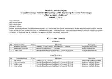Protokół z posiedzenia jury XI Ogólnopolskiego Konkursu Plastycznego (XVIII Rejonowego Konkursu Plastycznego) „Moje spotkanie z folklorem” dnia 09.12.2014r. Jury w składzie: mgr Joanna Nowara mgr Anna Miguła mgr Marek Matuła oceniło poziom tegorocznej edycji jako bardzo wysoki. Jury zostało mile zaskoczone zastosowanymi technikami plastycznymi spośród, których wybór najlepszych prac był bardzo trudny. Z 380 nadesłanych prac z różnych placówek kulturalnych i oświatowych naszego kraju jury przyznało 15 nagród, 19 wyróżnień oraz 47 kwalifikacji do wystawy w pięciu kategoriach wiekowych. KATEGORIA I (4-6 lat) NAGRODY Lp. 1. 2. 3. Nazwisko i imię Winnicka Weronika Rutkowska Weronika Ciupek Piotr Wiek 6 6 6 Placówka Fundacja Kultury i Sportu „Prawobrzeże” - Szczecin Gminne Przedszkole nr2 - Trzcianka Ognisko Pracy Pozaszkolnej Zespół „Przygoda”- Rybnik Nauczyciel Małgorzata Wrzosińska Bożena Pieńkowska Krystyna Komorowska WYRÓŻNIENIA Lp. 1. 2. 3. 4. Nazwisko i imię Bąk Marta Otremba Amelia Majka Agata Ożóg Nikola Wiek 6 6 5 6 Placówka Studio mARTa - Gliwice Ognisko Pracy Pozaszkolnej Zespół „Przygoda”- Rybnik Ognisko Pracy Pozaszkolnej Zespół „Przygoda”- Rybnik Ognisko Pracy Pozaszkolnej Zespół „Przygoda”- Rybnik Nauczyciel Marta Zajączyńska-Kowalska Katarzyna Michalik-Kiszka Katarzyna Michalik-Kiszka Katarzyna Michalik-Kiszka KWALIFIKACJE DO WYSTAWY Lp. 1. 2. 3. 4. 5. 6. 7. 8. Nazwisko i imię Grygier Emma Kieś Nina Szyman Bartosz Kopec Nikola Dyrda Hanna Świsulska Oliwia Adamik Amelia Leonarska Maria Wiek 4 5 6 6 6 6 5 6 Placówka Fundacja Kultury i Sportu „Prawobrzeże”- Szczecin Zespół Szkolno-Przedszkolny nr5 Przedszkole nr5- Rybnik Miejski Ośrodek Kultury-Czerwionka-Leszyny Zespół Szkolno-Przedszkolny nr11- Rybnik Zespół Szkolno-Przedszkolny nr11- Rybnik Ognisko Pracy Pozaszkolnej Zespół „Przygoda”- Rybnik Ognisko Pracy Pozaszkolnej Zespół „Przygoda”- Rybnik Ognisko Pracy Pozaszkolnej Zespół „Przygoda”- Rybnik Nauczyciel Małgorzata Wrzosińska Ewa Jaszek Ewa Bartoszek Katarzyna Michalik-Kiszka Katarzyna Michalik-Kiszka Krystyna Komorowska Krystyna Komorowska Krystyna Komorowska KATEGORIA II (7-9 lat) NAGRODY Lp. Nazwisko i imię 1. Adamczyk Oliwia 2. Binkowska Karolina 3. Jagieło Kuba Wiek 9 8 9 Placówka Nauczyciel Powiatowe Ognisko Pracy Pozaszkolnej - Czerwonka-Leszczyny Krystyna Sienkan-Krząkała Fundacja Kultury i Sportu „Prawobrzeże” - Szczecin Małgorzata Wrzosińska Młodzieżowy Dom Kultury Pracownia Plastyczna „Kameleon”-Rybnik Danuta Sarna WYRÓŻNIENIA Lp. 1. 2. 3. 4. 5. Nazwisko i imię Otto Antonina Zawiślak Eliza Pancerz Karol Kozub Aleksandra Bodys Wojciech Wiek 7 9 8 9 9 Placówka Ognisko Pracy Pozaszkolnej Zespół „Przygoda”- Rybnik Fundacja Kultury i Sportu „Prawobrzeże” - Szczecin Młodzieżowy Dom Kultury - Gorlice Młodzieżowy Dom Kultury - Gorlice Zespół Szkół nr4 – Czerwionka-Leszczyny Nauczyciel Krystyna Komorowska Małgorzata Wrzosińska Wojciech Haberek Danuta Słyś-Tohl Krystyna Sienkan-Krząkała KWALIFIKACJE DO WYSTAWY Lp. 1. 2. 3. 4. 5. 6. 7. 8. 9. 10. Borkowska Zuzanna Postolski Kuba Girer Alicja Girer Izabela Wasilewska Maja Kot Magdalena Nawrocka Konstancja Sekta Martyna Łątka Teresa Klaja Karolina 11. 12. 13. 14. 15. 16. 17. 18. 19. Bała Amelia Konopka Maja Siatka Anna Bienek Marcelina Maciejczyk Alicja Majka Anna Mol Małgorzata Biernacka Alicja Mitura Jagoda Wiek 9 8 7 7 8 8 9 8 8 9 8 9 7 9 9 9 8 7 7 Placówka Młodzieżowy Dom Kultury im. Króla Maciusia Pierwszego - Płock Młodzieżowy Dom Kultury im. Króla Maciusia Pierwszego - Płock Fundacja Kultury i Sportu „Prawobrzeże” - Szczecin Fundacja Kultury i Sportu „Prawobrzeże” - Szczecin Fundacja Kultury i Sportu „Prawobrzeże” - Szczecin Fundacja Kultury i Sportu „Prawobrzeże” - Szczecin Młodzieżowy Dom Kultury Pracownia Plastyczna „Kameleon”-Rybnik Młodzieżowy Dom Kultury Pracownia Plastyczna „Kameleon”-Rybnik Młodzieżowy Dom Kultury Pracownia Plastyczna „GiR-a”-Rybnik Zespół Edukacyjno-Terapeutyczny w Zespole Szkół Specjalnych im. Matki Teresy z Kalkuty - Żory Ognisko Pracy Pozaszkolnej Zespół „Przygoda”- Rybnik Ognisko Pracy Pozaszkolnej Zespół „Przygoda”- Rybnik Ognisko Pracy Pozaszkolnej Zespół „Przygoda”- Rybnik Ognisko Pracy Pozaszkolnej Zespół „Przygoda”- Rybnik Ognisko Pracy Pozaszkolnej Zespół „Przygoda”- Rybnik Ognisko Pracy Pozaszkolnej Zespół „Przygoda”- Rybnik Ognisko Pracy Pozaszkolnej Zespół „Przygoda”- Rybnik Galeria Sztuki „Złote Grabie”- Rydułtowy Miejski Ośrodek Kultury-Czerwionka-Leszczyny Nauczyciel Małgorzata Ćwiklińska Małgorzata Ćwiklińska Małgorzata Wrzosińska Małgorzata Wrzosińska Małgorzata Wrzosińska Małgorzata Wrzosińska Danuta Sarna Danuta Sarna Milada Więckowska Hanna Lepiarczyk Krystyna Komorowska Krystyna Komorowska Katarzyna Michalik-Kiszka Katarzyna Michalik-Kiszka Katarzyna Michalik-Kiszka Katarzyna Michalik-Kiszka Katarzyna Michalik-Kiszka Magdalena Bentkowska Krystyna Sienkan-Krząkała KATEGORIA III (10-12 lat) NAGRODY Lp. 1. Glodny Maria 2. Kruk Kamil Wiek 10 10 Placówka Młodzieżowy Dom Kultury Pracownia Plastyczna „Creatio”-Rybnik Ognisko Pracy Pozaszkolnej Zespół „Przygoda”- Rybnik Aldona Kaczmarczyk-Kołucka Katarzyna Michalik-Kiszka 3. Siatka Iga 10 Ognisko Pracy Pozaszkolnej Zespół „Przygoda”- Rybnik Katarzyna Michalik-Kiszka WYRÓŻNIENIA Lp. 1. 2. 3. 4. Nazwisko i imię Maciejczyk Alicja Knapik Jakub Grajewska Oliwia Zielonka Kacper Wiek 12 12 11 10 Placówka Młodzieżowy Dom Kultury - Gorlice Młodzieżowy Dom Kultury – Gorlice Młodzieżowy Dom Kultury – Gorlice Ognisko Pracy Pozaszkolnej Zespół „Przygoda”- Rybnik Danuta Słyś-Tohl Grzegorz Karpiński Grzegorz Karpiński Katarzyna Michalik-Kiszka KWALIFIKACJE DO WYSTAWY Lp. Nazwisko i imię 1. Kotas Emilia 2. 3. 4. 5. 6. 7. 8. 9. 
