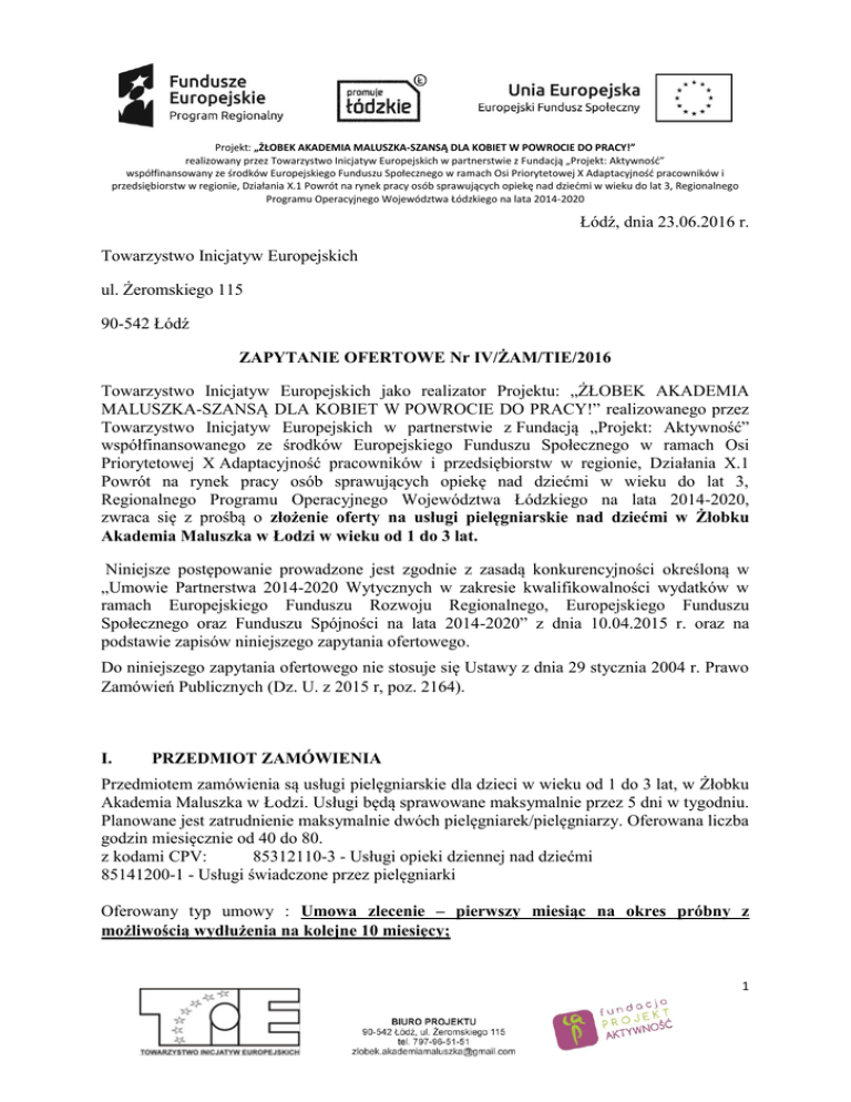 Projekt: „ŻŁOBEK AKADEMIA MALUSZKA-SZANSĄ DLA KOBIET W POWROCIE DO PRACY!” realizowany przez Towarzystwo Inicjatyw Europejskich w partnerstwie z Fundacją „Projekt: Aktywność” współfinansowany ze środków Europejskiego Funduszu Społecznego w ramach Osi Priorytetowej X Adaptacyjność pracowników i przedsiębiorstw w regionie, Działania X.1 Powrót na rynek pracy osób sprawujących opiekę nad dziećmi w wieku do lat 3, Regionalnego Programu Operacyjnego Województwa Łódzkiego na lata 2014-2020 Łódź, dnia 23.06.2016 r. Towarzystwo Inicjatyw Europejskich ul. Żeromskiego 115 90-542 Łódź ZAPYTANIE OFERTOWE Nr IV/ŻAM/TIE/2016 Towarzystwo Inicjatyw Europejskich jako realizator Projektu: „ŻŁOBEK AKADEMIA MALUSZKA-SZANSĄ DLA KOBIET W POWROCIE DO PRACY!” realizowanego przez Towarzystwo Inicjatyw Europejskich w partnerstwie z Fundacją „Projekt: Aktywność” współfinansowanego ze środków Europejskiego Funduszu Społecznego w ramach Osi Priorytetowej X Adaptacyjność pracowników i przedsiębiorstw w regionie, Działania X.1 Powrót na rynek pracy osób sprawujących opiekę nad dziećmi w wieku do lat 3, Regionalnego Programu Operacyjnego Województwa Łódzkiego na lata 2014-2020, zwraca się z prośbą o złożenie oferty na usługi pielęgniarskie nad dziećmi w Żłobku Akademia Maluszka w Łodzi w wieku od 1 do 3 lat. Niniejsze postępowanie prowadzone jest zgodnie z zasadą konkurencyjności określoną w „Umowie Partnerstwa 2014-2020 Wytycznych w zakresie kwalifikowalności wydatków w ramach Europejskiego Funduszu Rozwoju Regionalnego, Europejskiego Funduszu Społecznego oraz Funduszu Spójności na lata 2014-2020” z dnia 10.04.2015 r. oraz na podstawie zapisów niniejszego zapytania ofertowego. Do niniejszego zapytania ofertowego nie stosuje się Ustawy z dnia 29 stycznia 2004 r. Prawo Zamówień Publicznych (Dz. U. z 2015 r, poz. 2164). I. PRZEDMIOT ZAMÓWIENIA Przedmiotem zamówienia są usługi pielęgniarskie dla dzieci w wieku od 1 do 3 lat, w Żłobku Akademia Maluszka w Łodzi. Usługi będą sprawowane maksymalnie przez 5 dni w tygodniu. Planowane jest zatrudnienie maksymalnie dwóch pielęgniarek/pielęgniarzy. Oferowana liczba godzin miesięcznie od 40 do 80. z kodami CPV: 85312110-3 - Usługi opieki dziennej nad dziećmi 85141200-1 - Usługi świadczone przez pielęgniarki Oferowany typ umowy : Umowa zlecenie – pierwszy miesiąc na okres próbny z możliwością wydłużenia na kolejne 10 miesięcy; 1 Projekt: „ŻŁOBEK AKADEMIA MALUSZKA-SZANSĄ DLA KOBIET W POWROCIE DO PRACY!” realizowany przez Towarzystwo Inicjatyw Europejskich w partnerstwie z Fundacją „Projekt: Aktywność” współfinansowany ze środków Europejskiego Funduszu Społecznego w ramach Osi Priorytetowej X Adaptacyjność pracowników i przedsiębiorstw w regionie, Działania X.1 Powrót na rynek pracy osób sprawujących opiekę nad dziećmi w wieku do lat 3, Regionalnego Programu Operacyjnego Województwa Łódzkiego na lata 2014-2020 II. WARUNKI UDZIAŁU W POSTĘPOWANIU Kryteria obligatoryjne: 1. Wykształcenie wyższe kierunkowe –pielęgniarka dyplomowana; 2. Zgodnie z ustawą o zawodach pielęgniarki i położnej zawód pielęgniarki i położnej może wykonywać osoba posiadająca prawo wykonywania zawodu stwierdzone albo przyznane przez właściwą okręgową radę pielęgniarek i położnych doświadczanie oraz umiejętności i wiedza niezbędna do wykonania zamówienia; 3. Zachowanie tajemnicy służbowej oraz przestrzegania ustawy o ochronie danych osobowych zgodnie z Ustawą z dn. 29 sierpnia 1997 o ochronie danych osobowych, 4. Daje rękojmie prawidłowego i sumiennego wykonania zamówienia, 5. Elastyczność czasowa, zrozumienie dla zasady poufności i odpowiedni dress code brak nałogów, 6. Posiadanie aktualnej książeczki z badaniami sanitarno-epidemiologicznymi (praca z dziećmi, praca w zakładzie zbiorowego żywienia). Ponadto zamówienie może być udzielone osobie, która: 7. nie jest i nie była pozbawiona władzy rodzicielskiej oraz władza rodzicielska nie jest jej ograniczona ani zawieszona; 8. wypełnia obowiązek alimentacyjny – w przypadku gdy taki obowiązek w stosunku do niej wynika z tytułu egzekucyjnego; 9. nie była skazana prawomocnym wyrokiem za umyślne przestępstwo lub umyślne przestępstwo skarbowe; 10. osobie, której łączne zaangażowanie zawodowe w realizację wszystkich projektów finansowanych z funduszy strukturalnych i Funduszu Spójności oraz działań finansowanych z innych źródeł, w tym środków własnych beneficjenta i innych podmiotów, nie przekracza 276 godzin miesięcznie. 11. odbędzie bezpośrednią rozmowę (z wynikiem pozytywnym) z Zamawiającym w celu potwierdzenia jej predyspozycji o których mowa w rozdz. II niniejszego Zapytania. OCZEKIWANIA: bardzo dobry kontakt z dziećmi; sumienność i rzetelność w realizacji powierzonych zadań; umiejętność dobrej organizacji pracy; dyspozycyjność, terminowość, dokładność, odpowiedzialność; umiejętność pracy w grupie. 2 Projekt: „ŻŁOBEK AKADEMIA MALUSZKA-SZANSĄ DLA KOBIET W POWROCIE DO PRACY!” realizowany przez Towarzystwo Inicjatyw Europejskich w partnerstwie z Fundacją „Projekt: Aktywność” współfinansowany ze środków Europejskiego Funduszu Społecznego w ramach Osi Priorytetowej X Adaptacyjność pracowników i przedsiębiorstw w regionie, Działania X.1 Powrót na rynek pracy osób sprawujących opiekę nad dziećmi w wieku do lat 3, Regionalnego Programu Operacyjnego Województwa Łódzkiego na lata 2014-2020 III.ZAKRES OBOWIĄZKÓW: Do obowiązków pielęgniarki/pielęgniarza w Żłobku Akademia Maluszka należeć będzie: Organizacja i oddziaływanie na prawidłową realizację zadań z zakresu profilaktyki i promocji zdrowia. Bieżące monitorowanie stanu zdrowia i skóry Dzieci. Nadzór nad stanem sanitarno – epidemiologicznym Żłobka. Zapewnienie Dzieciom opieki w warunkach bytowych zbliżony